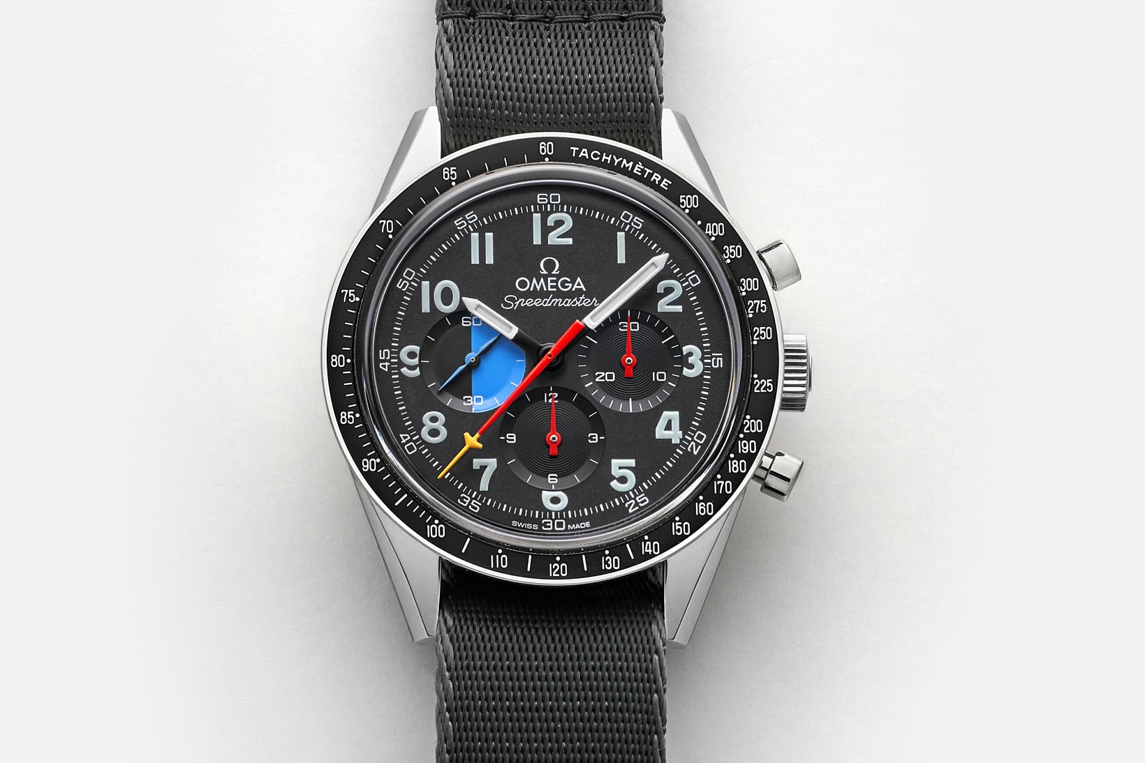 そう、これは我々が手がけたスピードマスターの限定モデルだ。通常、我々が手がけた時計について言及することは避けているが、アラスカプロジェクトに代わるよりリーズナブルな選択肢となると、HODINKEE 10周年のスピーディが素晴らしい選択肢となる。アラスカプロジェクトの約半額の価格で取引されているが、60年代、70年代のオメガのツールウォッチの美学を受け継いでいる。当時のオメガのツールウォッチはまるでミレニアム・ファルコンのコックピットから飛び出してきたかのようだ。このスピーディは、60年代、70年代のフライトマスターの9時位置のインダイヤルに似た2色のインダイヤルを備えている。また、クロノグラフの針にも色が使われている。この時計にはアラスカプロジェクトのプロトタイプと同時代に登場したデザイン要素が盛り込まれているのだ。70年代のオメガのツールウォッチのような独特のデザインをお求めの方は、HODINKEE 10周年のスピーディは検討する価値があるだろう。