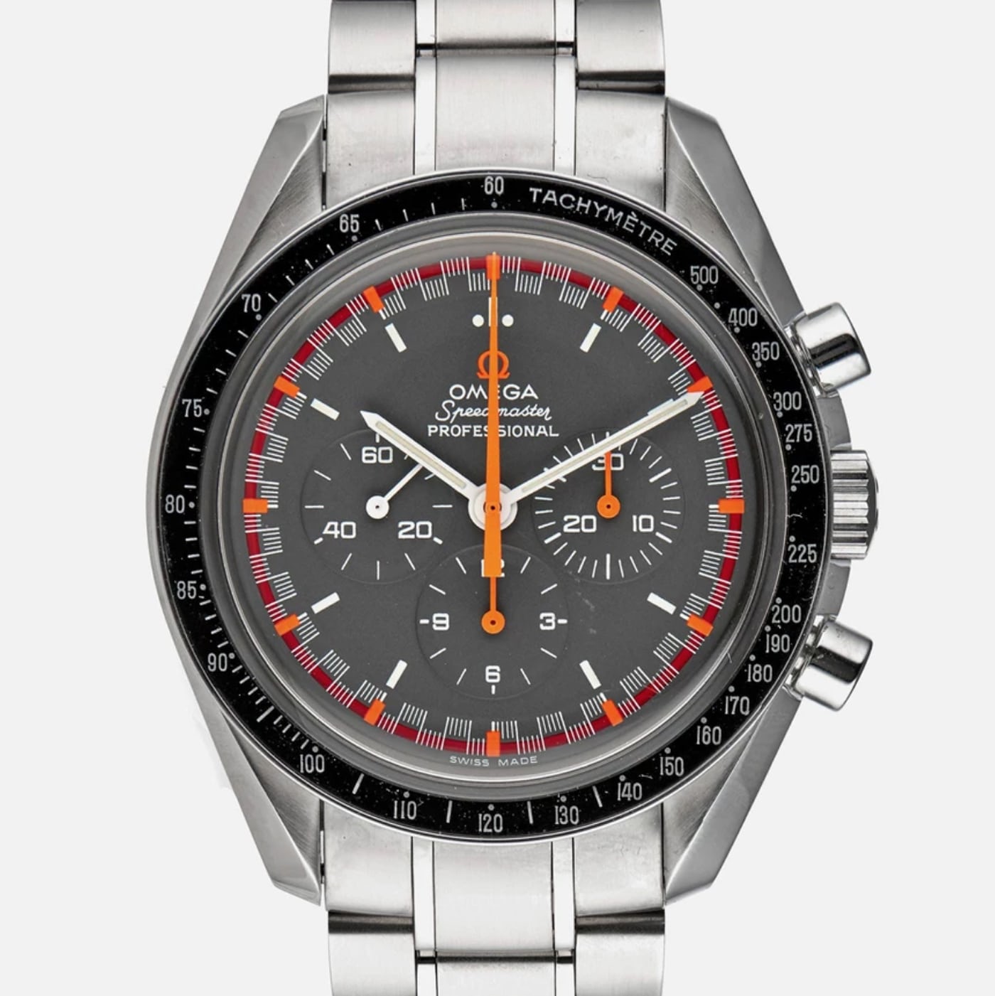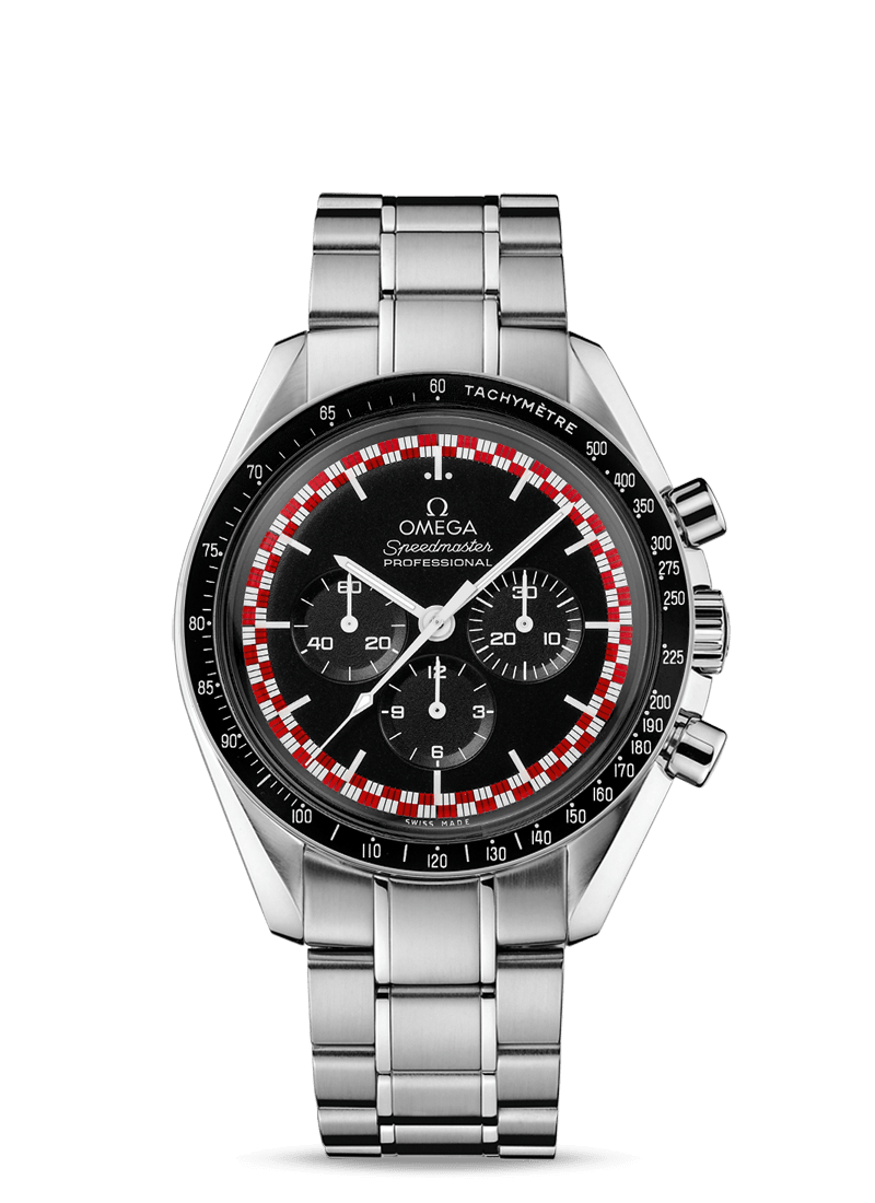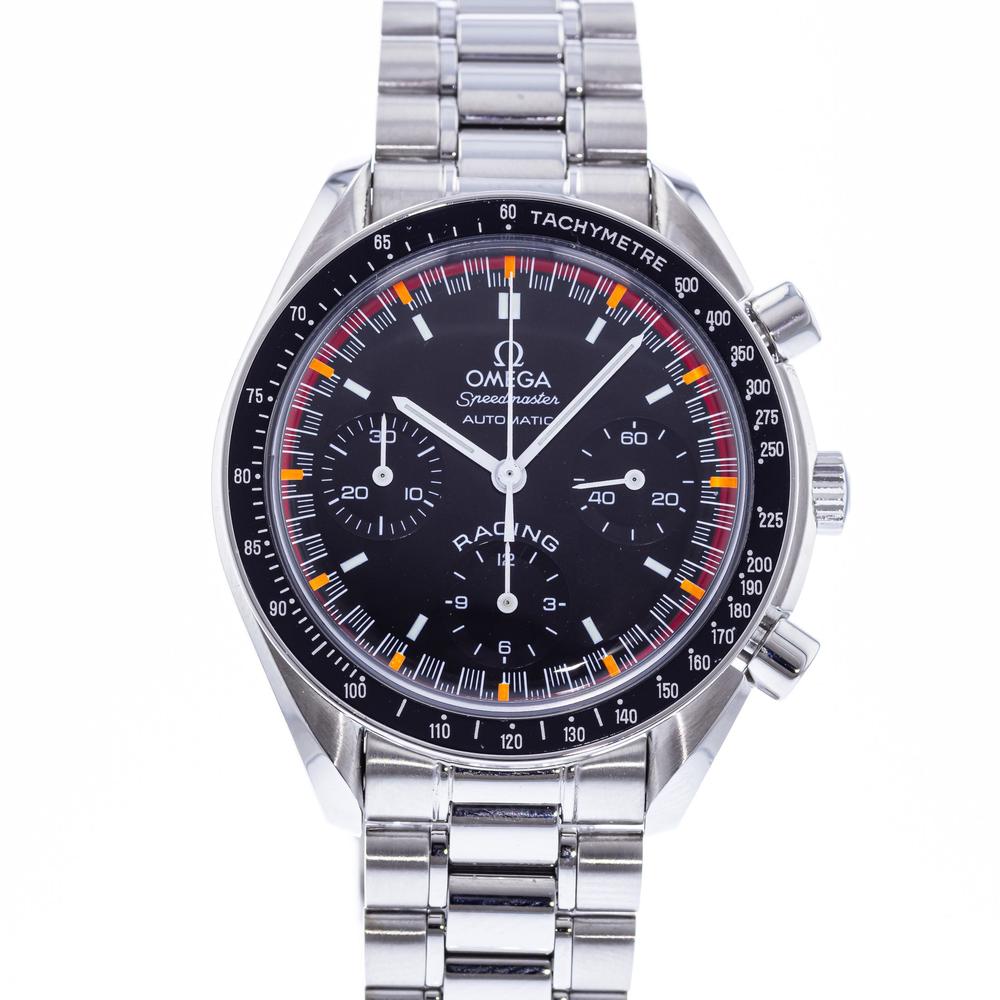スピードマスター リデュースは、コレクターの間ではあまり人気がなかった。その理由は修理代が高いことと歴代ムーン・スピーディの最大の特徴が自動巻きではないことにある。しかし、どうしてもレーシングダイヤルが欲しいという方には、このモデルがおすすめだ。2010年に6000本限定で発売されたこのモデルには、人気モデルと同じレーシングトラックが採用されている。6時位置のインダイヤルの上にも“Racing ”と書かれており、レースとシューマッハの関係をより強調している。このモデルはCrown&Caliberでも販売しているが、そうでなくても私はこのモデルを選ぶだろう。