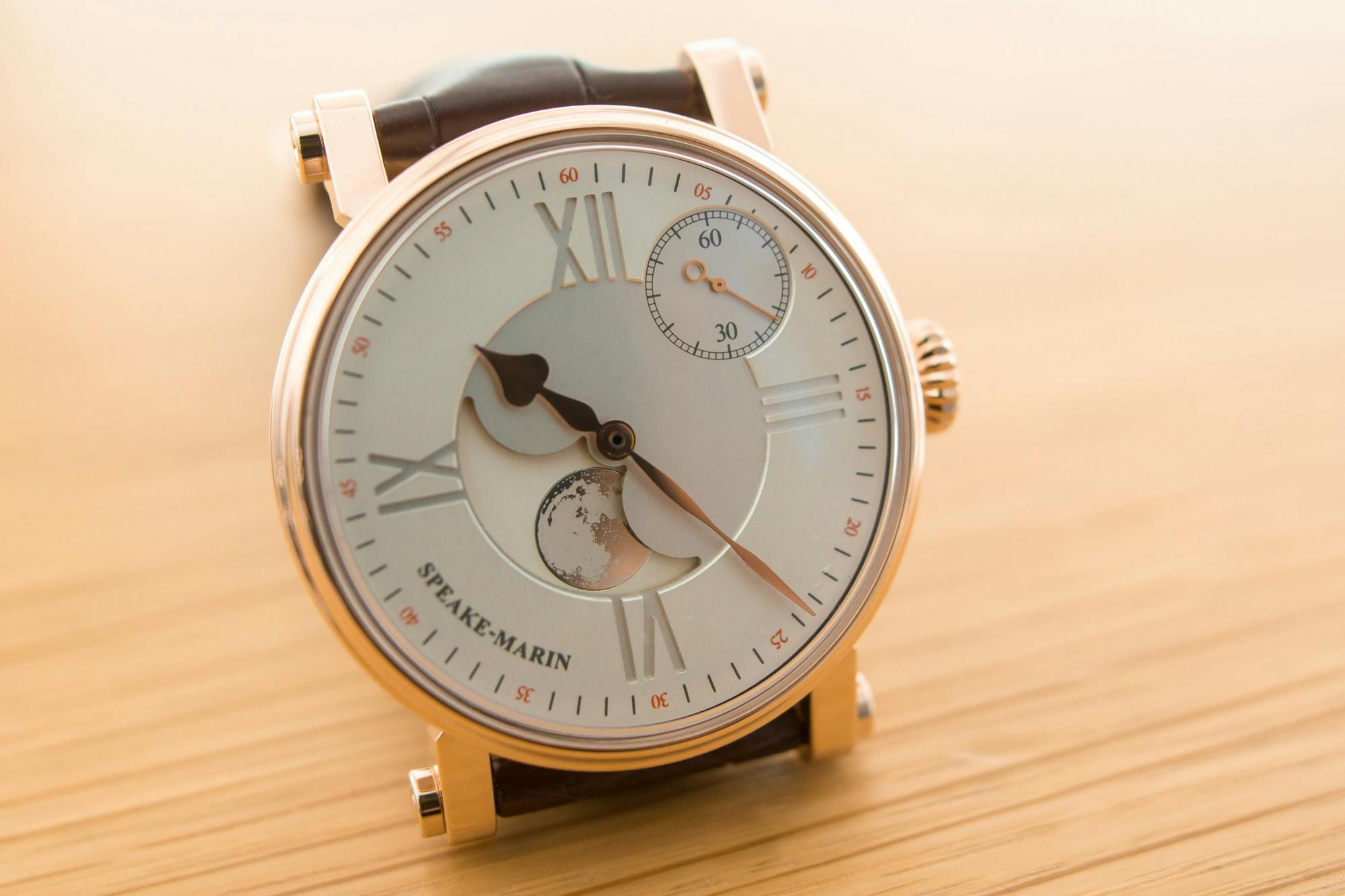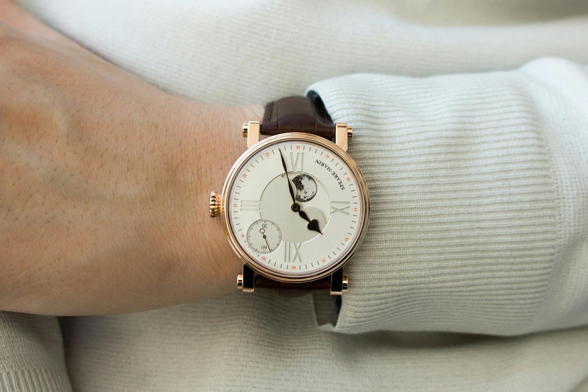 文字盤は、シルバーがかった白文字盤で、大きなムーンフェイズ窓からは、リアルな描写の月を眺めることができます。月の素材は真鍮をベースとしており、そこに月の模様をエングレーブしています。表面は丁寧に磨かれ、最終仕上げとしてロジウムコーティングしています。本モデルのムーンフェイズディスクは、シルバーとオレンジの二種類の月が備えられており、オレンジの月は、さらにピンクゴールドのレイヤーを重ねることで表現。現実世界でも、月が赤やオレンジ色に輝くのを見られますが、これは月が地平線近くにある時に大気の影響を受けるため。2色の月を交互に現すスピーク・マリンらしい芸術的解釈と所有者を楽しませる遊び心を垣間見ることができます。針は、スピーク・マリンお馴染みのハート型の時針とホイップされたような波打った形の分針が採用されています。