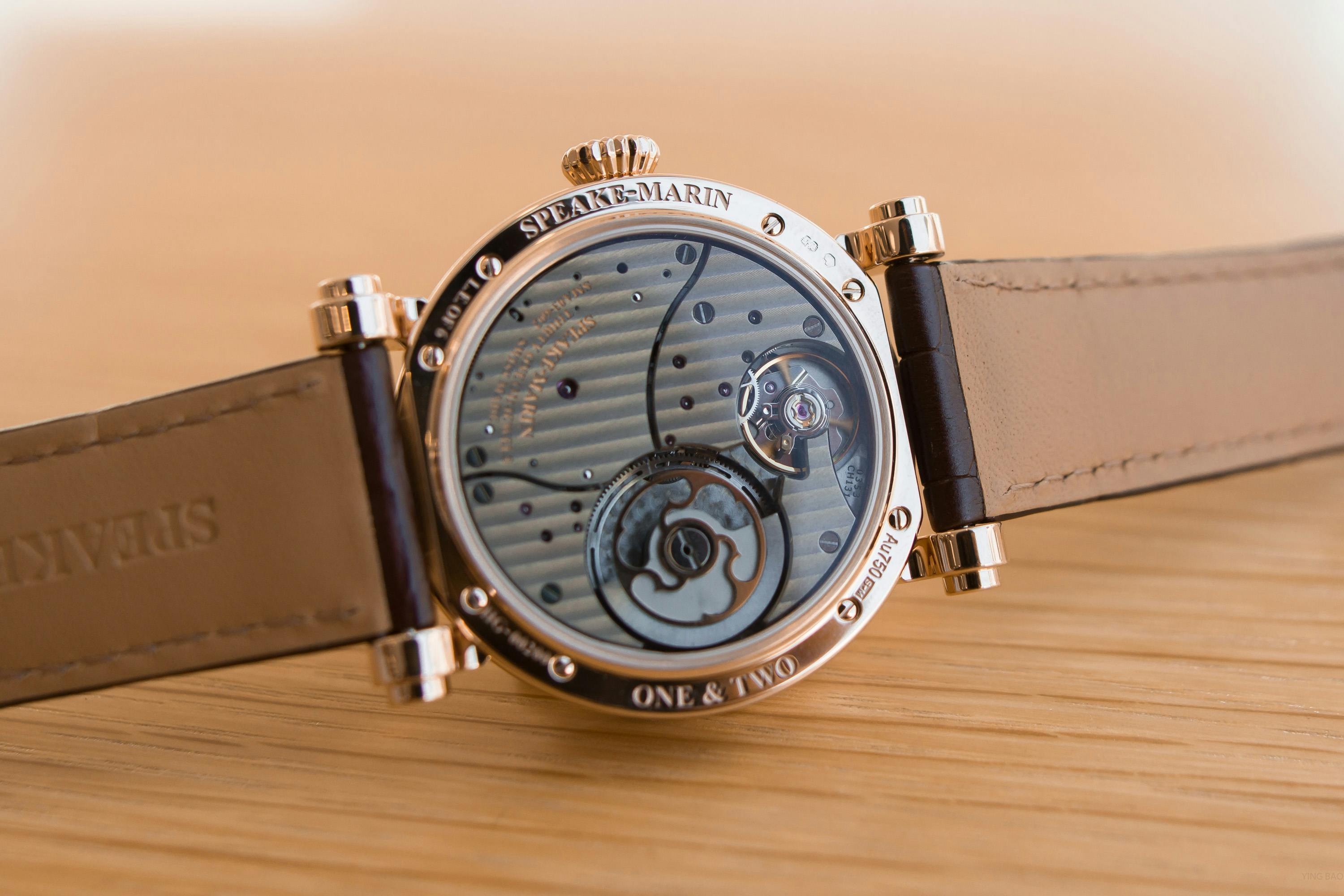 スピーク・マリンは、イギリス出身のピーター・スピーク・マリン氏が、アンティークの修復やルノー・エ・パピ社を経て、2002年に立ち上げた独立系時計ブランドです。ところが、2017年に創業者のピーター氏がブランドを去ったことで岐路に立たされ、英国調のピカデリーケースやハート型の針といったこれまでのデザインコードは維持しつつ、自社ムーブメントの開発に力を入れ始めます。そして翌2018年に誕生したのが、モデルを内包する現在最も注力するコレクションのひとつである『ワン&ツー』です。