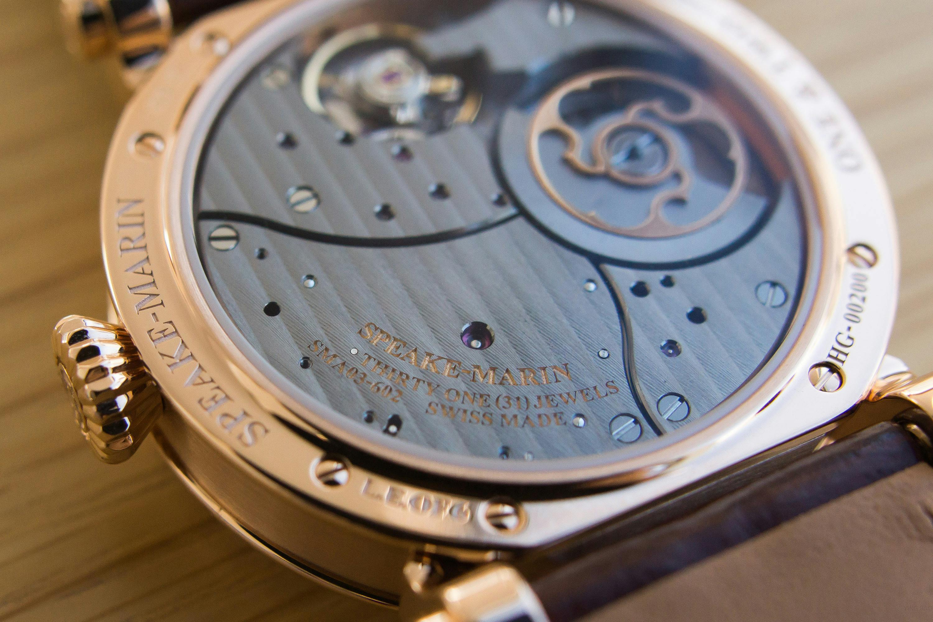 ムーブメントは、地板全体にダークコーティングとコート・ド・ジュネーブ仕上げが施されています。また、マイクロローターには、スピーク・マリン社ロゴがあしらわれており、振動数は2万8800振動/時で、パワーリザーブは52時間です。