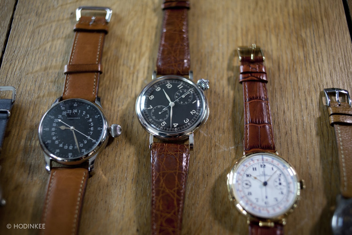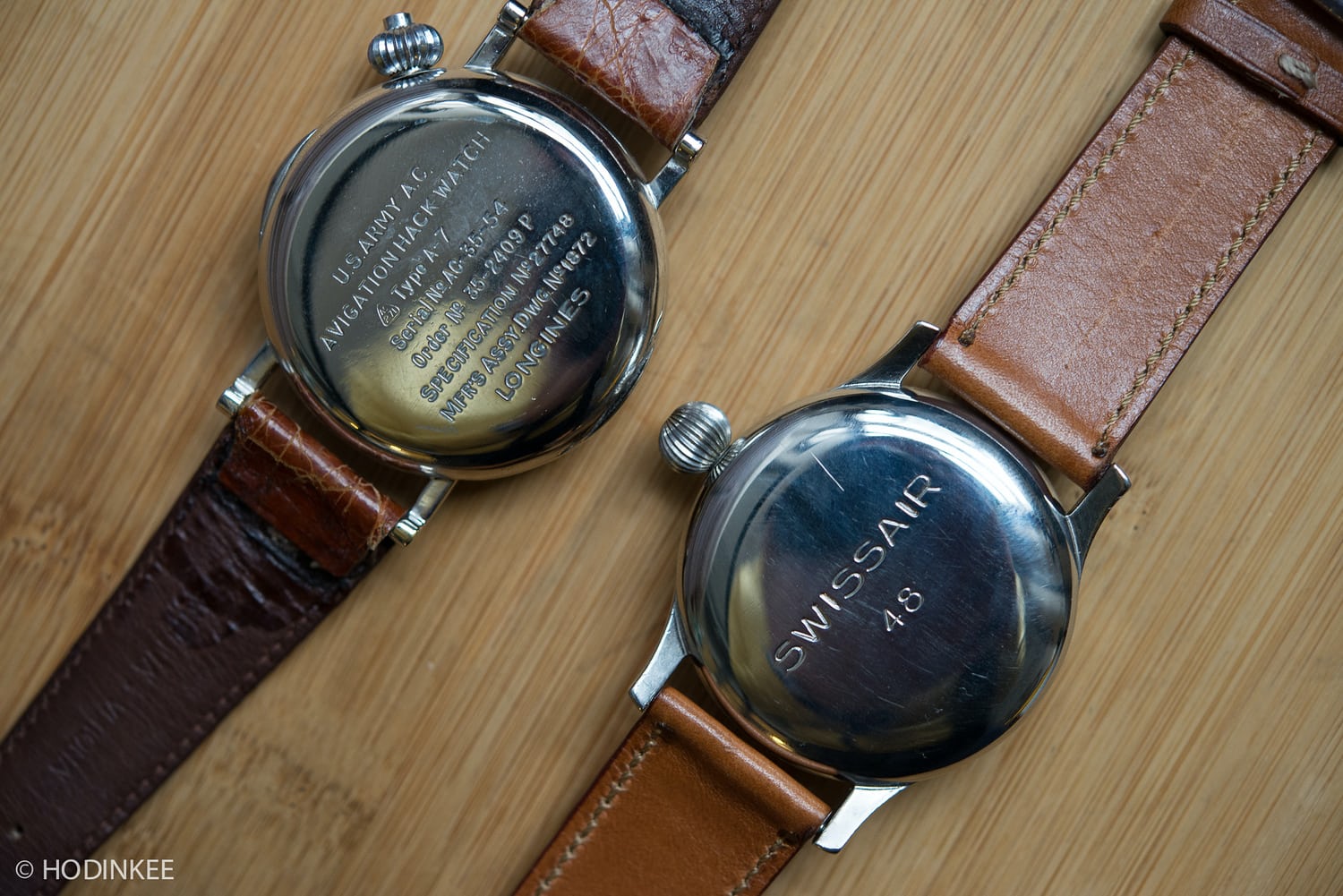 1950年代にロンジン、言い換えるとスイスのマニュファクチュールは、唯一のシリアルナンバー入り限定モデルとしてスイス航空のパイロット向けの、巨大な24時間表示のパイロットウォッチを特別生産していた。この時計の特徴は、1930年代のパイロットウォッチ、ウィームズ大佐考案によるリンドバーグのアワーアングルウォッチに見られる特大ケースとオニオン型リューズを採用していることだ。アルフレッド氏はこの100本の時計(ケースバックに番号が記されている)を、20年の時を経たアワーアングルウォッチ初期のスペアパーツを集めて作られたものだと信じている。