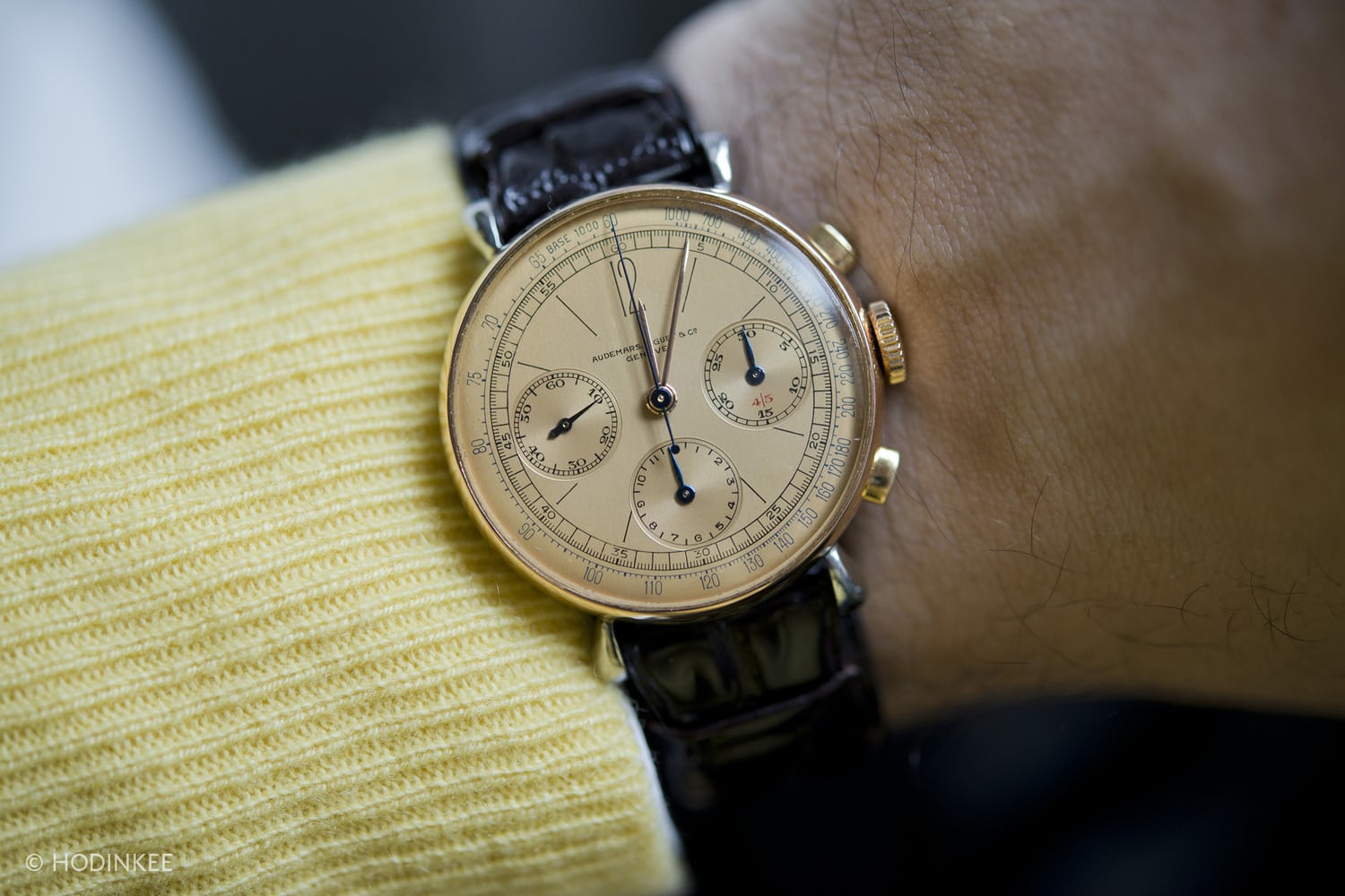 1940年代のパテック製クロノグラフは最高の存在かもしれないが、オーデマ ピゲの同時代の時計の方が、はるかに希少だ。この1940年代のAPクロノグラフは、その全体的なコンディションの良さと現存していると事実によって、並外れた存在感を放っている。ケースはステンレススティールとローズゴールドのツートンカラーで、ダイヤルはローズゴールドだ。このようなモデルは他に例を見ない。
