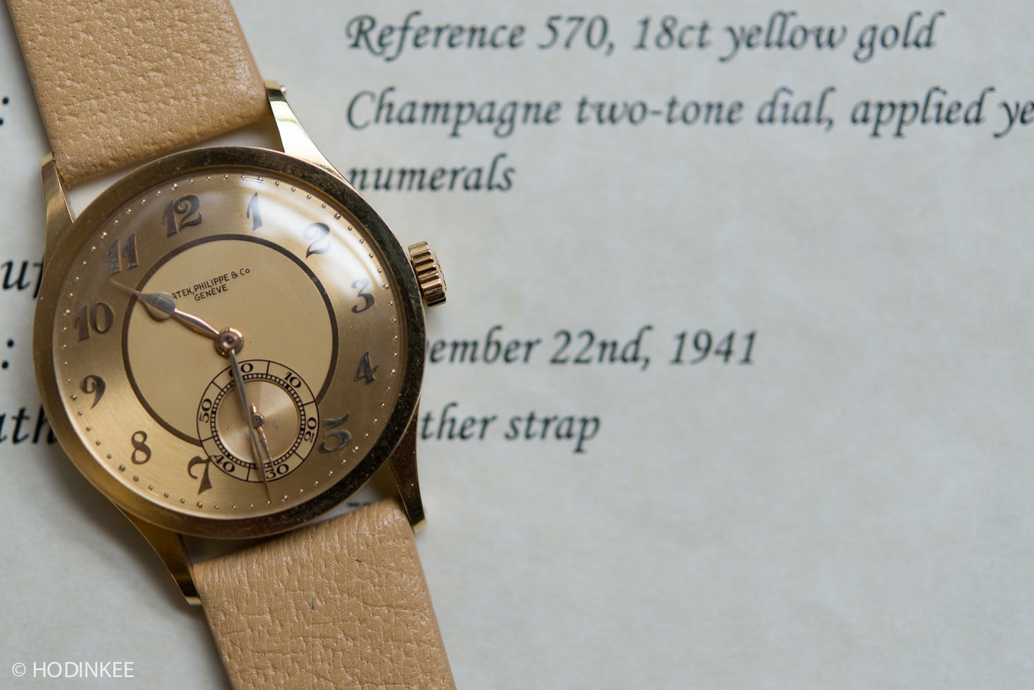 パテックのカラトラバは、まさにカテゴリを代表する腕時計である。1930年代に30.6mmのスモールサイズのRef.96が発表され、パテックの初期のカレンダー無し三針モデルを代表する35-37mmのRef.570が登場した。Ref.570はこれまでに製造された腕時計の中で最も完璧なプロポーションをもつモデルの一つであり、ダイヤルと素材のわずかな違いが、価値や重要性に大きな違いをもたらすことがある。Ref. 570の最も望ましい鉄板レイアウトは、ブレゲ数字のツートンカラーダイヤルだ。これは非常に単純に言えば、とてつもなく希少価値の高いモデルだ。パラミコ氏は、イエローゴールドとローズゴールド、ステンレススティールの3本を所有している。スティール製のRef.570はパラミコ氏の旧友ジョン・ゴールドバーガー氏所有の個体と酷似しているが、これらの時計をさらに特別なものにしているのは、ケースとダイヤルの質の高さと、ダイヤルのエキゾチックな特徴がパテックからのアーカイブに記載されているという単純な事実だ。このようなセットは世界中どこを探してもないだろう。それと、スティール製に見覚えがある理由は、それはパテックの現行モデルRef.5196Pがこのデザインを引用しているからである。