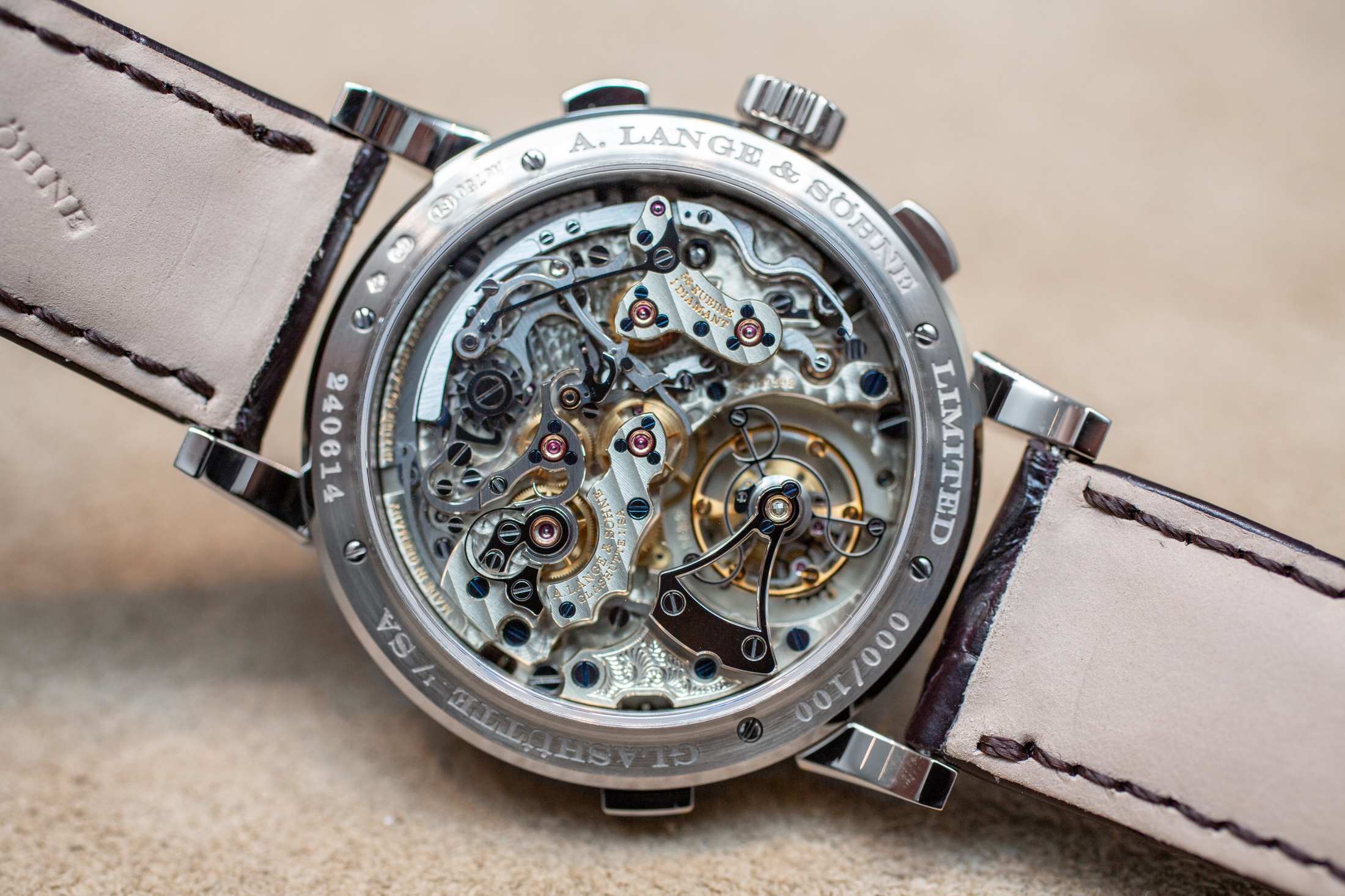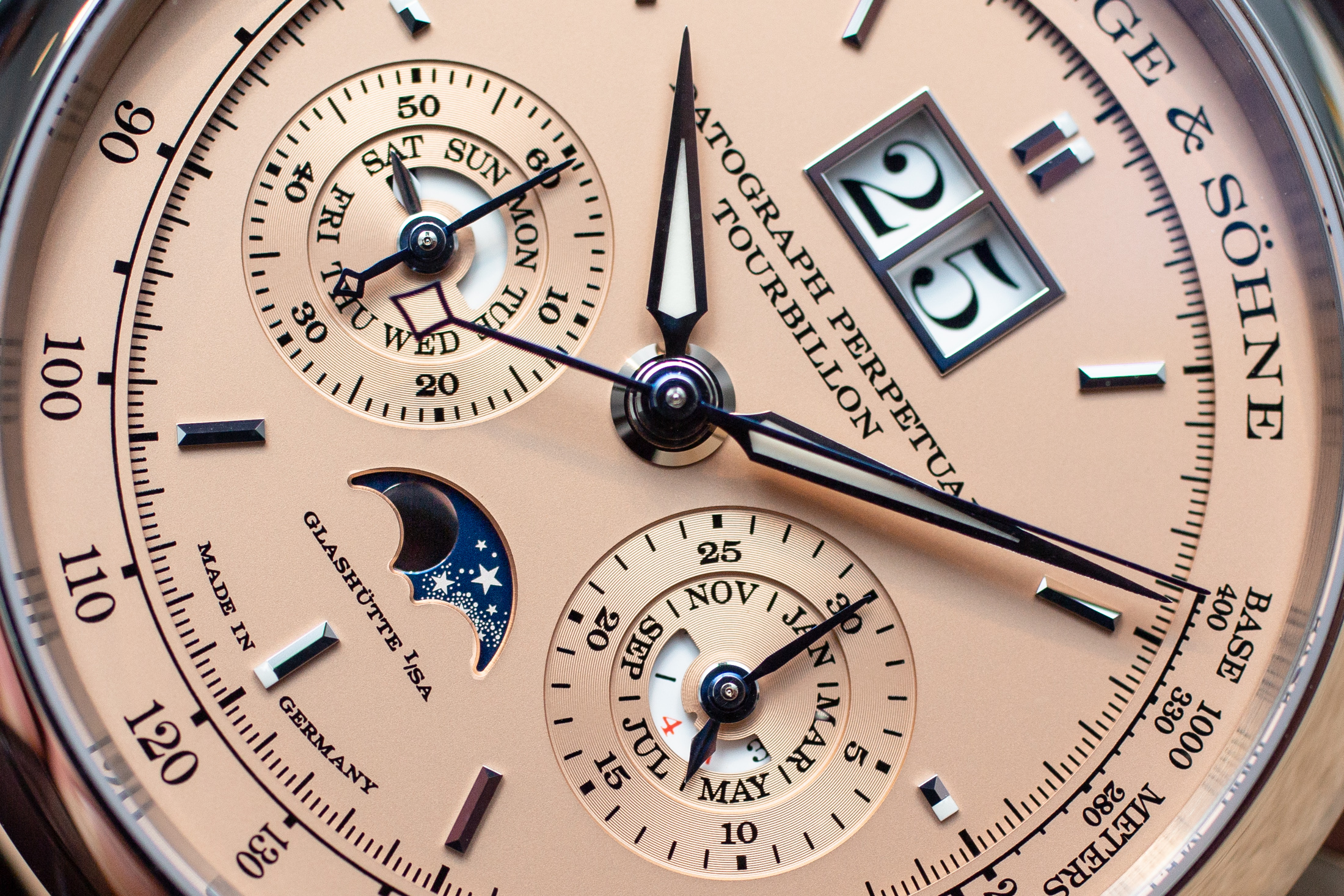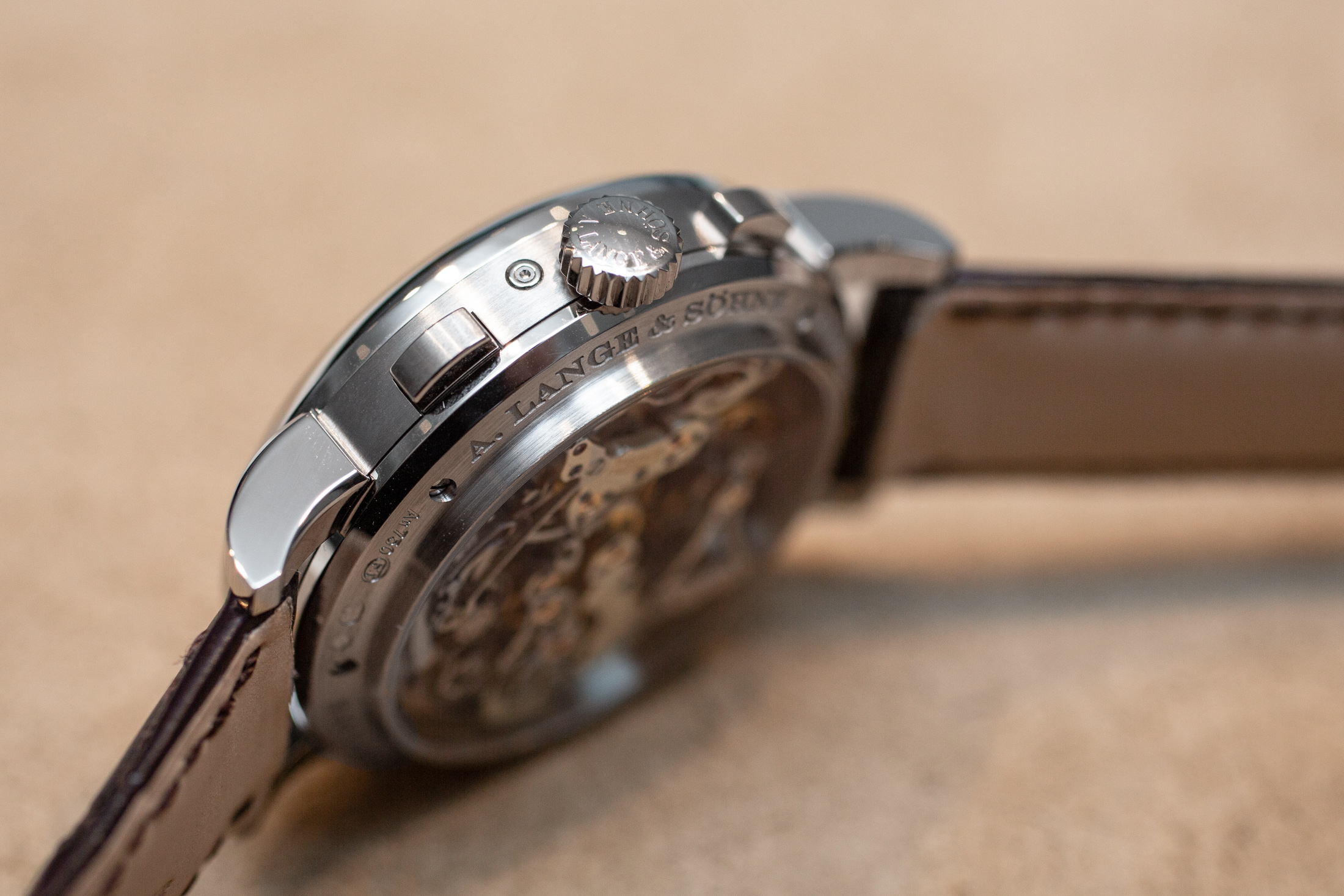 おっと、トゥールビヨンも搭載されているけれど、背面からしか見えないデザインとなっている。トゥールビヨンを見せびらかす方法は他にあまりないものの、ケースバックからしか見えないようにするなんて、すごくドイツらしさに溢れている。現代のウォッチメイキングにおいて、このトゥールビヨンは最も美しいムーブメントデザインのひとつであるだけでなく、表からは見ることのできない構造にすることで、文字盤デザインを妨げないばかりかランゲ伝統の過度な装飾を避けるストイックなアプローチを堅持している。
