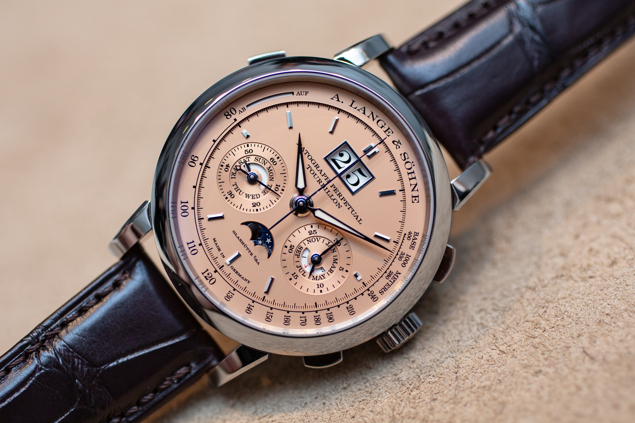 サーモンダイヤルかもしれないし、サーモンダイヤルじゃないかもしれない。もう分からなくなってきた。とにかくはっきりしているのは、このA.ランゲ&ゾーネ ダトグラフ・パーペチュアル・トゥールビヨンの最新機が持つピンクゴールドダイヤルには、誰もがうっとりとさせられるということだ。この新たな限定モデルには、ホワイトゴールドケースに、「サーモン」と定義されることも多いピンクゴールドの文字盤が合わせられている。魚類学上の主張はさておき(ご自分でお調べください)。ダトグラフの新作はいつも写真を載せるに値するものだが、このダトグラフ・パーペチュアル・トゥールビヨンもやはり驚くほど複雑で、限りなくクールな一本である。