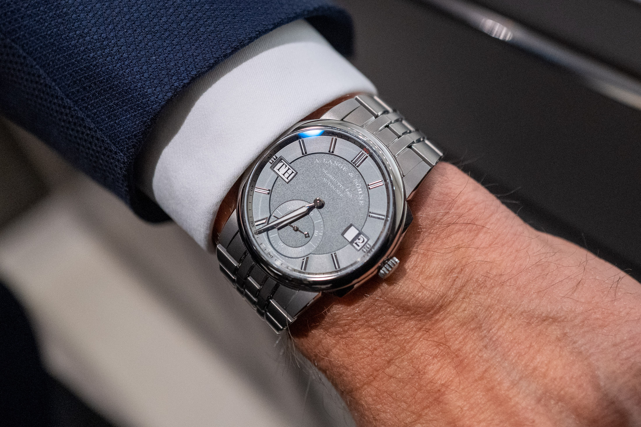 いや、問題ない。私の経験では、一体型ブレスレットの時計であれば、同じサイズのストラップを採用した時計よりも、手首を中心としたときの重量のバランスがいいため、安定して着用できる。だからオデュッセウス・クロノグラフの例では、ケースの形状やデザインは測定値とは印象が異なる。ケースからラグまでどれだけ離れているか、そして角度のついた一体型ブレスレットの脱落とテーパードにより、私の7.25インチ(約18.4cm)の手首でもつけやすくなっている。CEOのヴィルヘルム・シュミット氏が何年も前にブレスレットを撤廃して以来、現代ランゲのラインナップにおいて、未だにブレスレットを見つけることができるモデルのひとつでもあるのだ。