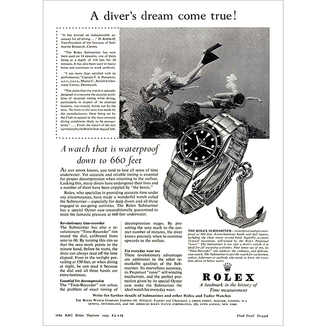 この疑問に対する答えはいくつか考えられる。1つめは、ダイバーズウォッチのメーカーは、黎明期からダイバーとそうでない人の両方にメリットがあると宣伝していたということ。それは、現在より1950年代の消費者の心に響いた。ケースの製造精度、密閉技術やガスケットの改良により、手を洗う前に時計を外すことが推奨されていた時代はとうの昔に終わり、セイコー5以上の機械式時計であれば、水しぶきや短時間水に浸かる程度であれば、耐えることができるようになった(私の最初の機械式時計であるセイコー5は数年間、毎年夏に海中で使用していた。たまたまシーズンが終わったあと、趣味で時計作りを始めたため、軽率ながら興味本位で時計の裏蓋を外し、浸水の痕跡がないか調べた。リューズチューブの内側にうっすらと腐食が見られたが、他には何ら問題はなかった)。しかし、今では昔ほどではないかもしれないが、一般的にダイバーズウォッチは非ダイバーズウォッチに比べ、かなり実用的かつ現実的な選択肢であると考える習慣が、現代まで綿々と刷り込まれているのかもしれない。