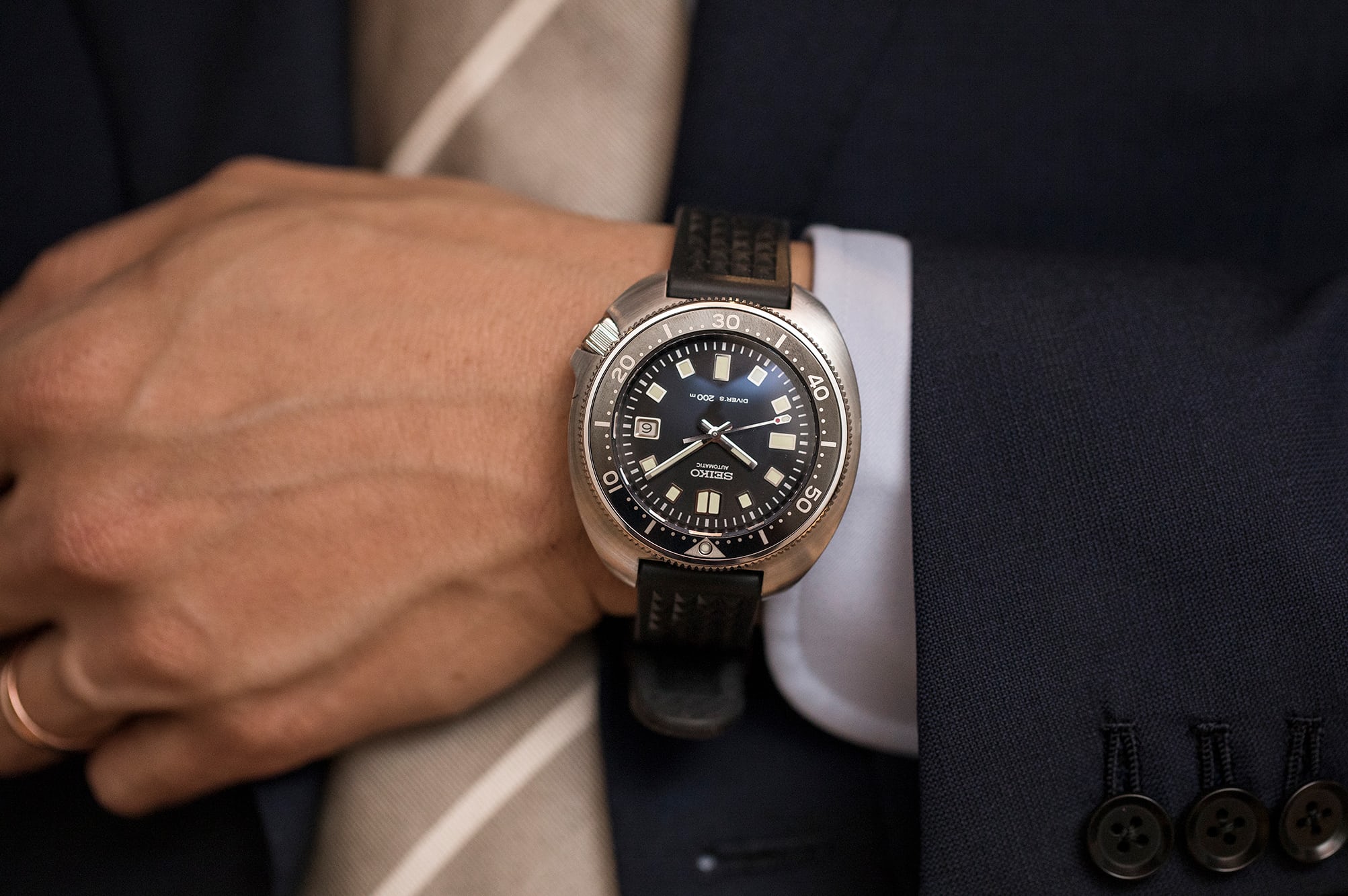 2つめのポイントは、その用途からダイバーズウォッチは、どちらかというと分厚くなりがちだ。日常的な装いに取り込みにくいのである。ジェームズ・ボンドがサブマリーナーをタキシードに合わせているのを力説しても、「この婦人は大仰なことばかり言うと私は思う(『ハムレット』の一節)」といった白けた状況を生み出してしまうものだ。実際のところ、ダイバーズウォッチは、ポロシャツやカーキ以上のフォーマルな服装とはあまり相性がよくない。ビジネスの装いでは、つける人と時計次第で若干の不快感〜まったく不適切、と印象に振れ幅が生じるが、セミフォーマル(タキシード)やフォーマル(ホワイトタイや燕尾服)な装いとの組み合わせに至っては、私なら絶対に避けるだろう。もちろん、装いのスタイルに絶対的なルールはほとんどないが、作家ハーマン・メルヴィルが小説『白鯨』に書いたように、クールにやれば何でも許されるが、そのために賭けに出るほどのことではないのだ。