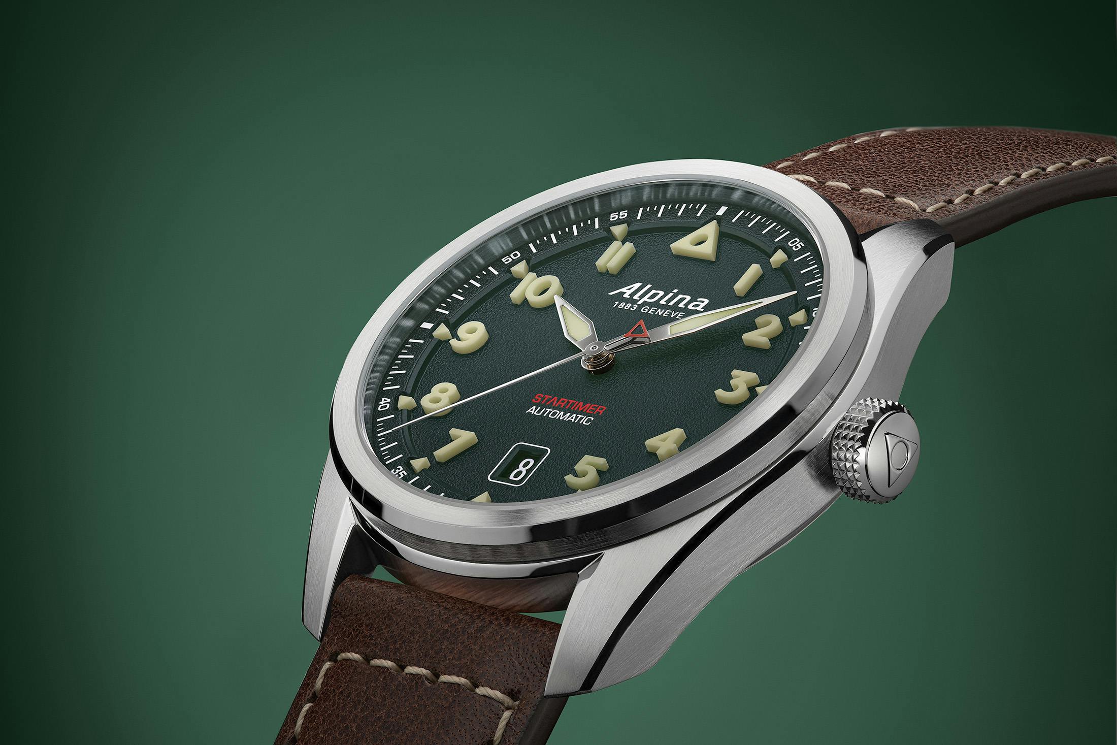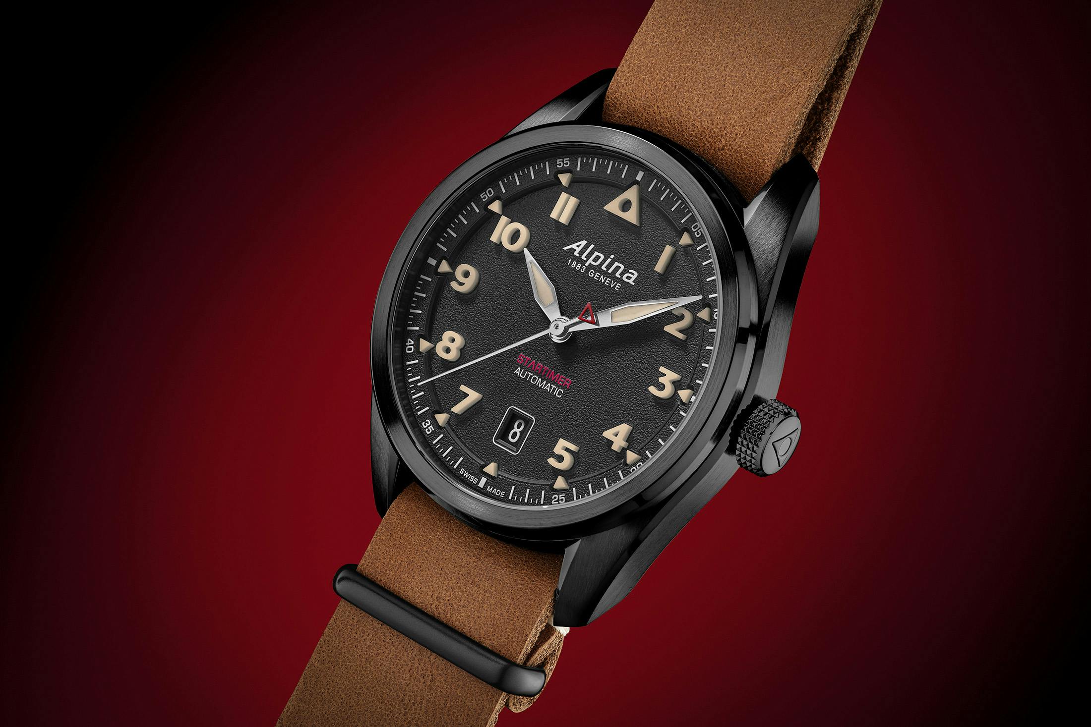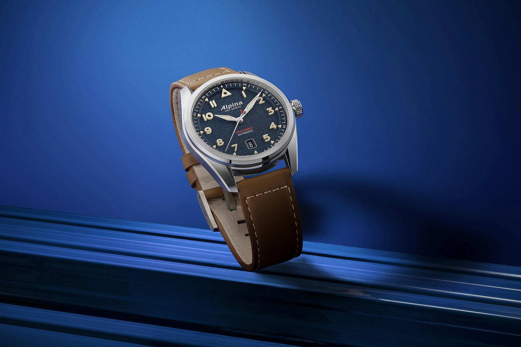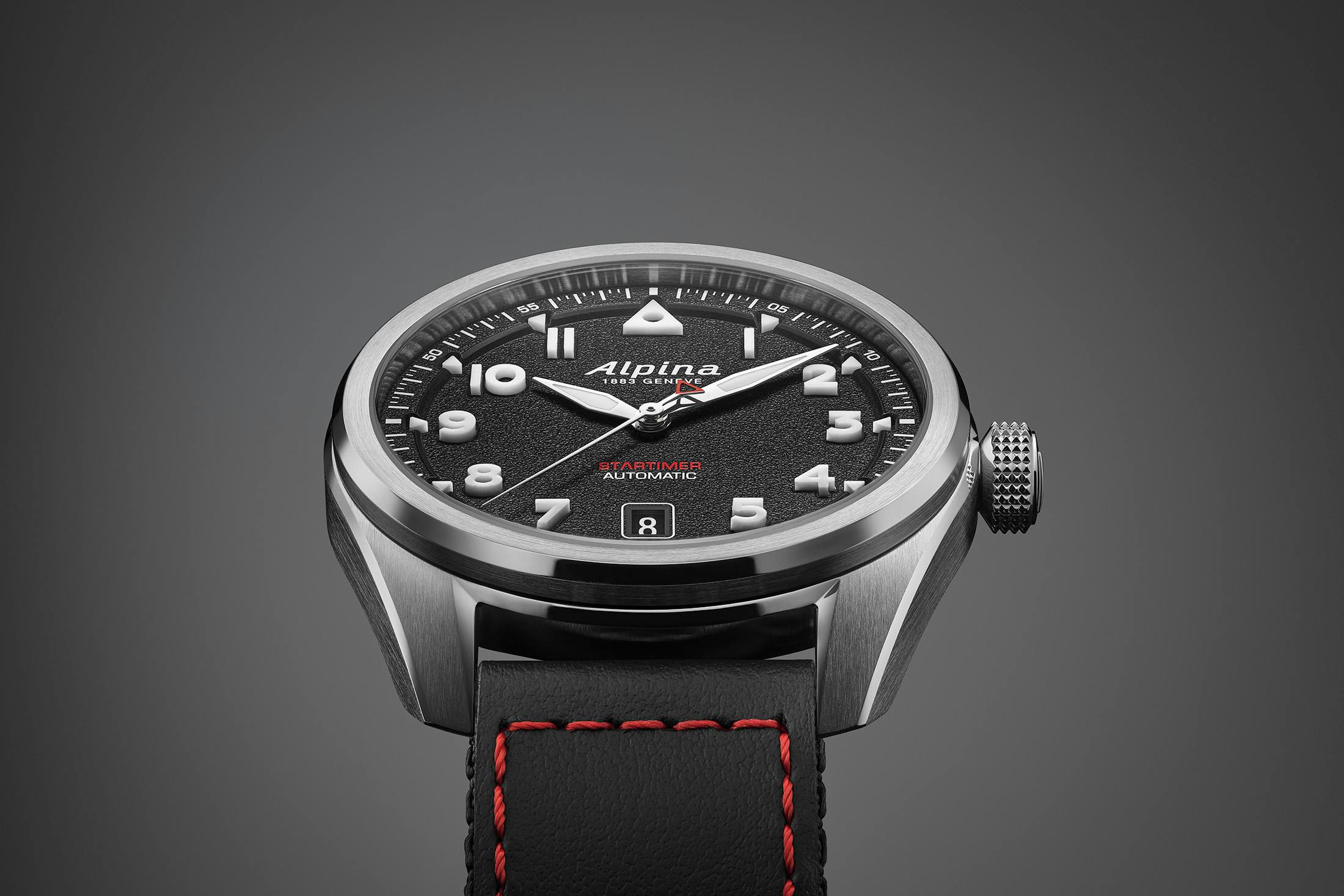 12時位置には、ホワイトでスクリプトフォントに描かれたアルピナロゴが大きく配され、夜光塗料が充填されている。6時位置にはブラックのデイトウィンドウが設けられ、ホワイトの数字とのコントラストで高い視認性を確保している。ブランド名と“1863 GENEVE”の表記は夜光入りの針の上側に配置され、下側には赤字で“STARTIMER”表記とホワイトの“AUTOMATIC”が並ぶレイアウトだ。
