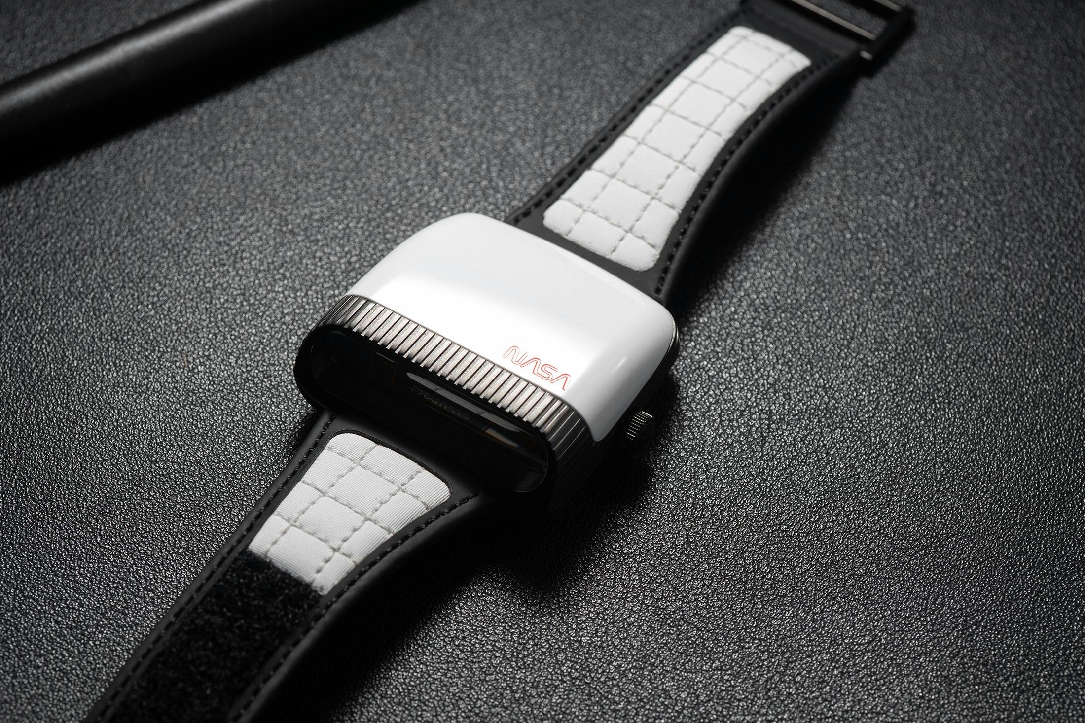 ラバー加工されたレザーストラップは、スペースシャトルというテーマを色濃く反映している。外側は、NASAのシャトル時代の宇宙服に使われていた素材に似ているとアミダが説明する、ホワイトの“ベータクロス”を用いたキルティングのスクエアパターンが特徴だ。ブラックDLCコーティングのバックルを備えたこのストラップは、確実な装着のためにベルクロ(1940年代にスイスで発明された技術)と、NASAの宇宙ミッションで使用されたもうひとつの素材を採用している。