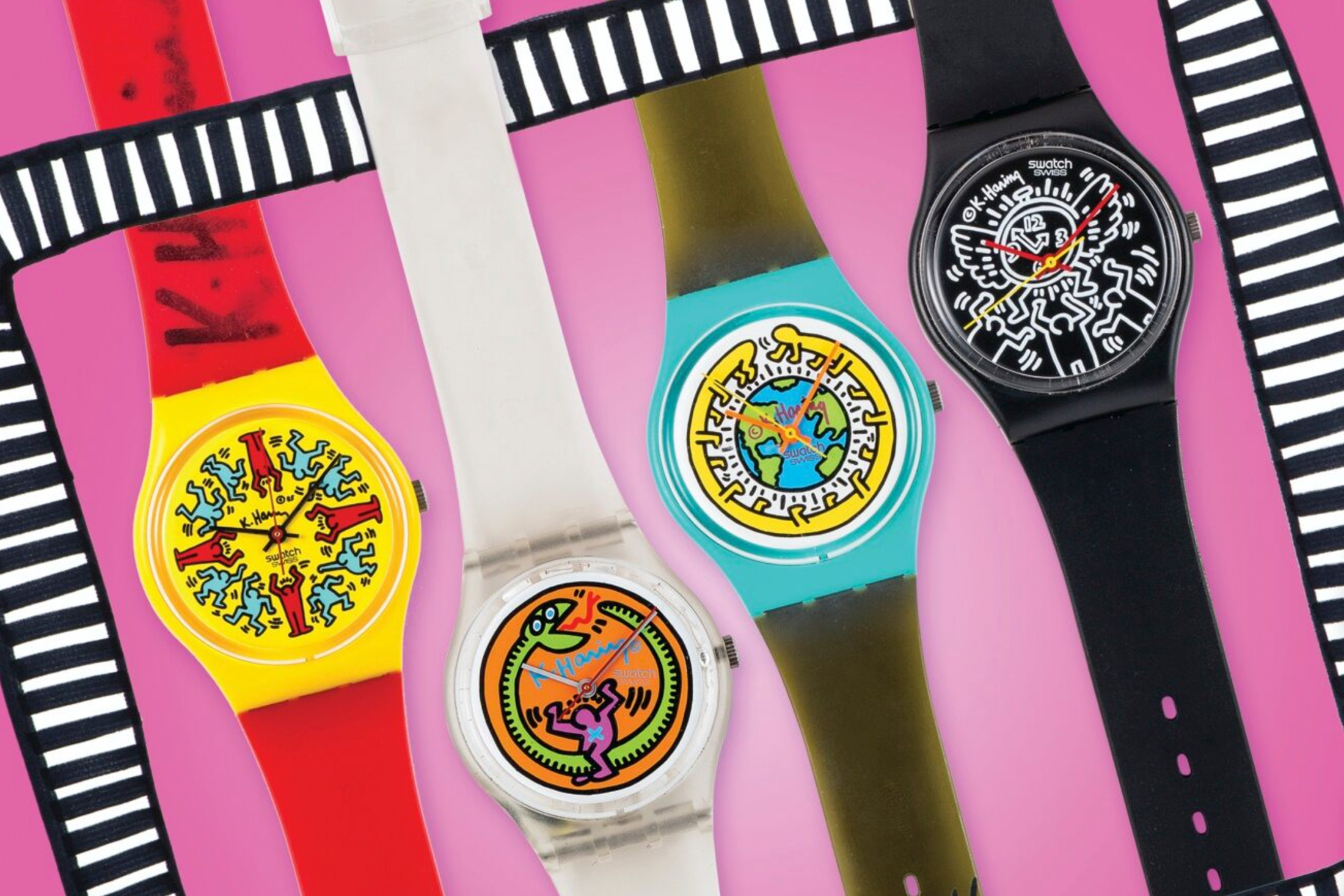スウォッチはほぼ瞬間的にヒットし、ブランド初年度に100万個以上の時計を販売。それ以来、スウォッチは何千ものコレクションを生み出している。カラフルなラインナップの中に、1980年代の影響力ある選ばれたアーティストたちが注目したスウォッチのサブシリーズがある。