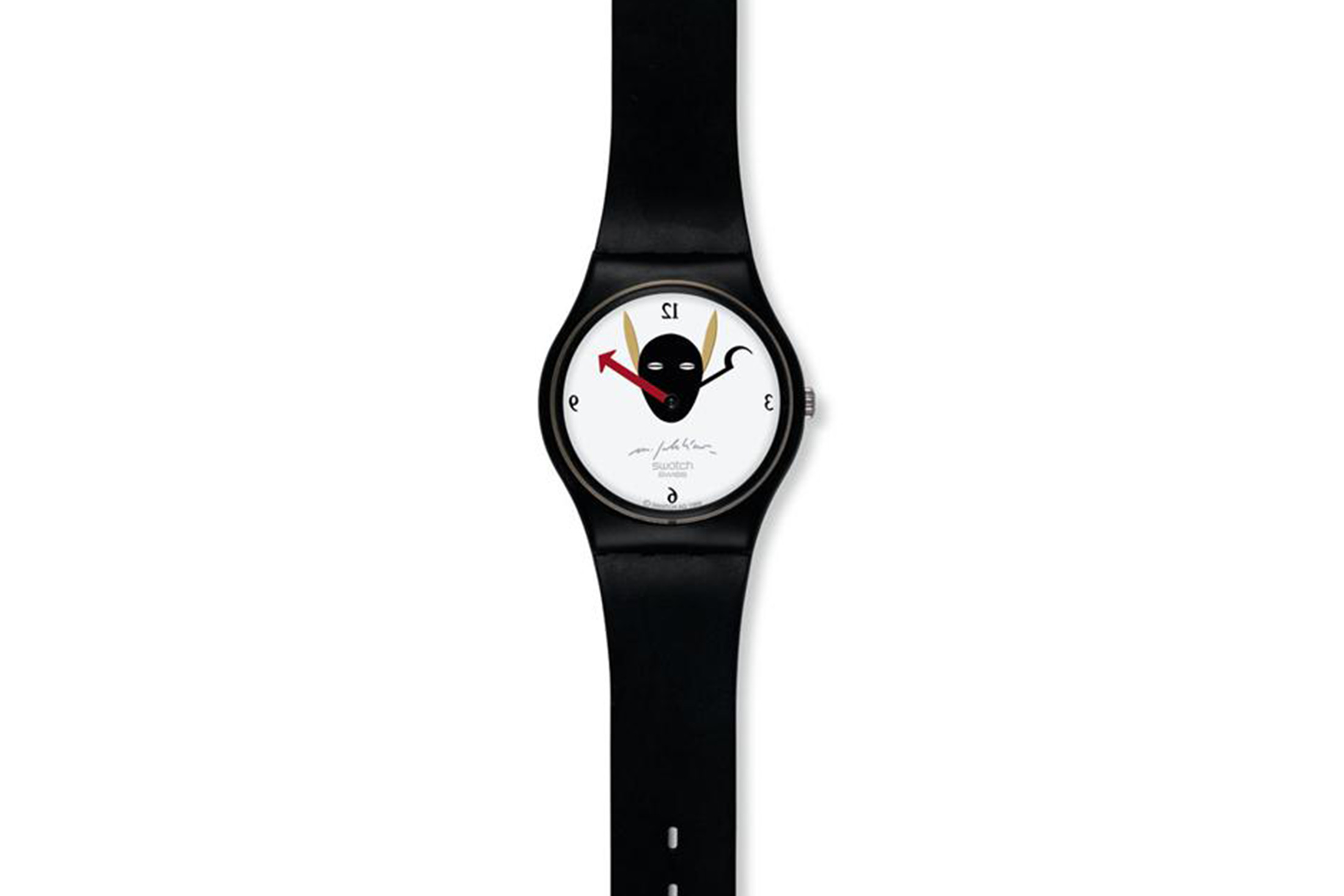 ブラックのケースとストラップが、真っ白な文字盤を縁取り、魅惑的なブラックマスクと、そのマスクの口から放たれている針。オイゴル・オロは140本しか製造されず(1本1本にシリアルナンバーが入っています)、そのうち約40本はローマンインデックスが用いられ、パラディーノ氏とスウォッチの社員に贈られた。残り100本のうち、アラビアインデックスを使用した最初の27本は、ロバート・レッドフォードやダライ・ラマなど、さまざまなスウォッチのVIPに贈られ、最も人気のあるシリーズとなっている。