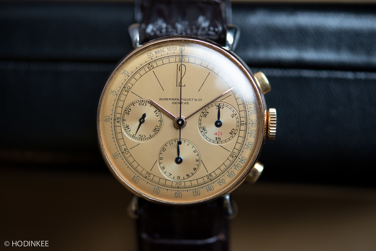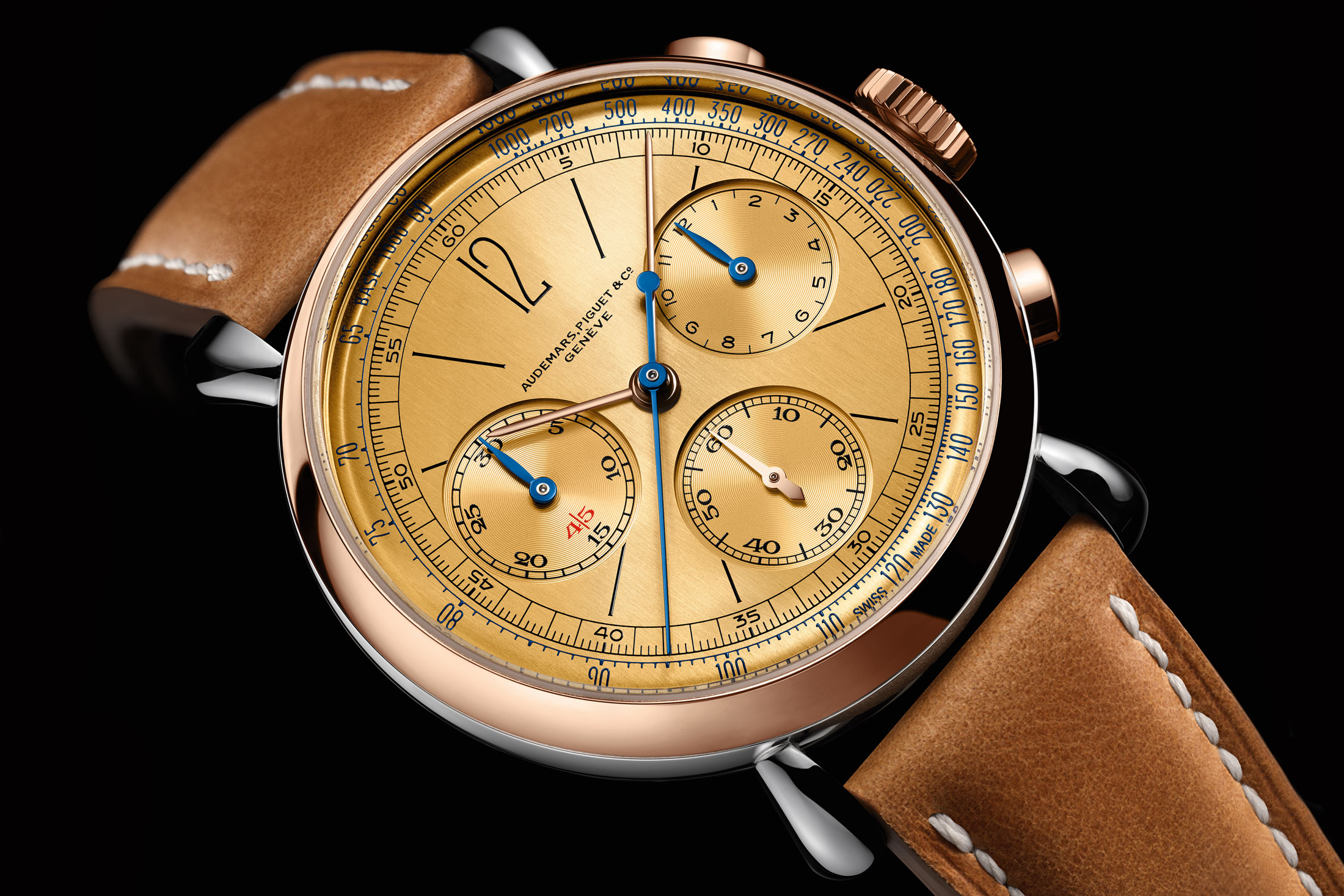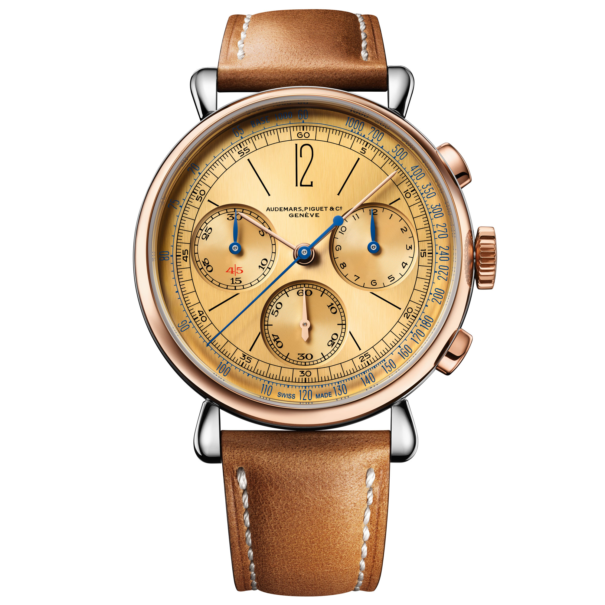 ケースバンド、ラグ、ケースバックは、SS製。ベゼル、リューズ、プッシャーはピンクゴールド製で、独特のコンビケースはそのままです。次にイエローとシャンパンの中間のようなゴールド文字盤と組合わさり、垂直のサテン仕上げと鮮明な印字が施されています。クロノグラフ針とタキメータースケールは、青字で印字されアクセントとなっています。また、クロノグラフの30分積算計には、サッカーの試合時間の半分を計るための赤い45(これもオリジナルからそのまま維持されています)も含まれます。でも僕の好きなヴィンテージテイストは? もちろんあります。オールドスクールの"Audemars, Piguet & Co / Genève"のロゴです。これは抜群にいいですね。