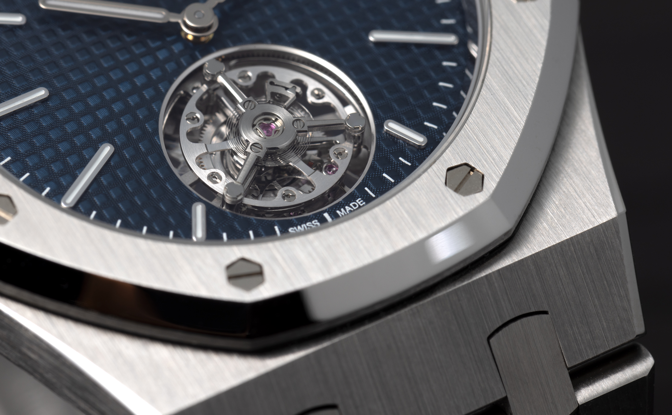 オーデマ ピゲは長年にわたり、基本的に同じトゥールビヨン、つまり同じケージ、テンプ、脱進機、そして同じ上部トゥールビヨンブリッジをすべてのトゥールビヨンウォッチに使用している。ブリッジは特徴的な逆V字型、ケージは3本のアームを持ち、その外縁にはポイズンネジとタイミングネジが取り付けられたフリースプラングテンプが搭載されている。上部ブリッジを除けば、今年1月に発表されたロイヤル オーク フライングトゥールビヨン 26730と同じトゥールビヨンが使われている。また、CODE 11.59コレクションの自動巻きフライングトゥールビヨン クロノグラフに使用されているトゥールビヨンでもある。