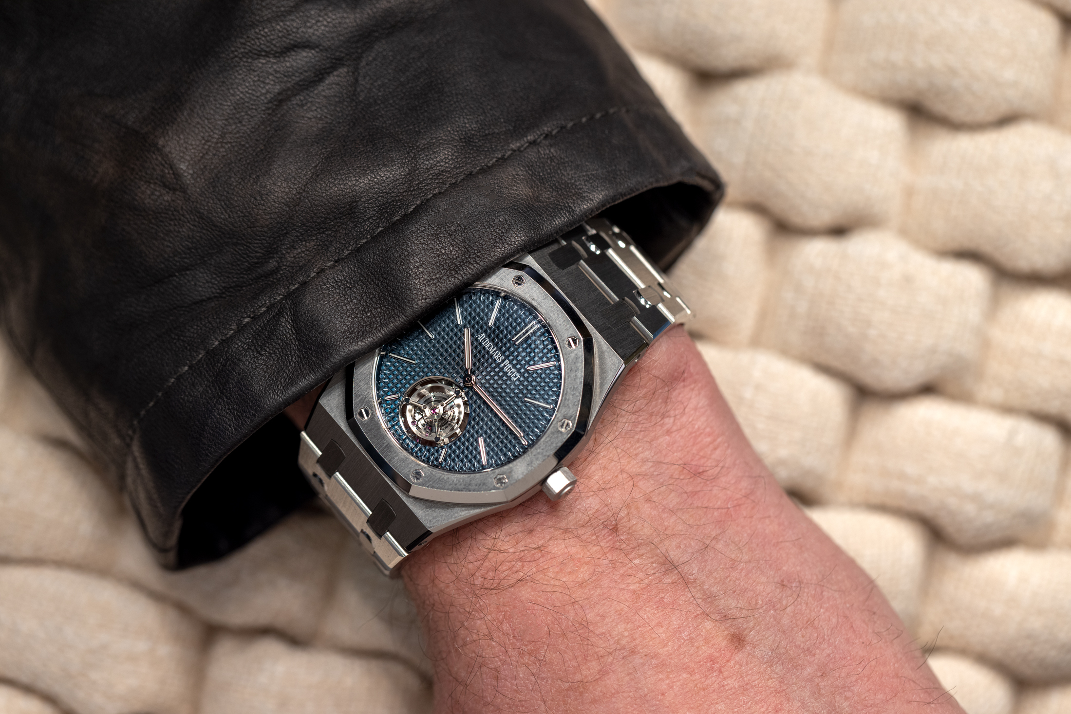 そして外観は? これはジャンボなのだ。39mm×8.1mmのサイズに、美しいブルー ニュイ ニュアージュ 50のダイヤルを備えている時計だ。RD#3 ジャンボ トゥールビヨンに欠けている唯一のクラシックなジャンボの要素は、6時位置のAPロゴだが、オープンダイヤルのフライングトゥールビヨンを持つのであれば、それは妥当なことだと思う。ジャンボが好きなら、ロイヤル オーク フライング トゥールビヨン エクストラ シン(RD#3)も気に入るはずだ。オープンダイヤルのフライングトゥールビヨンという発想が好みでないなら別だが。超薄型自動巻きトゥールビヨンウォッチを比較するのは、少しトリッキーかもしれない。複雑機構の歴史を知るのに役立つし、フルローターのムーブメントとペリフェラルローターのムーブメントを比較するのは一方では公平だが、他方では少しばかりアップルとオレンジを比較するようなことでもあるのだ。そのような観点から見ると、RD#3は美しく、非常によく考え抜かれた現代的なウォッチメイキングにおける作品であると言えるだろう。