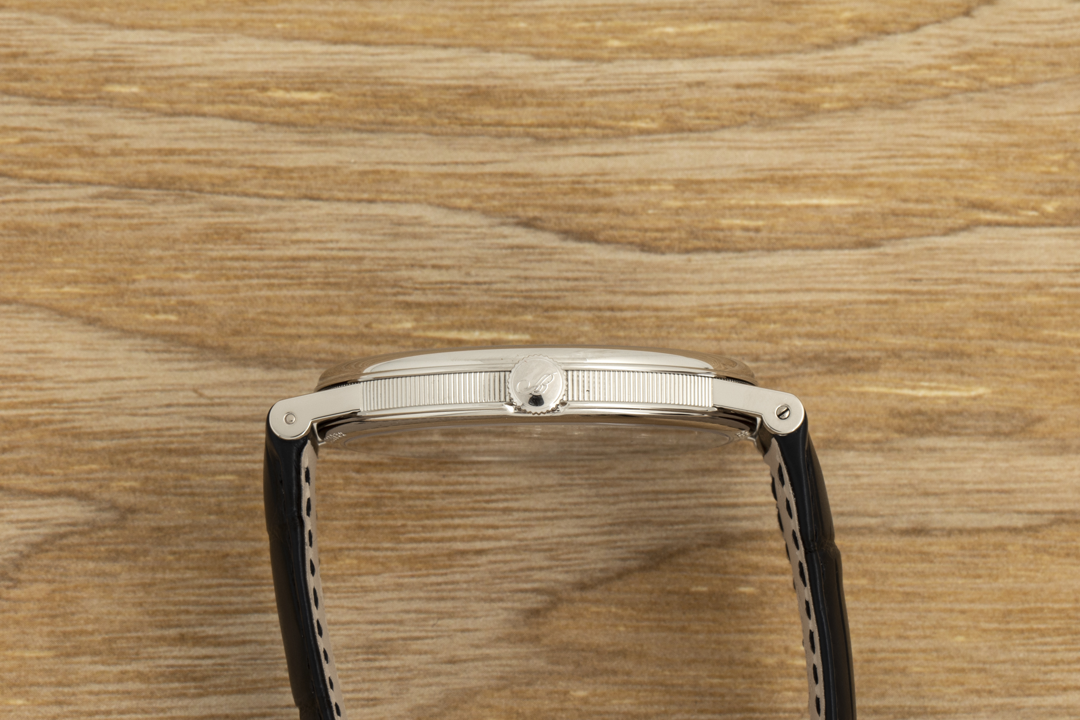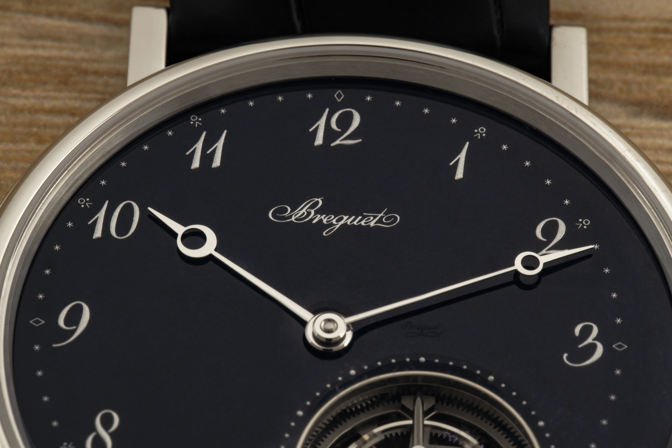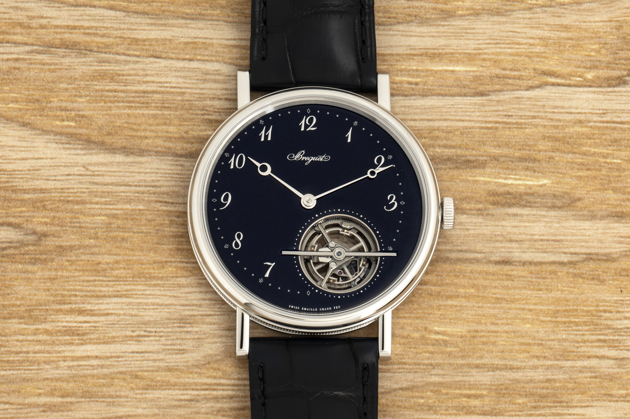 手に取ったり手首に着けたりしたときの感触はというと、まさにブレゲの極薄トゥールビヨンに期待するとおりのものだ。非常に洗練されているという第一印象(さらに感動が追いかけてくる)を与えてくれる。このブルーは、エナメル文字盤の良さが最も伝わる、爽やかさと深みを感じさせてくれる。食べられるんじゃないかと思うくらいだ。文字盤は光の当たり具合で、ほとんど黒い青黒色から孔雀の羽の虹色まで、幅広い色合いを見せてくれる。