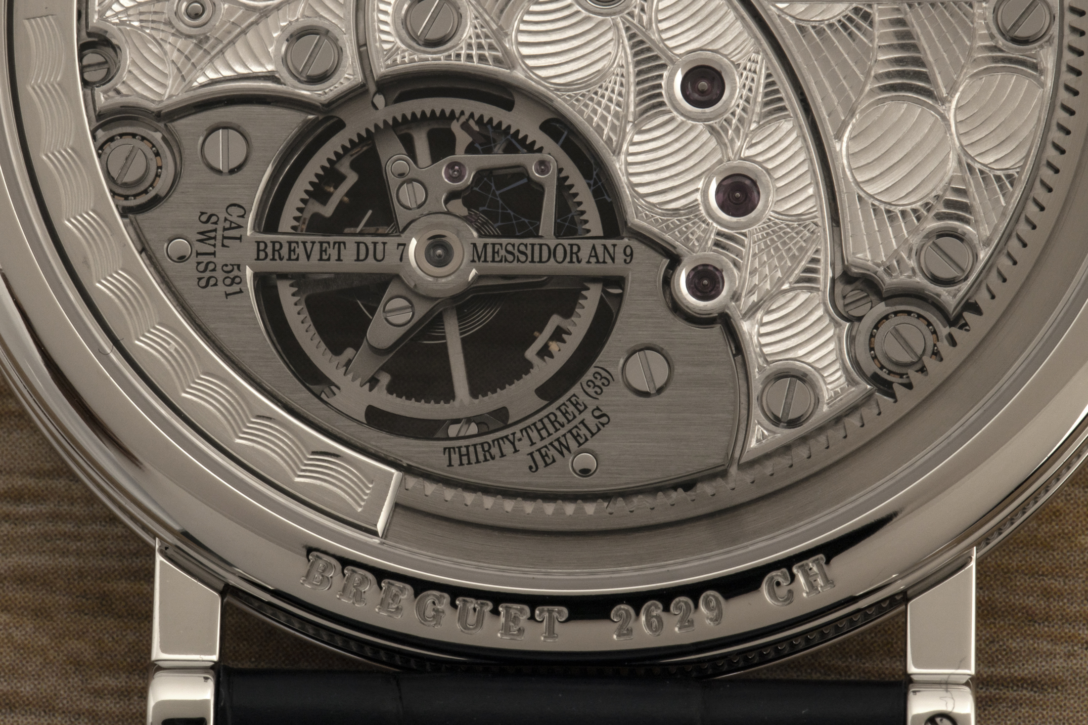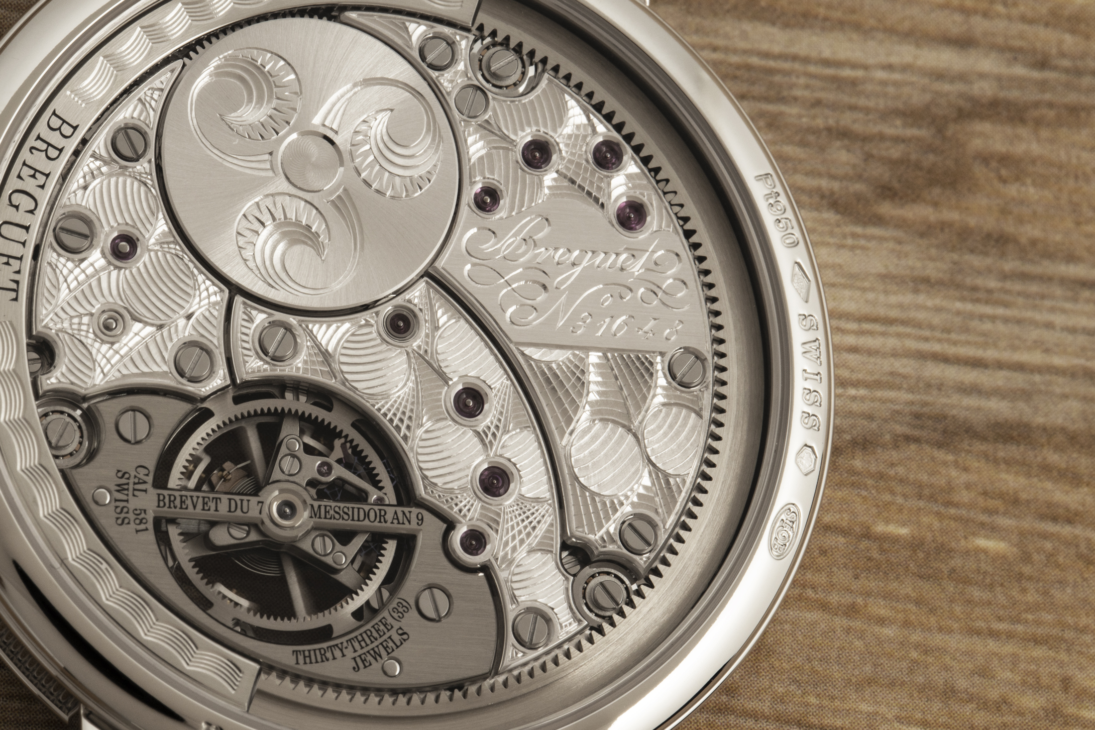 もちろんムーブメントも、このレベルの時計となると他の要素と同じくらい存在が大きく、Cal.581は、伝統的な時計づくりの仕上げや装飾と、かなり現代的な技術の両方を象徴する。ムーブメントは厚さ3㎜(直径16リーニュ)と非常に薄く、前述のとおり、それを実現できたのもペリフェラルローターの採用による部分が大きい(一般的にまだ比較的珍しいものだ。ブルガリがオクト フィニッシモ トゥールビヨン オートマティックで、カール F. ブヘラが ヘリテージ トゥールビヨン ダブル ペリフェラルで採用)。ディスプレイの裏から見てもペリフェラル ローターは見つけづらい。ムーブメントの端にあり、自動巻き輪列の他の部分と噛み合う歯車が内側についたリング上にある。背面のトゥールビヨンの受け板には「Brevet Du 7 Messidor AN 9」と刻まれており、これはブレゲの特許取得日である1801年6月26日に言及したものだが、比較的短期間で廃止されたいわゆる共和暦で示されている。共和暦は、暦法を近代化する目的でフランス革命期に導入された(そして、グレゴリウス13世がユリウス暦に対抗して以来、暦法の改革を目指した他のほとんどの試みと同じ運命を辿った)。