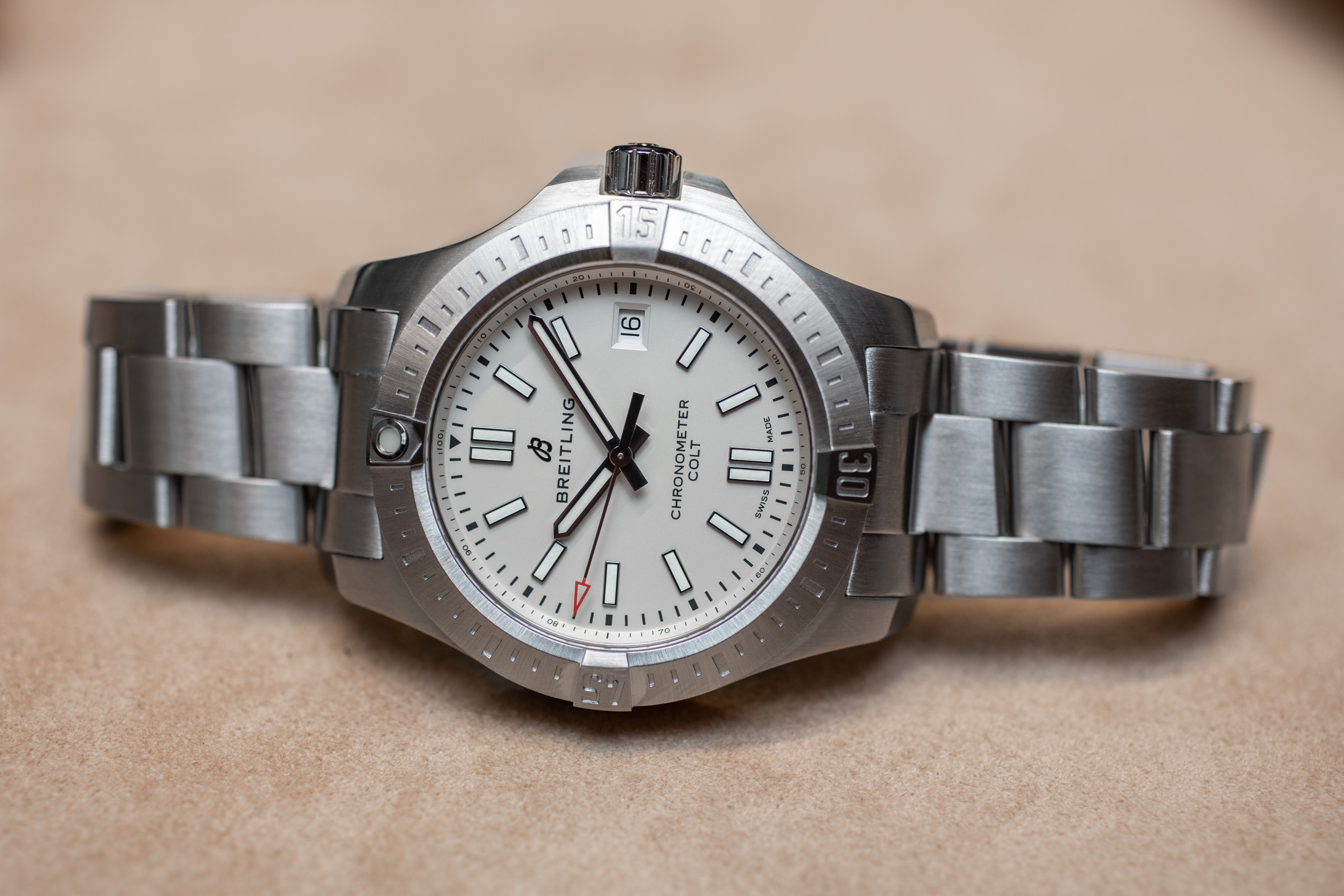 ダイヤルデザインに加えて、今回のコルトのリフレッシュで最も注目すべき点は、ダイヤルカラーである。現在、「シルバー」(以下のように、半光沢のクリーミーなライトグレーに近い)または「テンペスト グレー」(艶消しサンレイ仕上げのメタリック)のいずれかで提供され、両バージョンとも実にすばらしいルックスだ。特に、艶消しSSベゼルに囲まれたマット仕上げのシルバーダイヤルのモダンな感じを、実は気に入っている。いずれのダイヤルパターンもコルトのデザインによく似合っているが、テンペスト グレー ダイヤルは典型的なブライトリングらしく、シルバーダイヤルの方は少しばかり面白さを感じる(良い意味で)。