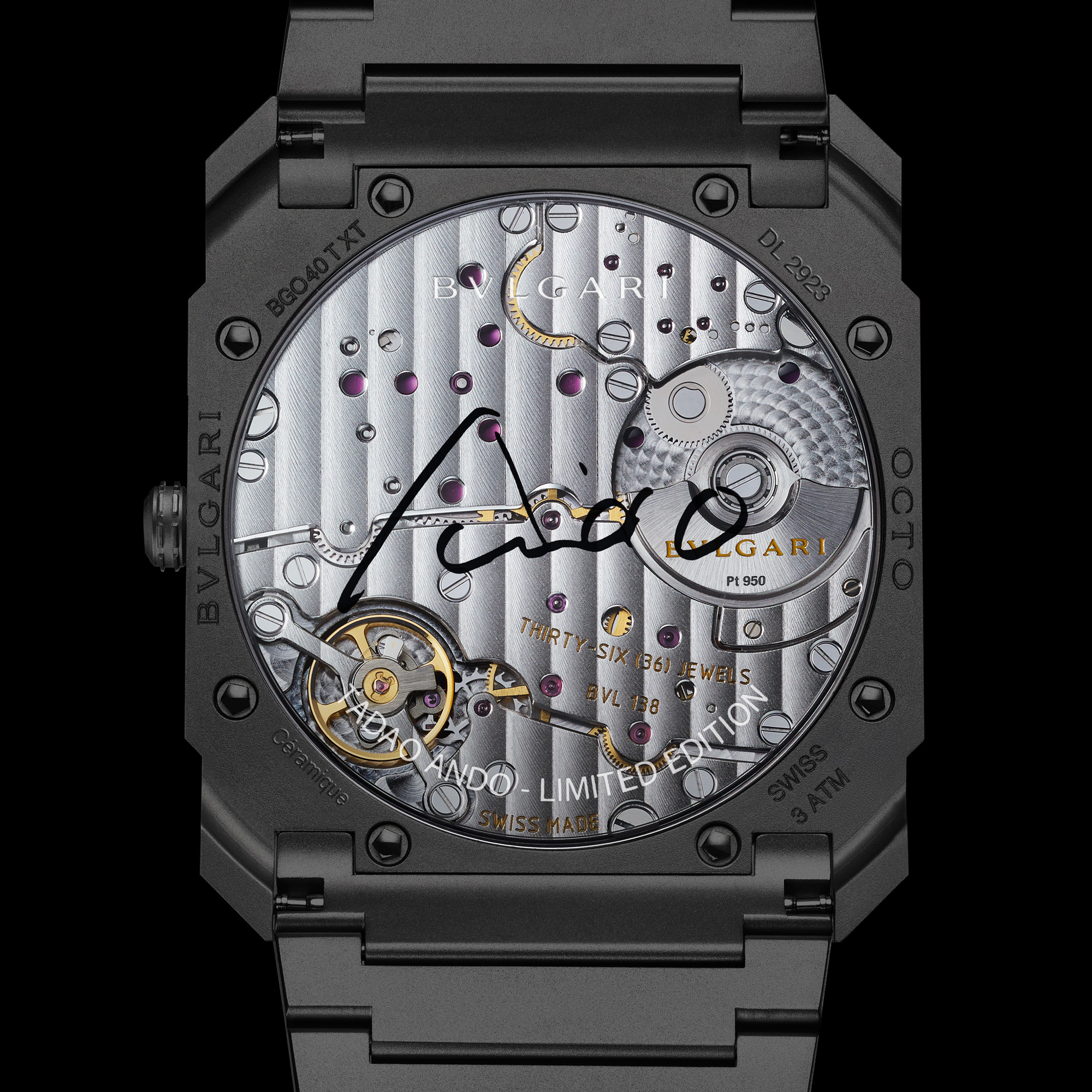 ムーブメントはお馴染みのBVL138で、サファイアケースバックから見ることができます。ケースバックには安藤氏のサインが刻印され、さらに華やかさを増しています。このモデルは160本しか製造されませんが、世界中のブルガリブティックや正規販売店(HODINKEE Shopを含む)で購入することができます。さらに良いことに、今すぐ購入できるのです!