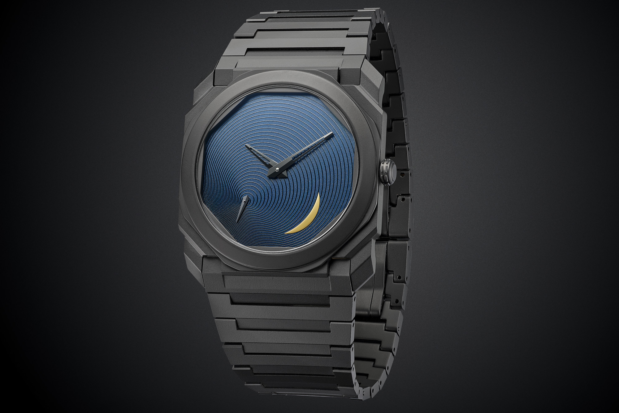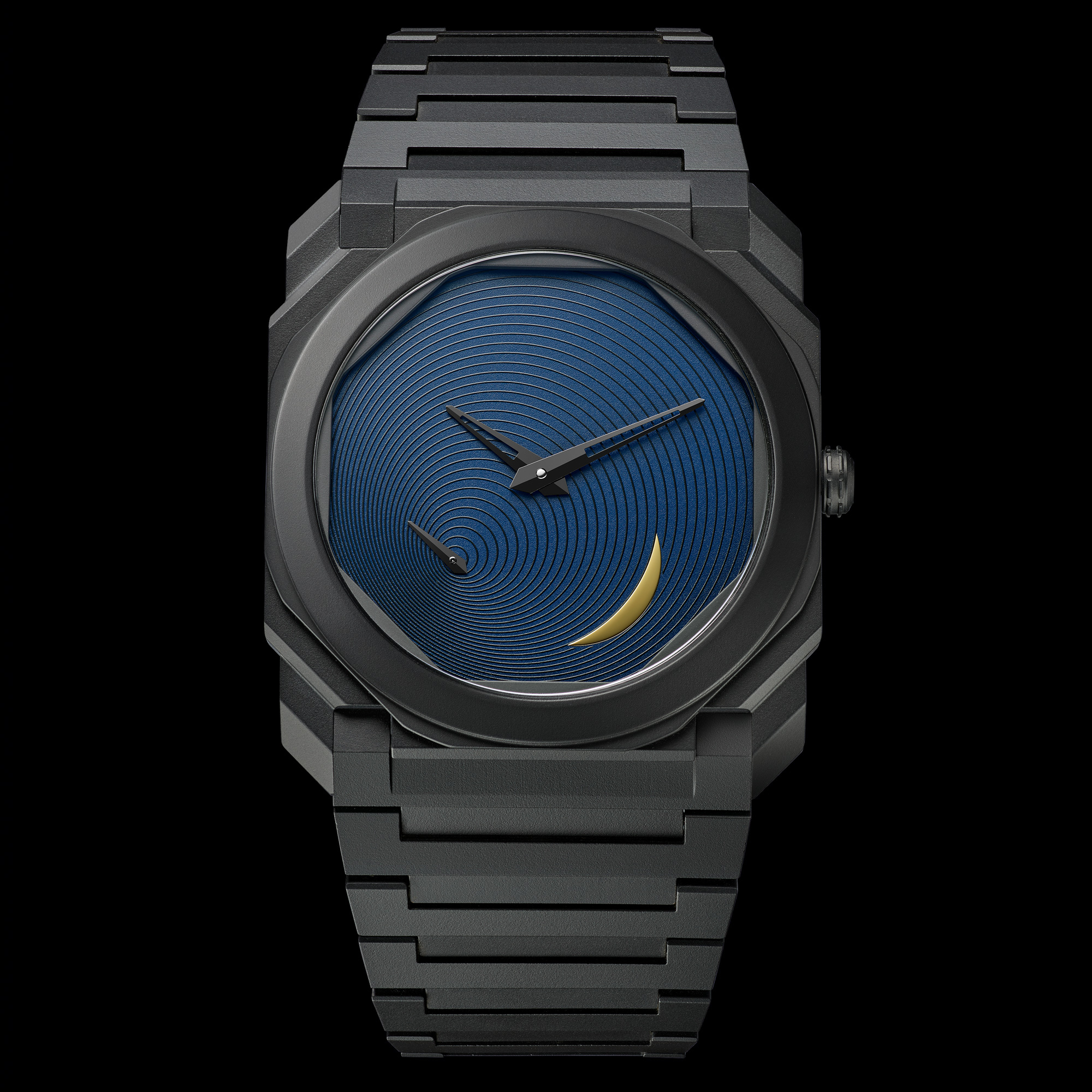 オクト フィニッシモ 安藤忠雄 限定モデル Ref. 103534は、3針モデルのオクト フィニッシモ 40mmをベースにしたモデルで、年々新たな面白さを追求しています。ケースとブレスレットには、サンドブラストによる質感の高いマットブラックセラミックを採用。文字盤は、夜空の深さをイメージしたラッカー仕上げのリッチブルーで、5時位置には、新月の始まりを意味するイエローゴールドの月が配されています。この「三日月」は、再生と時の流れの象徴。このような自然へのジェスチャーは、グランドセイコーなどでも見られますが、ブルガリと安藤忠雄氏がそれぞれのコンセプトを表現しているのは素晴らしいことです。