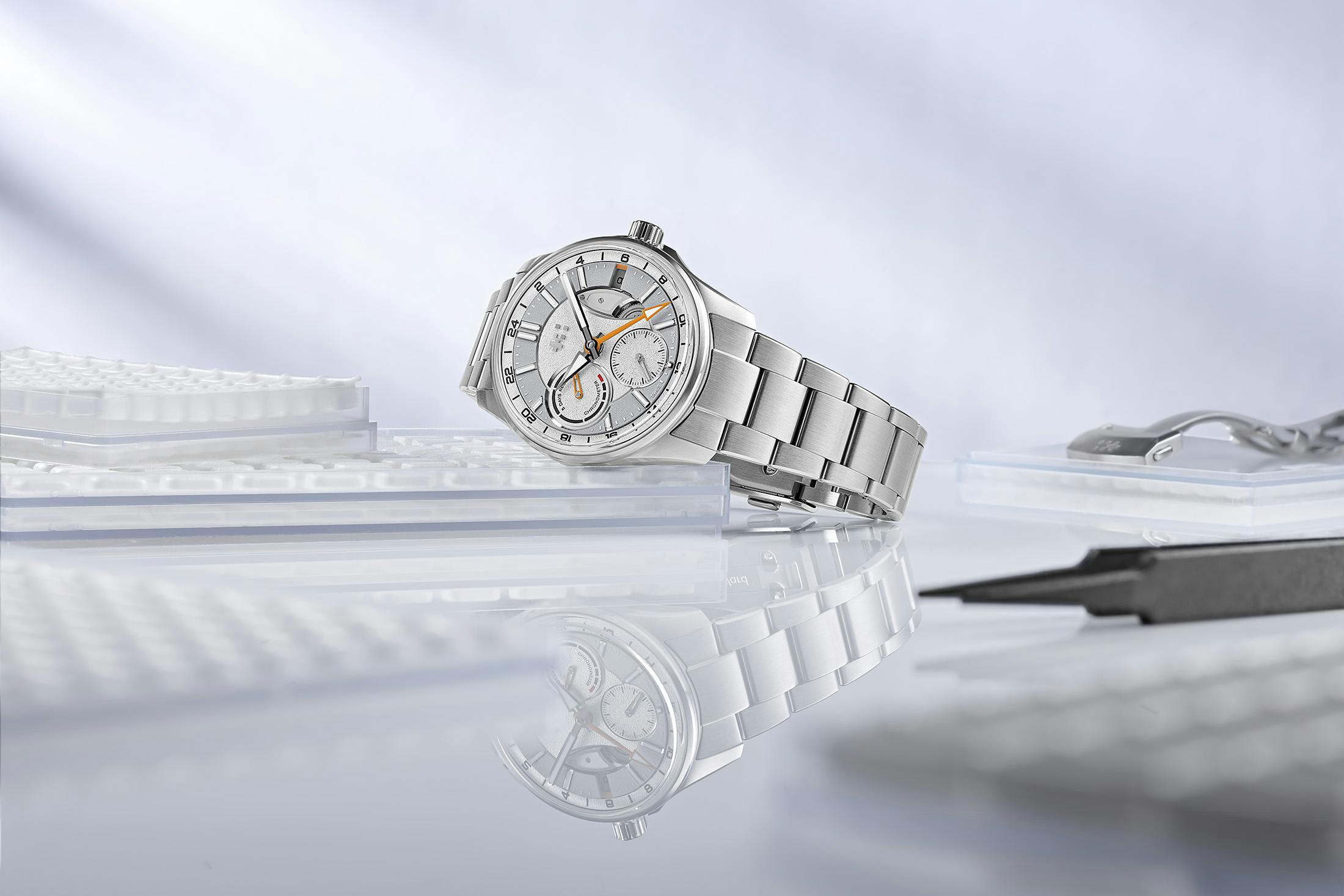 直径40.5mmのステンレススティール(SS)製のケースを持つ本作は、ダイヤルのレイアウトと構造を通じてGMTウォッチに独自の解釈を加えている。グレイン仕上げを施したダイヤルにはふたつのインダイヤルが配置され、6時位置にはスモールセコンド、9時位置にはアプライドのパワーリザーブインジケーターが配されている。一方、3時位置の日付表示窓の横にはムーブメントの一部が透けて見えるカットアウトがあり、直線的なサテン仕上げと手作業でポリッシュ仕上げが施されたGMTブリッジや、サテン仕上げを施した歯車が確認できる。固定ベゼルを採用することで、トラベルウォッチとしては斬新で個性的なレイアウトを実現している。