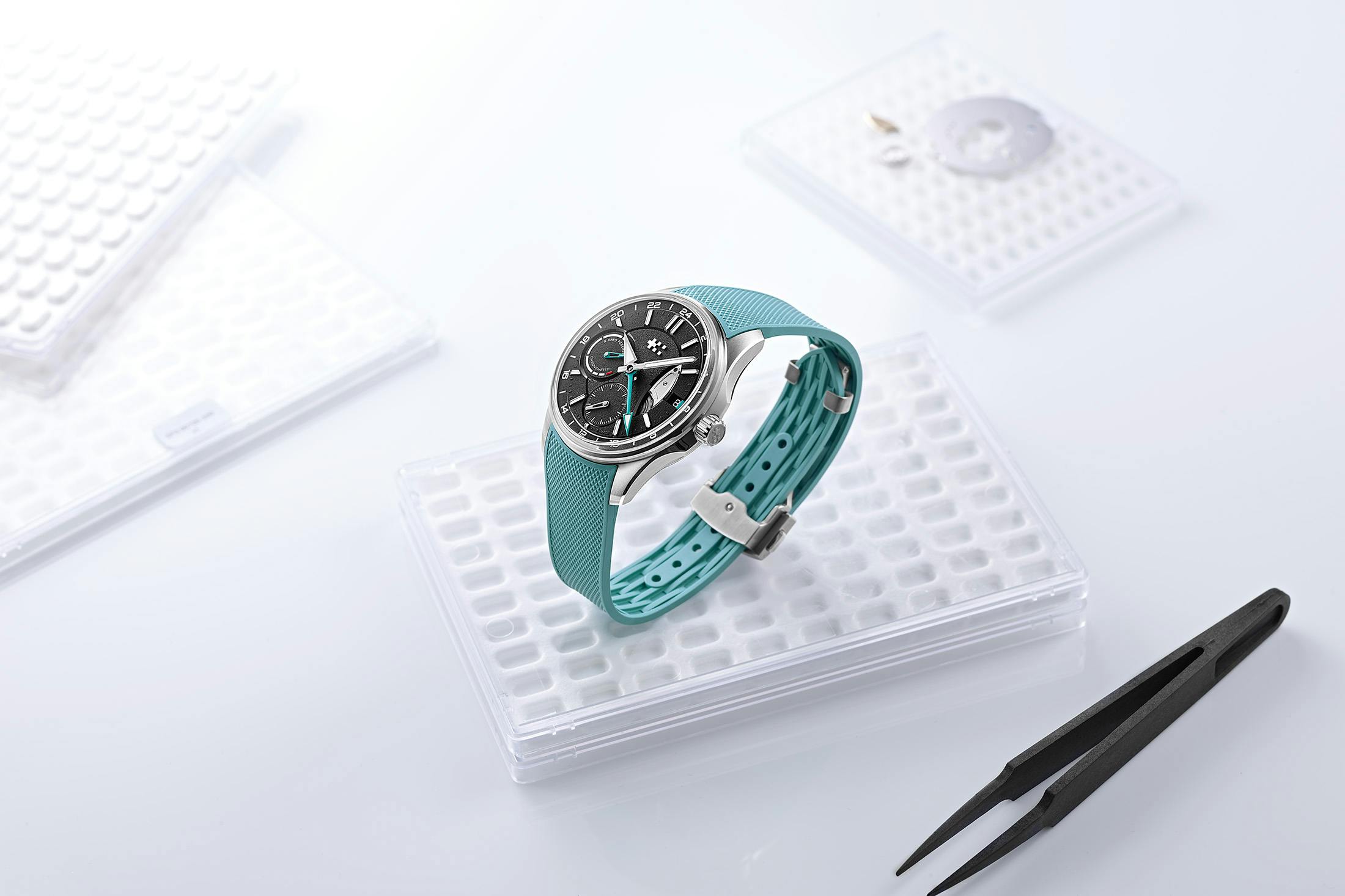 ダイヤルはオレンジのGMT針を備えたホワイトとシルバーのダイヤルと、ライトブルーのGMT針を備えたブラックのダイヤルの2種類が用意されている。ブレスレットは、ブランド独自のプッシュボタン式マイクロアジャスト機能を搭載したSS製、またはオレンジもしくはライトブルーのラバーストラップにデプロワイヤントクラスプを組み合わせたものから選べる。