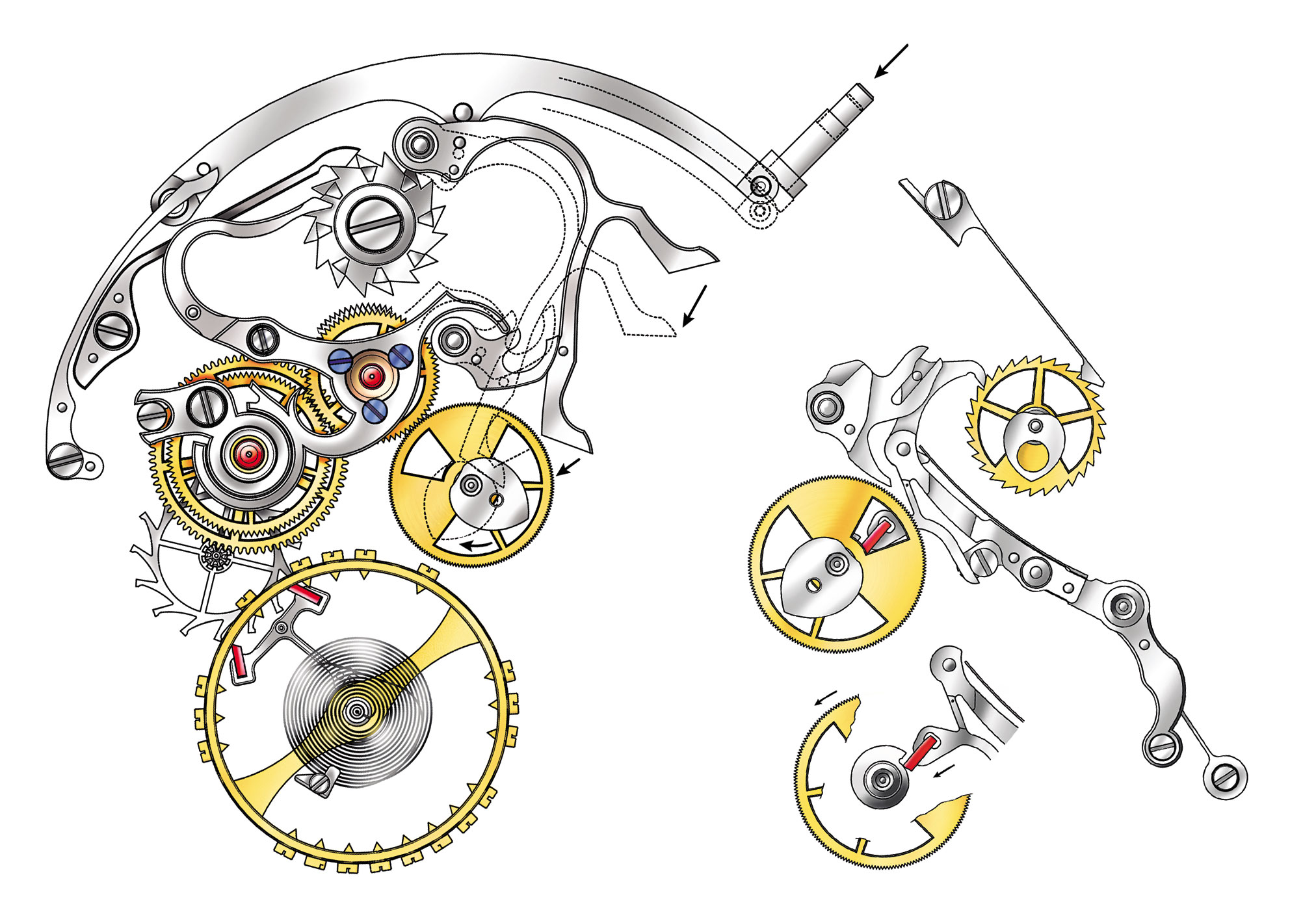 ダトグラフ・ムーブメントのクロノグラフ部品。(左)クロノグラフの駆動ギアとリセットアクション、(右)インスタント・ジャンピング・ミニッツカウンター操作時の作動図。