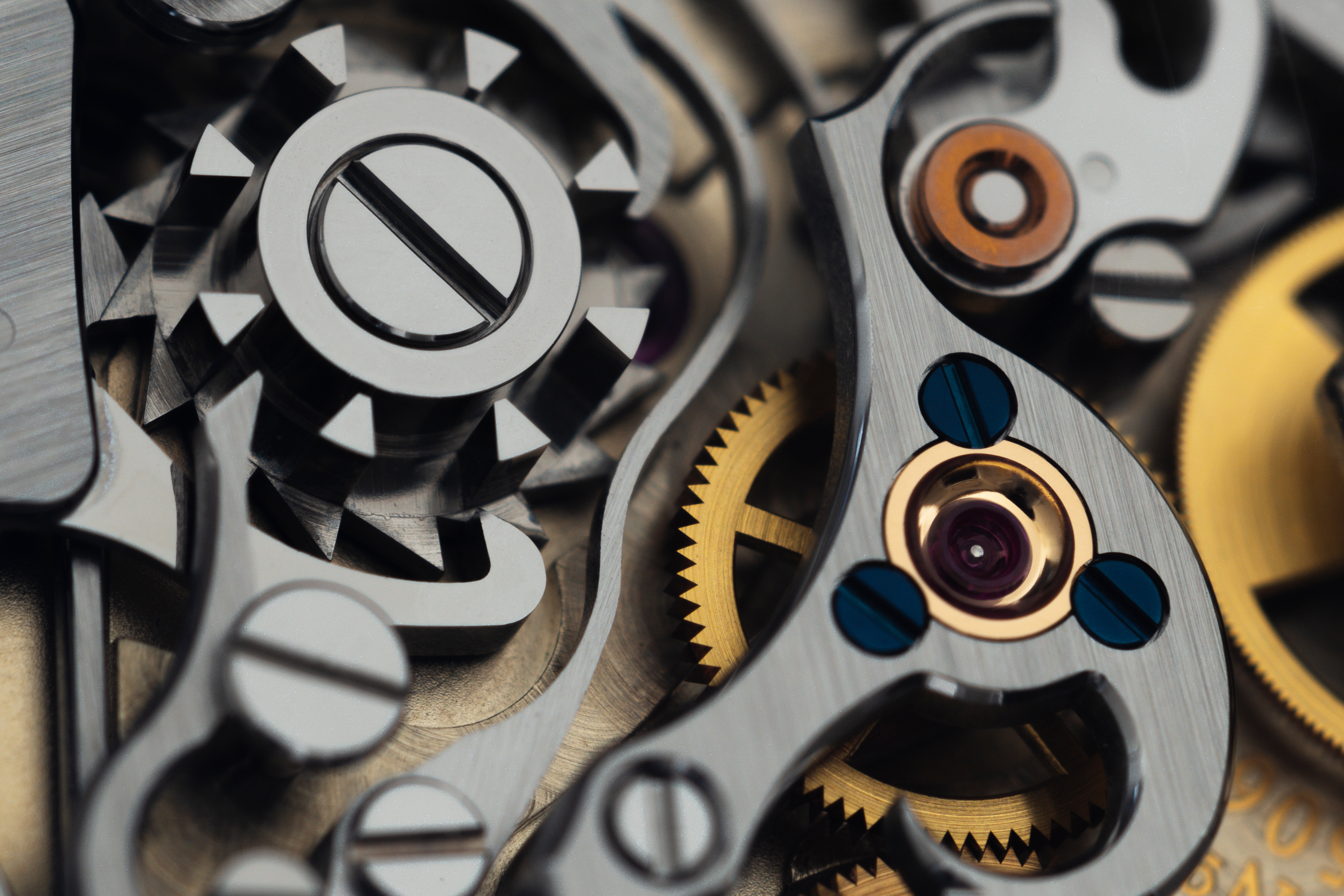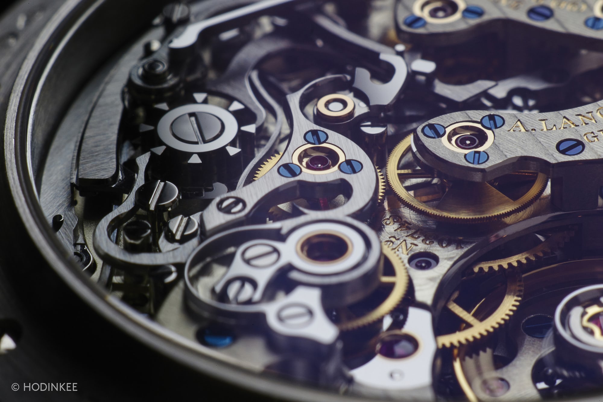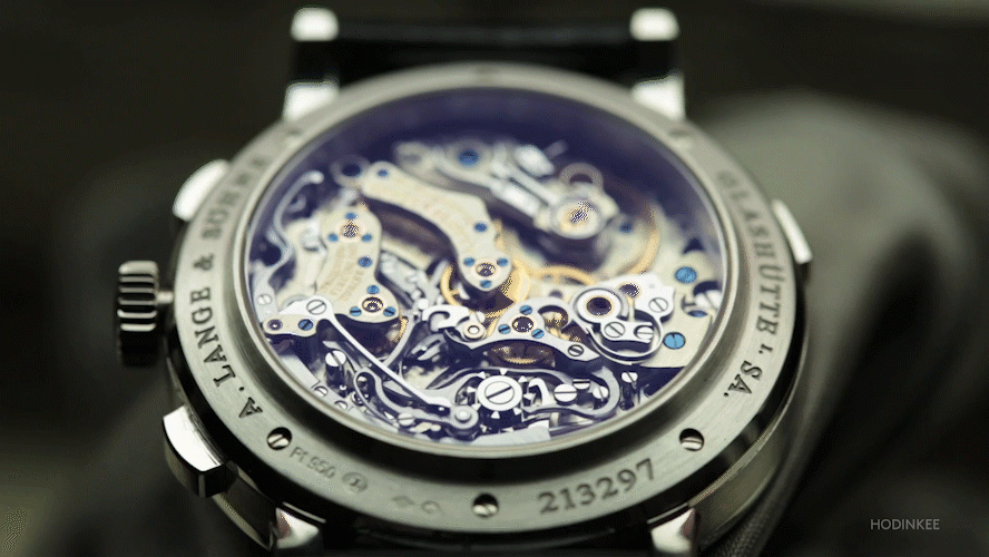 最終的に完成したのは405個の部品で構成されたムーブメントで、全体の直径は30.6mmだった。技術的な面白さもさることながら、このムーブメントは視覚的にも楽しめるものとなっている。フライシャー氏は、歴史的な懐中時計のクロノグラフムーブメントからインスピレーションを得て、このムーブメントの審美性に貢献したとHODINKEEに語った。もちろん、緻密にポリッシュ仕上げされたスティール部品、鏡面仕上げされたゴールドのねじ込み式シャトン、青焼きされたネジやムーブメントの随所にセットされた宝石の鮮やかな色彩と対照的に、ジャーマンシルバー製のブリッジやプレートからも、ランゲ独特の風格が感じられる。このムーブメントは驚くべき立体感を備えており、ミニチュア・メトロポリスのようだと形容されることもあるほど、上から見るとまるで微小な都市を見下ろしているかのように錯覚する。