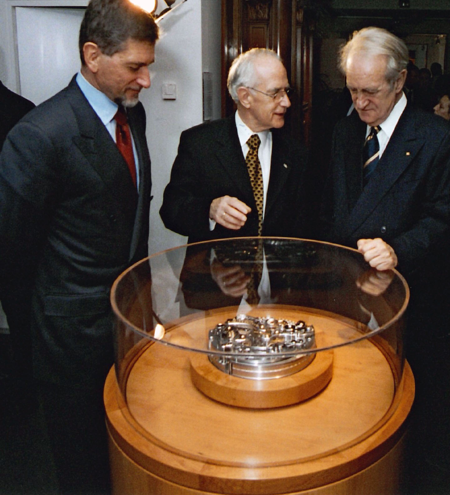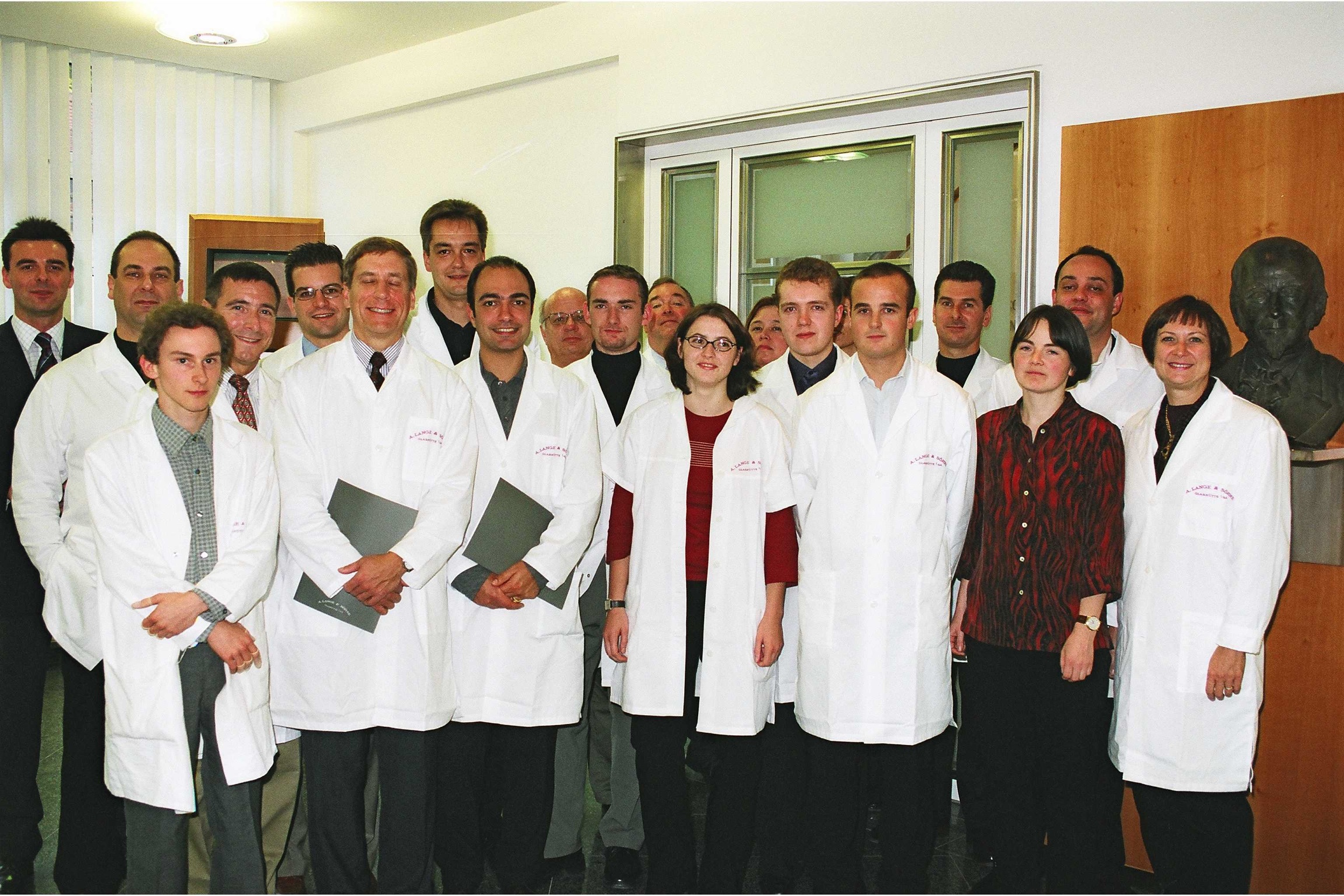 2001年に初めてランゲの製造工場を見学した際のプレスツアー。参加者全員がダトグラフを購入した。インタビューを受けたウィリアム・マッセナは、前列右から2番目の赤と黒のブラウスを着たアネグレット・フライシャーの後ろに立っている。