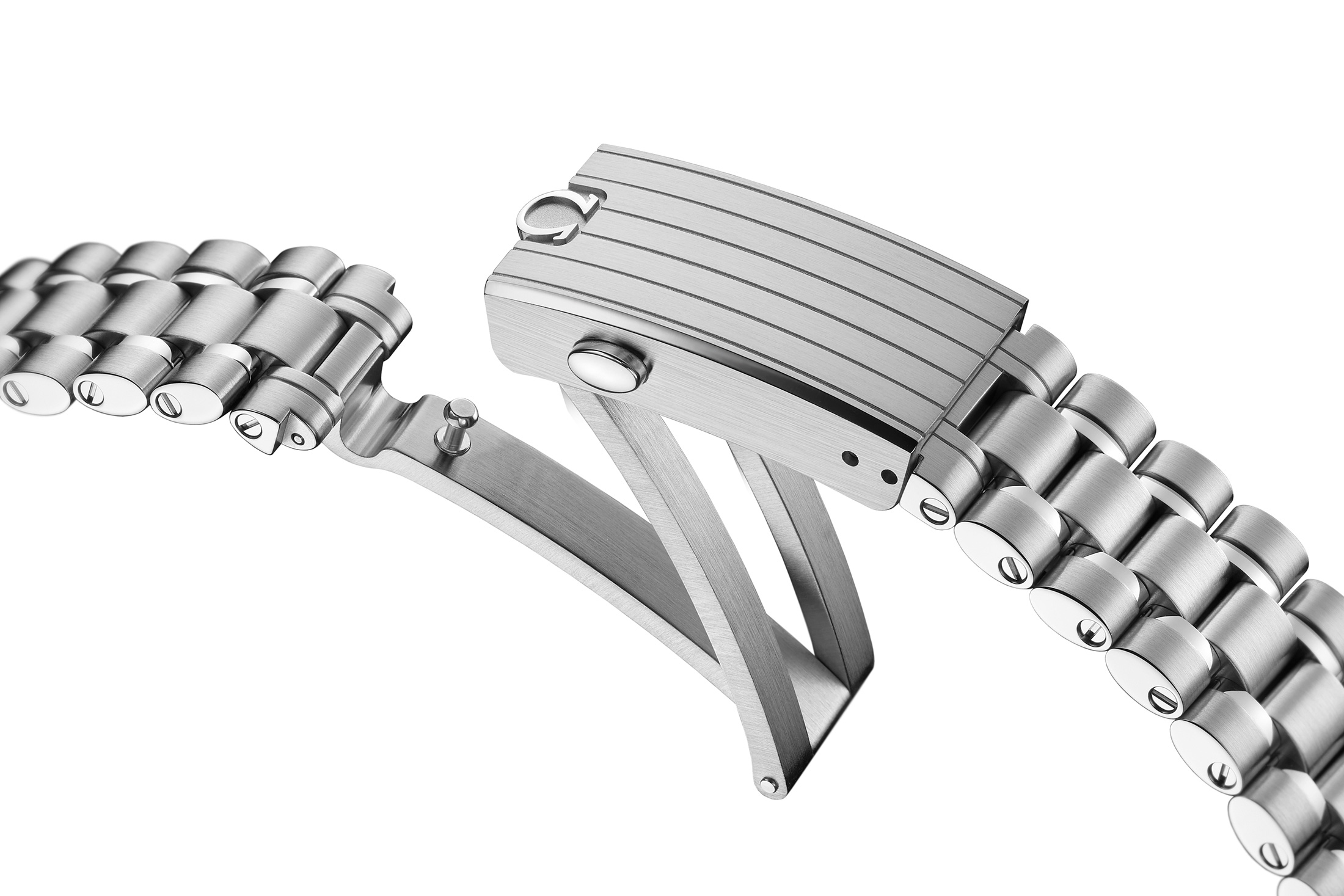 スピードマスター プロフェッショナルのためにテーパードのきいた(20mmから15mmへ)新しい5連のスティールブレスレット。クラスプのデザインも更新された(この画像は、サファイア風防バージョンに見られるポリッシュ仕上げのもの)。