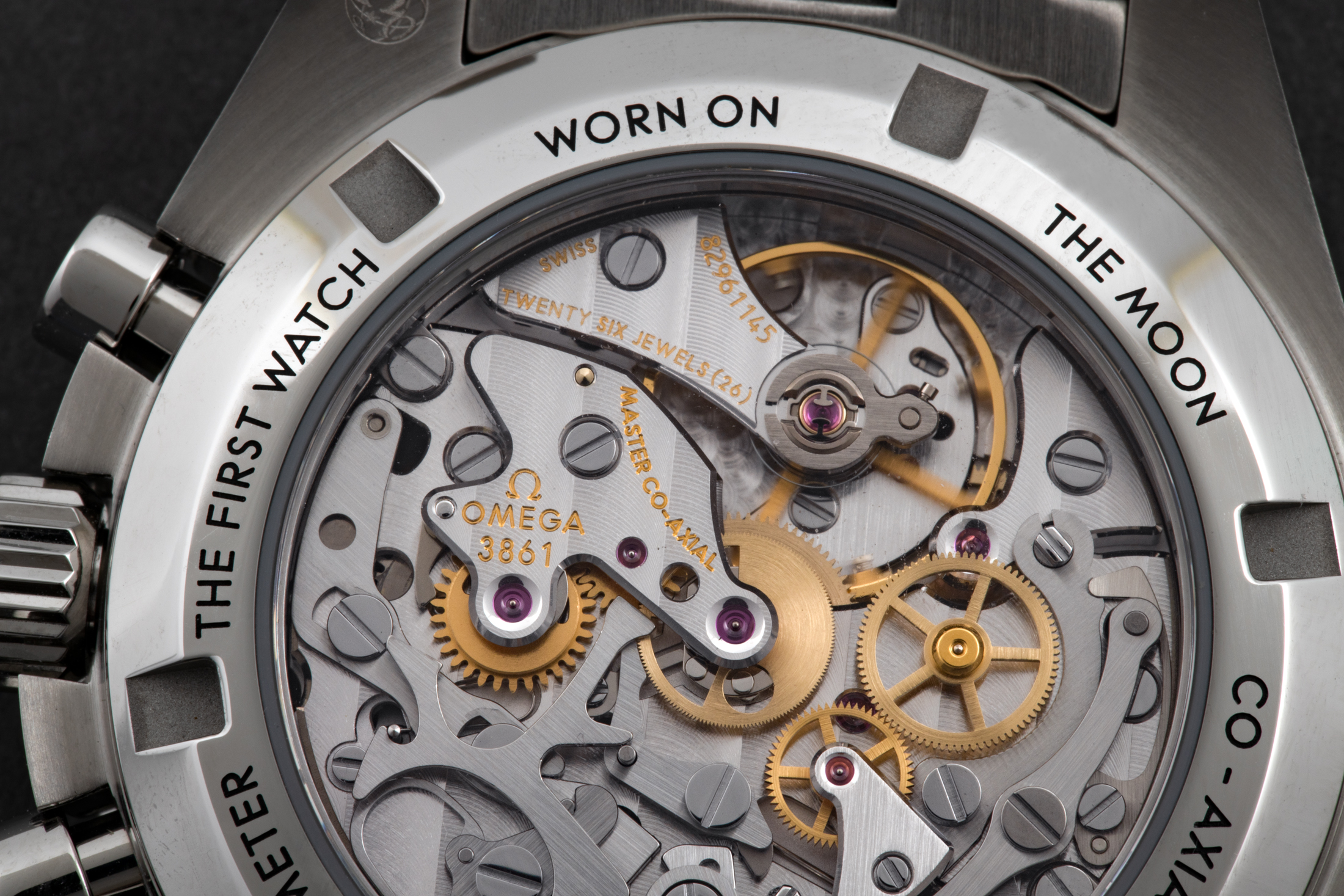 廃盤となるサファイア1861のスピーディが“The First Watch Worn On The Moon”とあったのに対して、3861は“Co-Axial Master Chronometer The First Watch Worn On The Moon”と書かれており、オメガのサインはムーブメントの中央にあるお馴染みのブリッジに移されている(“3861”、“Master Co-Axial”の文字と並んでいる)。