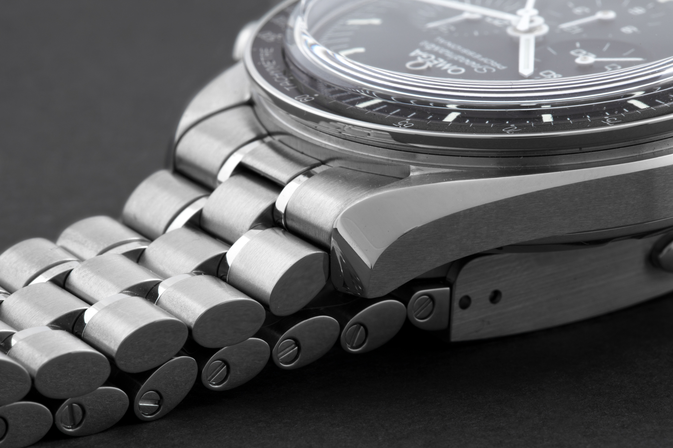ポリッシュ仕上げが施されたセンターリンクは、このスピードマスター プロがサファイア風防を搭載したモデルであることを示している。