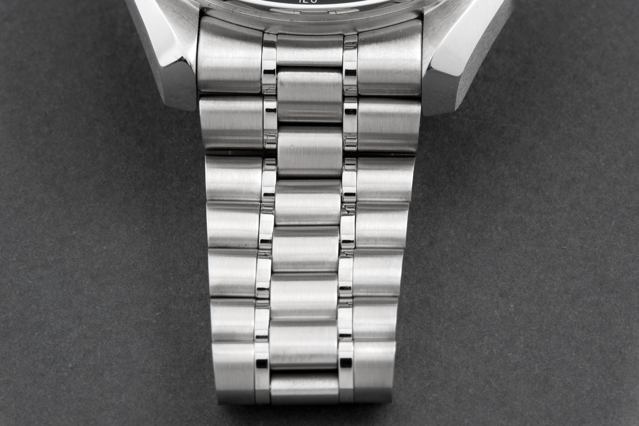 このブレスレットは、新世代向けとしてデザインと仕上げの全てがアップデートされているため、違いが明白な部分だ。Cal.1861モデルのボンド風な幅広のセンターリンクとセンターポリッシュエレメントのペアはもう存在しない。新しいヘサライトCal.3861モデルのブレスレットは、力強いテーパード(20mmのラグからクラスプの15mmまで)がきいており、新しい5連のねじ込み構造に加えて、新しいフォールディングクラスプは、エングレービングされたロゴ、ストライプの仕上げ、2ポジションのマイクロアジャスターを備え、完全にブラッシュアップされている。最後に、フラッシュフィットのタブを使用してラグのエッジに合わせる必要がなくなるなど、デザインが一新されている。