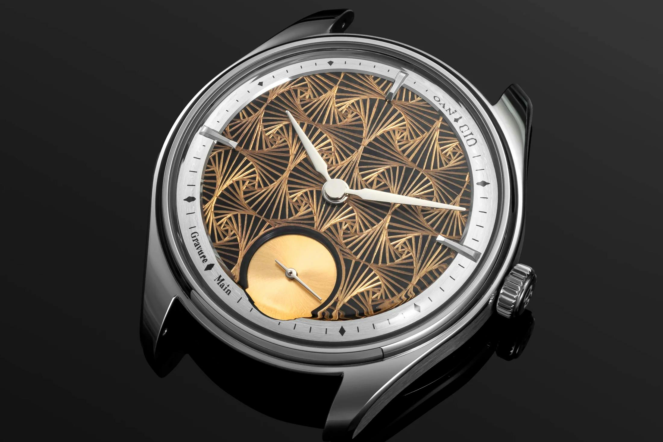 オアン・ジオ(Oan.Gio)のギンコーは好例だ。同ブランドは、現地の工芸技法を機械式時計の表現へと置き換えることに重きを置いている。装飾として伝統を借りるのではなく、手彫りや素材の表情そのものを時計の主役に据えている。ニッケルコーティングを施した真鍮ダイヤルに、銀杏の葉を思わせる幾何学模様を職人が手彫りで刻み込み、機械では再現しにくい立体感と陰影をつくり出す。ケースは40mm径、厚さ10.7mmの316LSS製で、ムーブメントはETA/Unitas 6498-2をベースに仕立てた手巻きキャリバー。彫金の表情だけでなく、裏からのぞく4分の3ブリッジや面取りまで含めて見せるつくりとなっている。価格は仕様によって1995〜2690ドル(日本円で約30万〜42万円)程度だ。