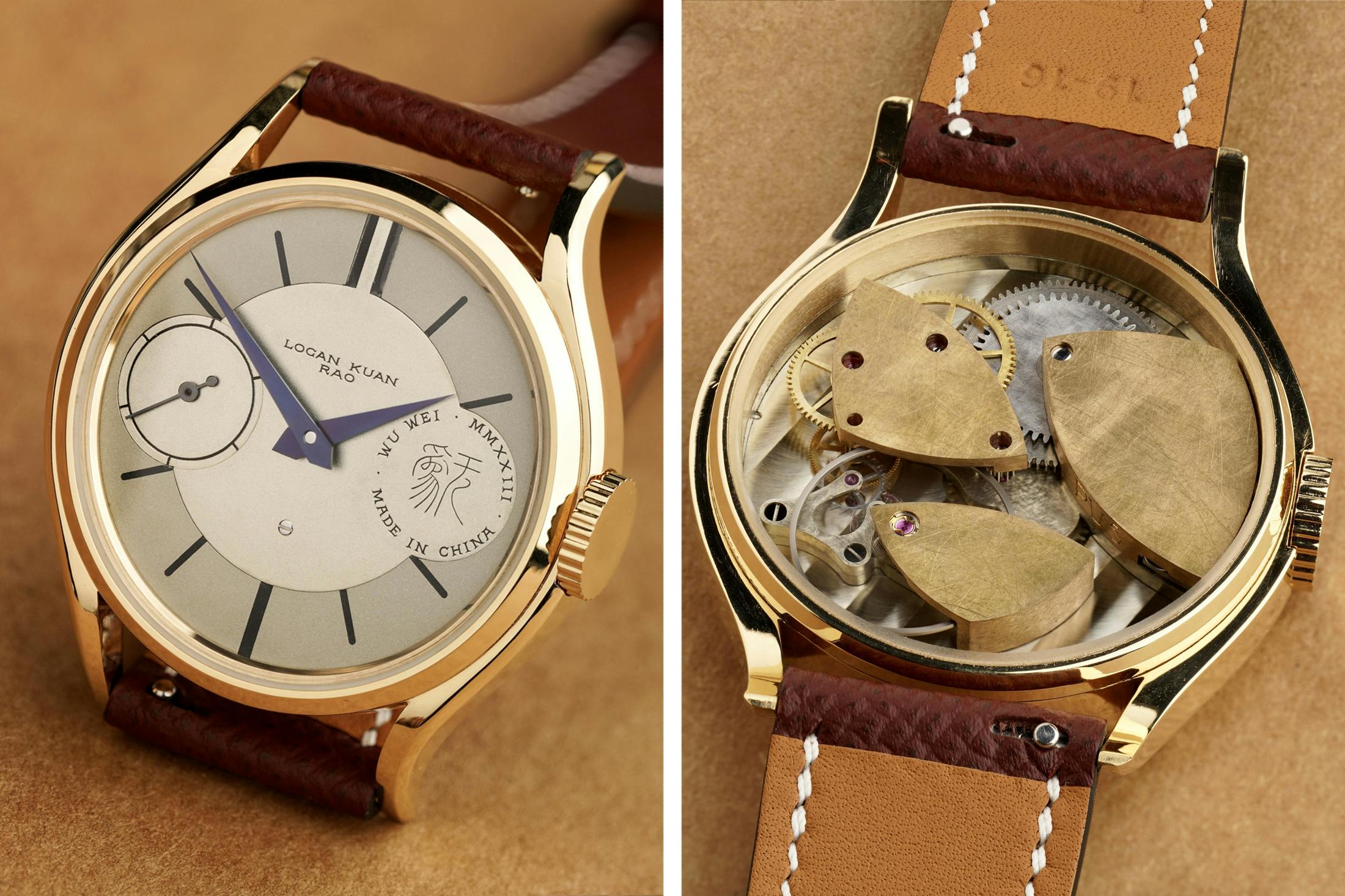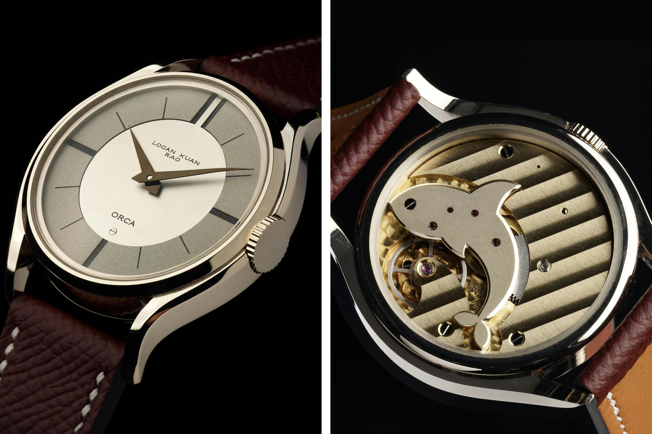 ローガン・クアン・ラオ(Logan Kuan Rao)は、さらに個人的なスケールで中国の可能性を押し広げる。中国・広州を拠点とする彼は、設計から製造、仕上げ、組み立てまでをひとりで担う文字通りの独立時計師だ。出世作であるオルカは、クジラが海面を破って現れる姿をムーブメントの輪郭と仕上げで表現し、面取りやジュネーブストライプ、ペルラージュで波や飛沫まで描き分けた。続く37.5mmケースのウーウェイ(老子の無為/むいという意)は、複雑機構や過剰な装飾に頼らず、地板と受けの形や奥行き、比率そのもので美しさを見せる作品だ。彼が特許を取得したイコールプッシュ脱進機はジョージ・ダニエルズのコーアクシャルを発展させ、テンプに力を与える押し方をより均一に、ムラなくしようとした研究成果で、試作機アイスバーグに実装された。量産モデルのウーウェイ自体はスイスレバー脱進機を採るが、その探究の過程が彼の時計全体の説得力を高めている。オルカの当初価格は約1万9000ドル(日本円で約300万円)であり、ほかのモデルの価格は要問い合わせだ。