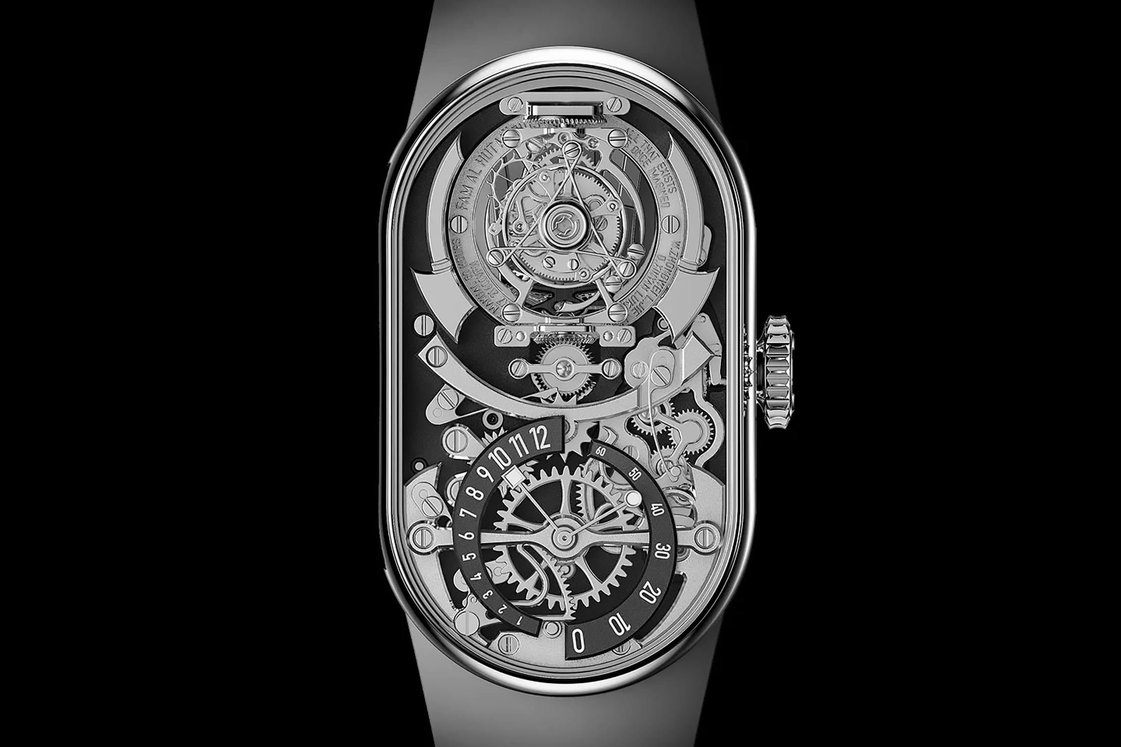 そのなかで際立つのが、重慶発のファム・アル・ハット(Fam Al Hut)である。代表作メビウスは、42.2×24.3mmのラグレスケースに自社製手巻きCal.M-01Tを収め、2軸トゥールビヨン、ダブルレトログラード表示、ジャンピングアワーを組み合わせた。トゥールビヨンケージ自体をメビウスの輪のような造形に仕立て、時間と空間の無限循環というテーマを視覚化しているのも特徴だ。しかもこの構成を、36〜38mm級の装着感に近いコンパクトなフォルムへ収めた点がおもしろい。2025-2026年のルイ・ヴィトン ウォッチ プライズ フォー インディペンデント クリエイティブズでファイナリストに選出されたことも、その技術力の高さを物語る。価格は2万6620スイスフラン(日本円で約540万円)。