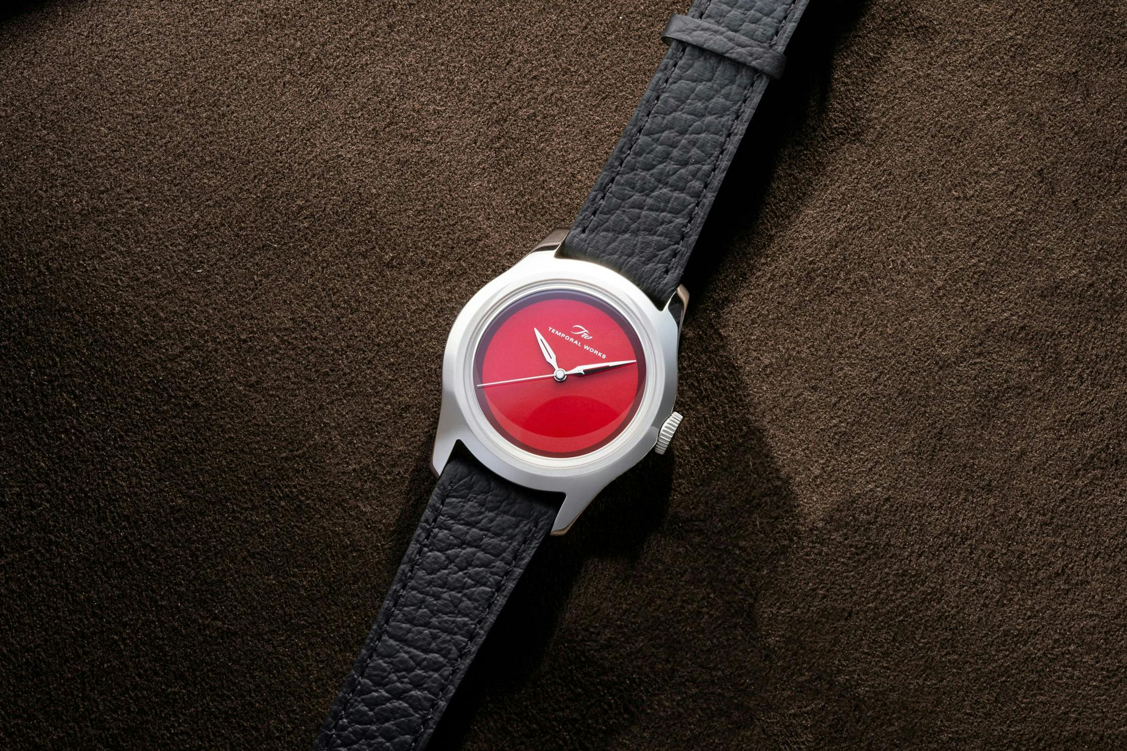 2025年に登場したテンポラル・ワークス(Temporal Works)はその好例だ。香港とニューヨークに店舗を構えるアーモリーのマーク・チョー氏とエリオット・ハマー氏が手がける同ブランドは、“時計界のネイビーブレザー”を掲げる。つまり、変わったデザインや機構で目を引くのではなく、長く着け続けられる普遍性を目指すということだ。そして企画は香港、製造は日本という分業体制をとっているのもポイント。公式サイトには、フォルムと仕上げを重視しており、日本の生産パートナーの品質を高く評価していると説明している。代表モデルであるシリーズ A フォーチュン・ウォッチは、37mm径、厚さ10mmの316Lステンレススティール製モノブロックケースに、手巻きのセリタ製SW210-1を搭載。レッドラッカーダイヤルはあえてインデックスを置かず、ファウンテンペン(万年筆)のペン先に着想を得たニブハンドやザラツ仕上げのケースで、静かなデザインのなかに質感の差をつくり込む。価格は2500ドル(日本円で約40万円)。