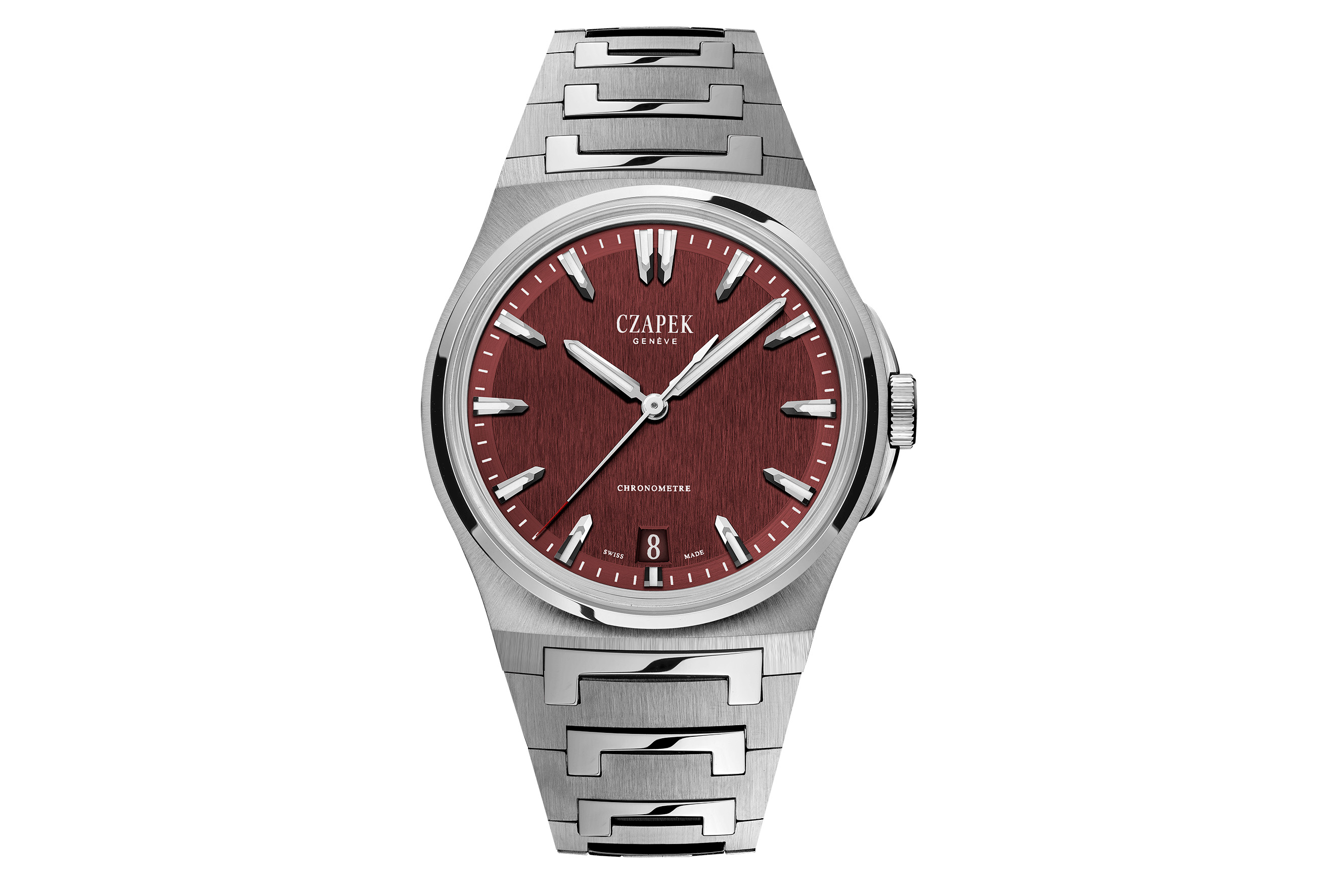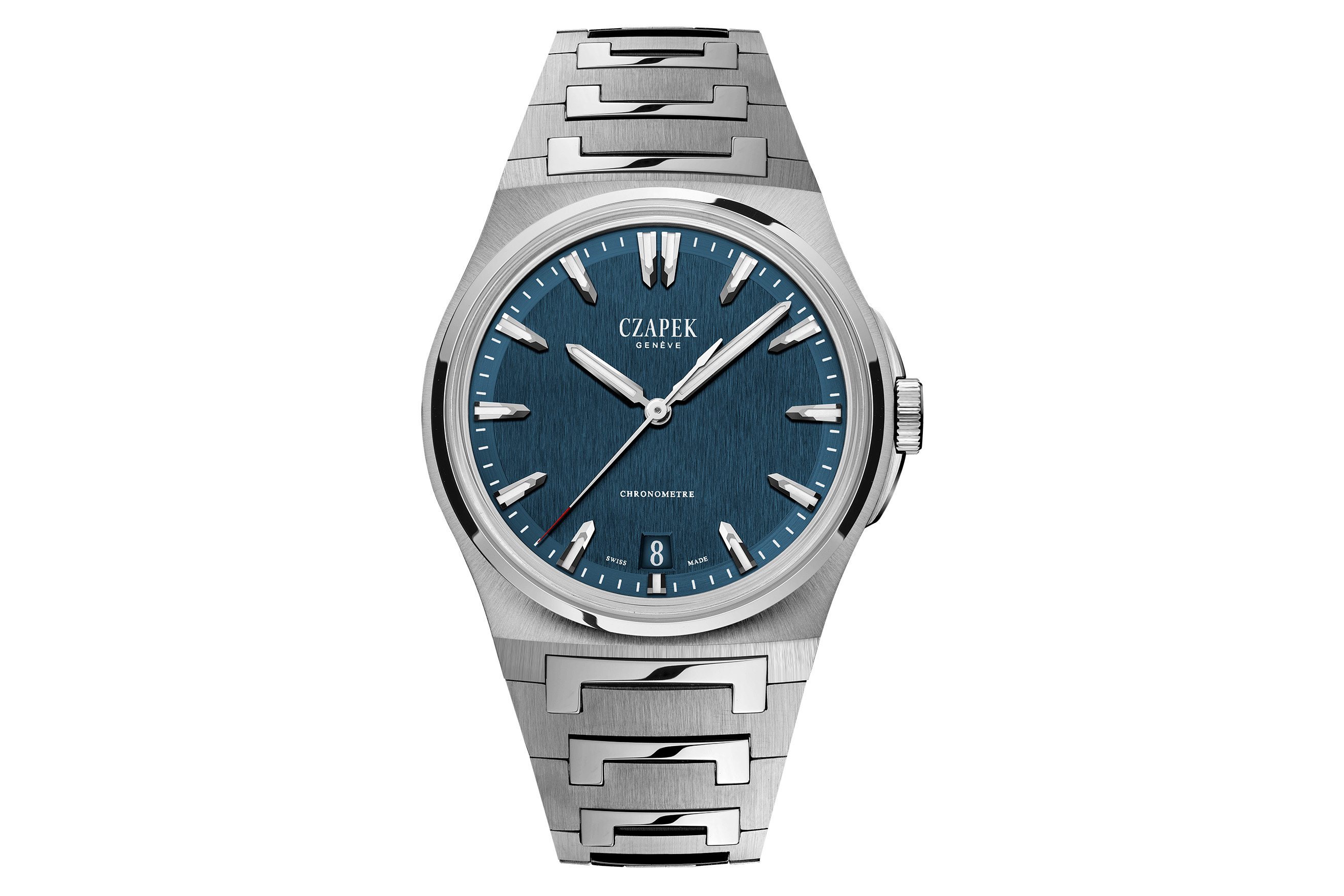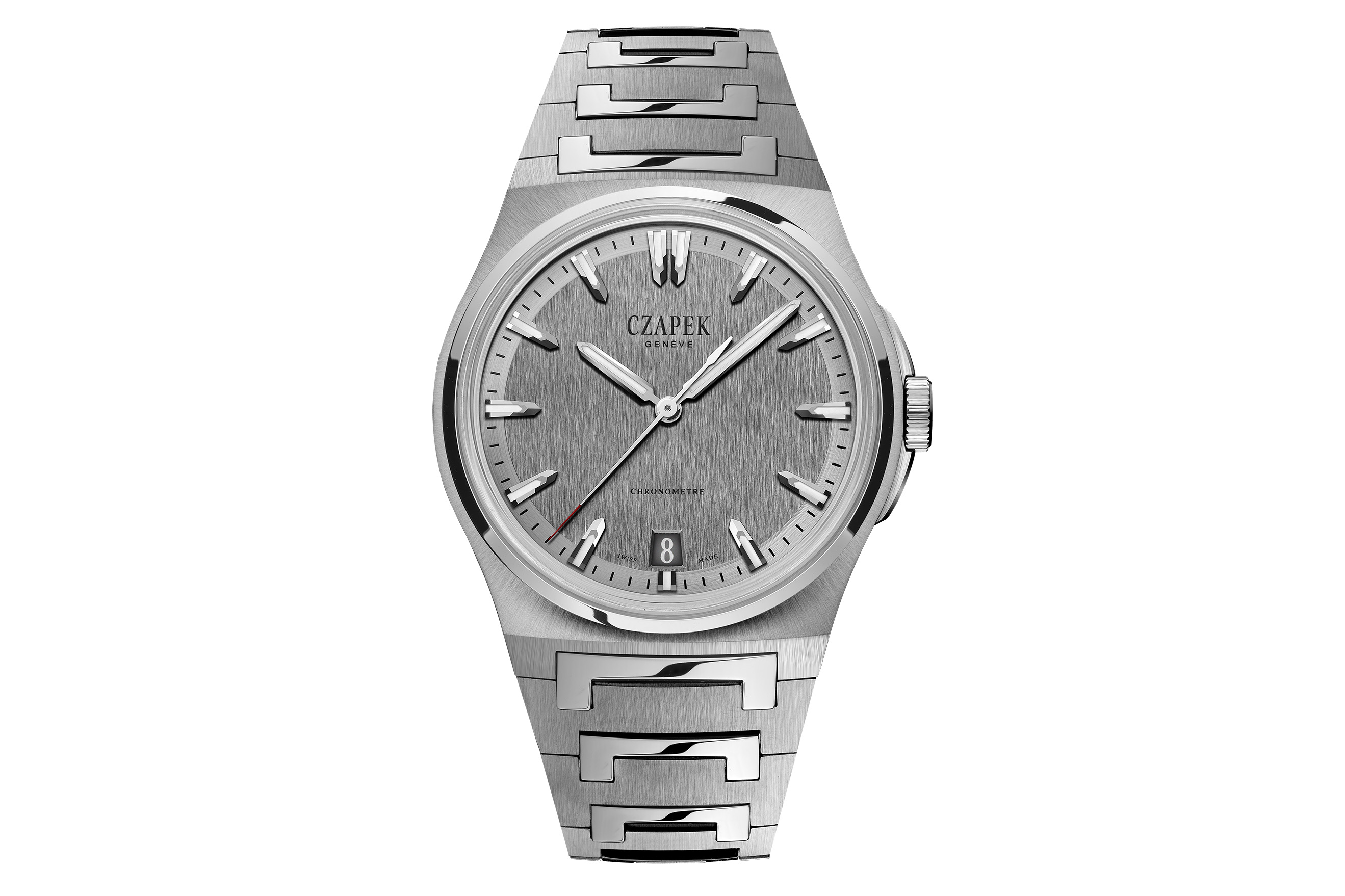 デザインの観点から見るとアンタークティックは、ステンレススポーツウォッチのジャンルに最近登場した他の全てのモデルと同様に、その原点となるモデルと比較されるだろう。特にアンタークティックの場合、比較対象はロイヤル オークに落ち着く可能性が高いと思われる。ブレスレットはロイヤル オークと視覚的効果は似ているものの、実は構造はかなり違っている。チャペックは、高度に研磨されたセンターリンクの「C」の形をしたデザインが、ブランド名の最初の文字を連想させると述べている。そしてそれは、ロイヤル オークのブレスレット同様に魅力的だ。両ブレスレットに共通する特徴である、リンクの大胆な角ばった形が、私をこのように思わせたのだと思う。