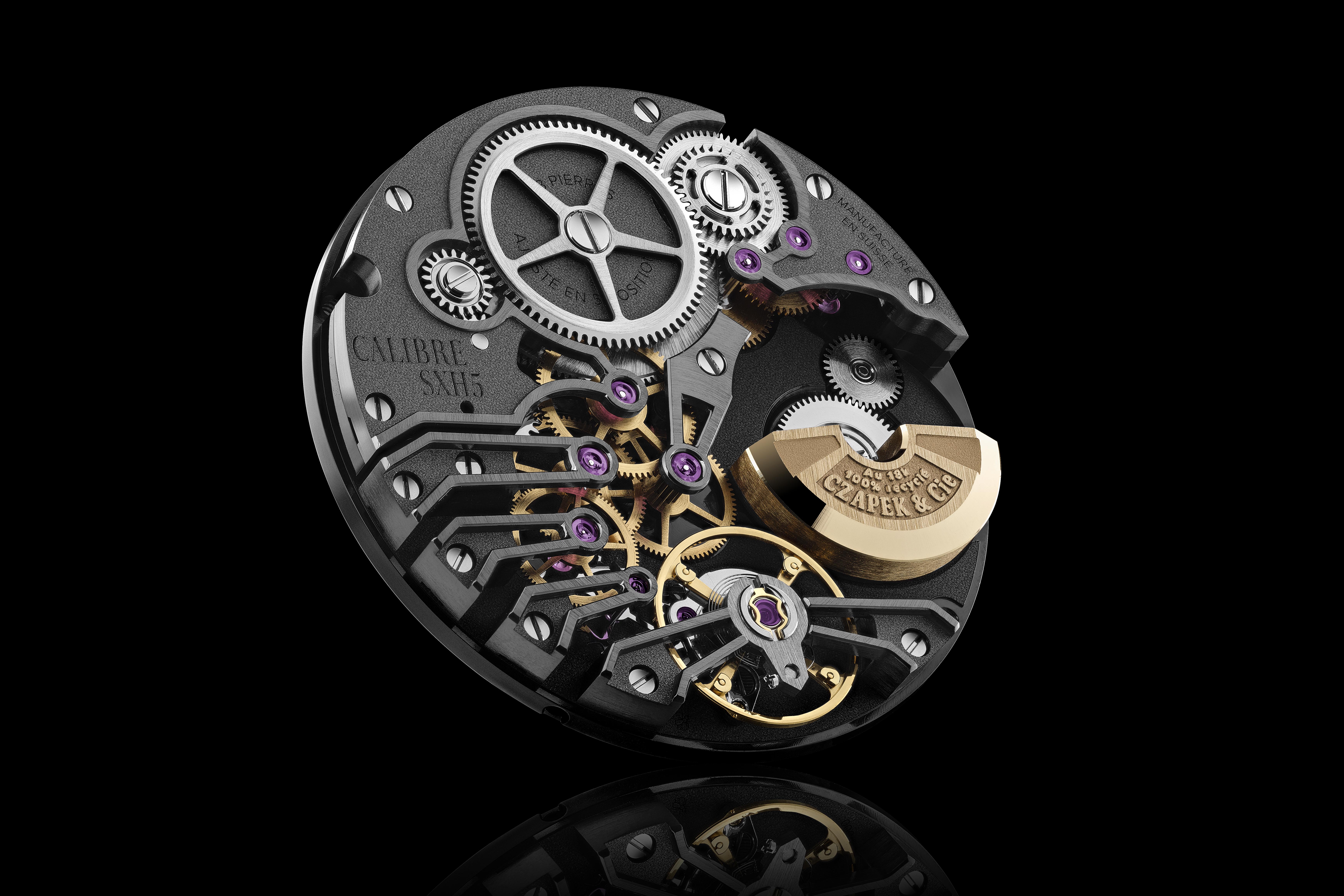 アンタークティックは、ただ新しいコレクションであるだけでなく、新型ムーブメント・SXH5の登場も意味する。SXH5は、チャペックのチームによって自社内で考案され、スイスの多くの協力者の助けを借りて完成されたムーブメントだ。このマイクロローター搭載の自動巻きムーブメントは、6つの内角に手作業で面取りを行うなど、精巧な仕上げが施されており、見た目にも印象的である。おそらくマイクロローター(完全にリサイクルされた18Kゴールド製)の後に最初に気がつくのは、19世紀の懐中時計にインスパイアされたスケルトン加工されたブリッジだろう。輪列を点検できるように開かれている。アトカルパ社が提供した脱進機は、大型の可変慣性テンプを備えている。本キャリバーは、クロノメーターの規格内に調整されている点は注目に値するだろう。文字盤に書かれていることからお気づきかもしれないが、COSCによってクロノメーター認定を受けている。アトカルパ社とその脱進機の他に、コンポーネントとムーブメントの製造パートナーとして、チャペックのプレスリリースで言及されているのは、ABプロダクト、アルコフィル、セラマーレ、クロノード、CMT -リッケンバッハ、コンブルミーン、クレリエ、ジェネラル・ルゾー、アンカ、イノデコ、MLV、MPS、ノヴァソール、プレシプロ、リーザ、ストッコらである。