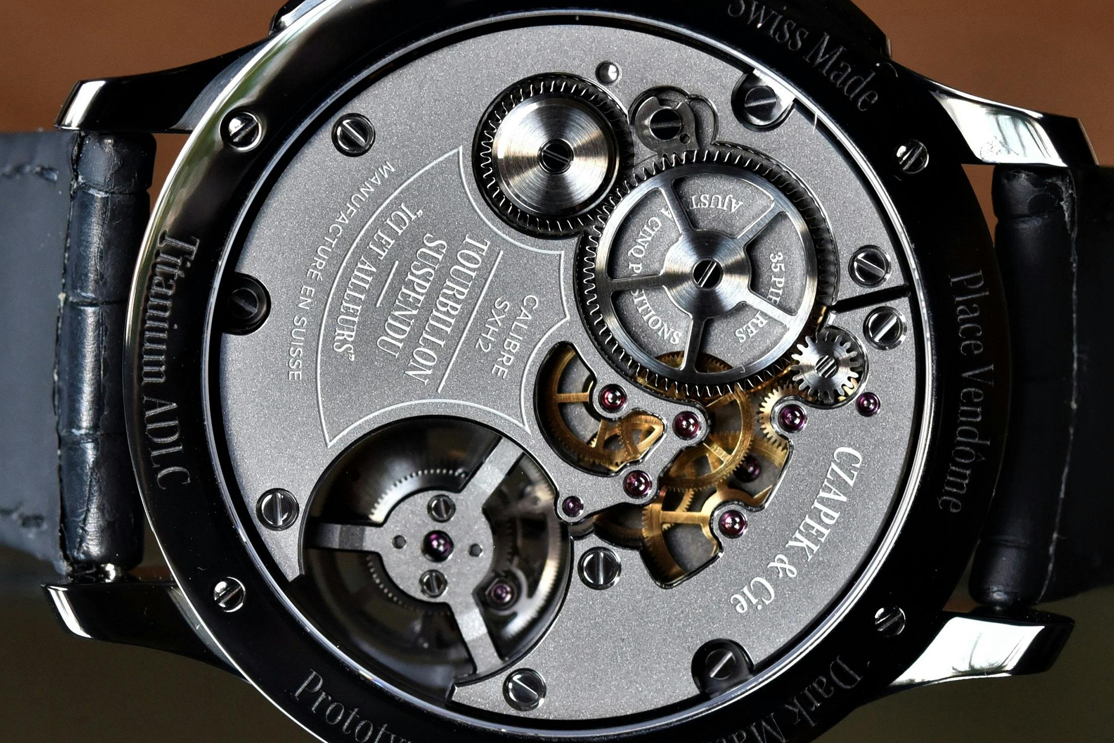 プラス・ヴァンドーム ダークマターは、ブラックADLCコーティングが施されたグレード5チタン製ケースを使用している。これと同じコーティングは、2019年のオンリーウォッチのためにチャペックが出品した、フォーブル・ド・クラコヴィ“カレッジ・エヴリ・セコンド”クロノグラフにも採用されている。今回の新作のケースサイズは43.5mmのままで、この時計は多くの点でその前身モデルと酷似しているが(こちらのプラス・ヴァンドーム サスペンド “Ici Et Ailleurs(イッシィ エ アイユー)”のハンズオンをご覧いただきたい)、ブランドはダークマターをプラス・ヴァンドームコレクションにおける反抗的なブラザーと呼んでいる。