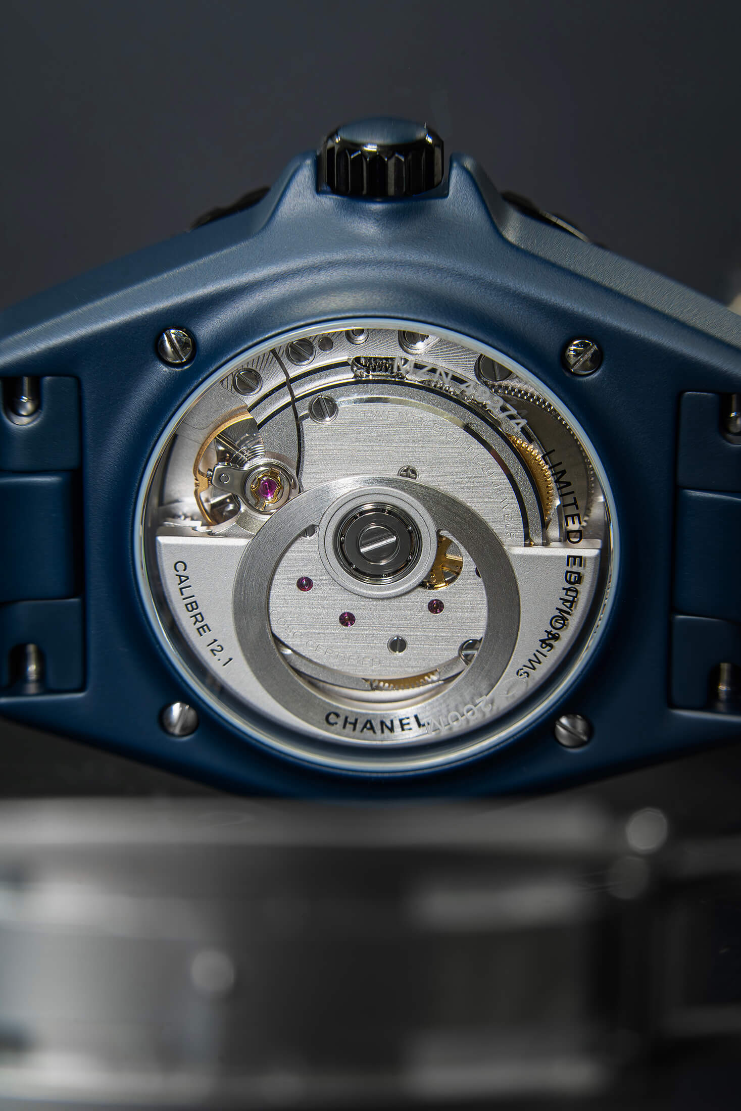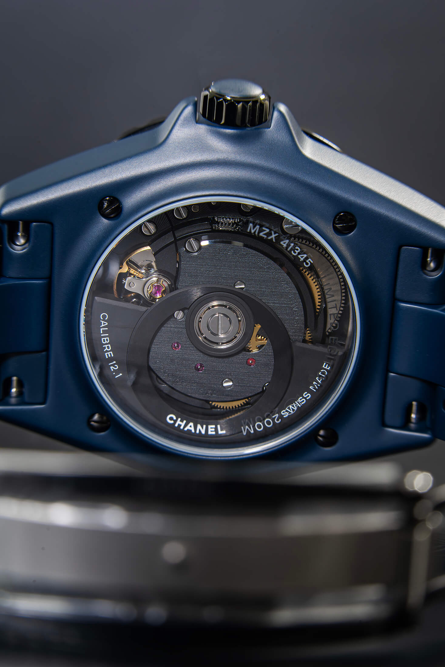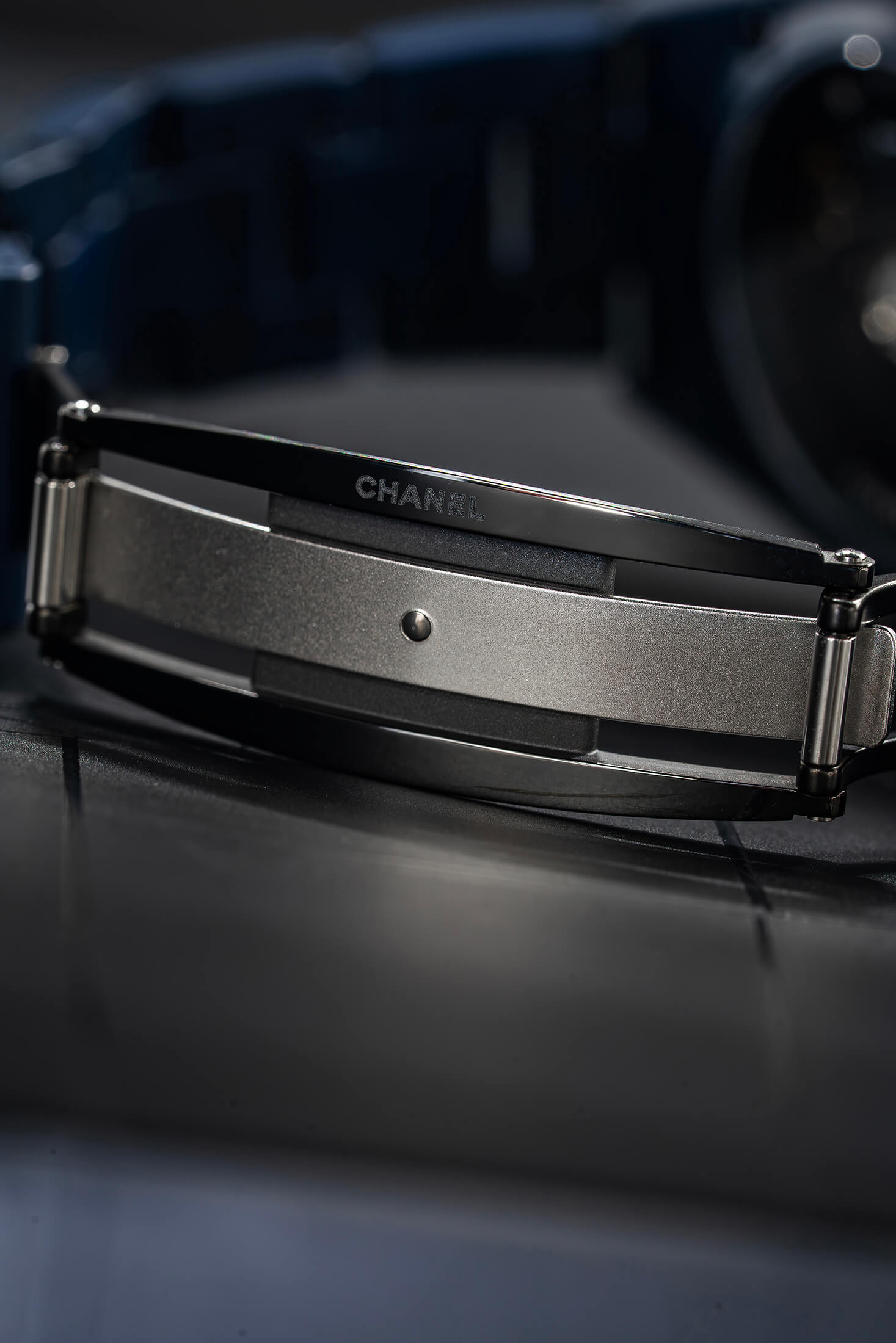 J12 BLEUはブラック、ホワイトに次ぐ新たなカラーとなったわけだが、色味はもちろんのこと、仕上げにも注目したい。ブラック、ホワイトのレギュラーモデルはポリッシュ仕上げがスタンダード。マット仕上げを採用したモデルも発表されてはいるが、基本的にハイジュエリーモデルなどの特別なものがほとんどだった。だが、J12 BLEUではマット仕上げがスタンダードである点は、これまでのJ12との小さくも見逃せない違いだろう。