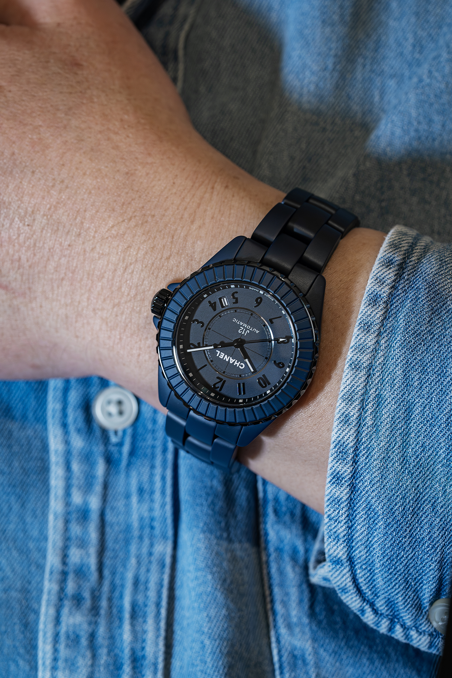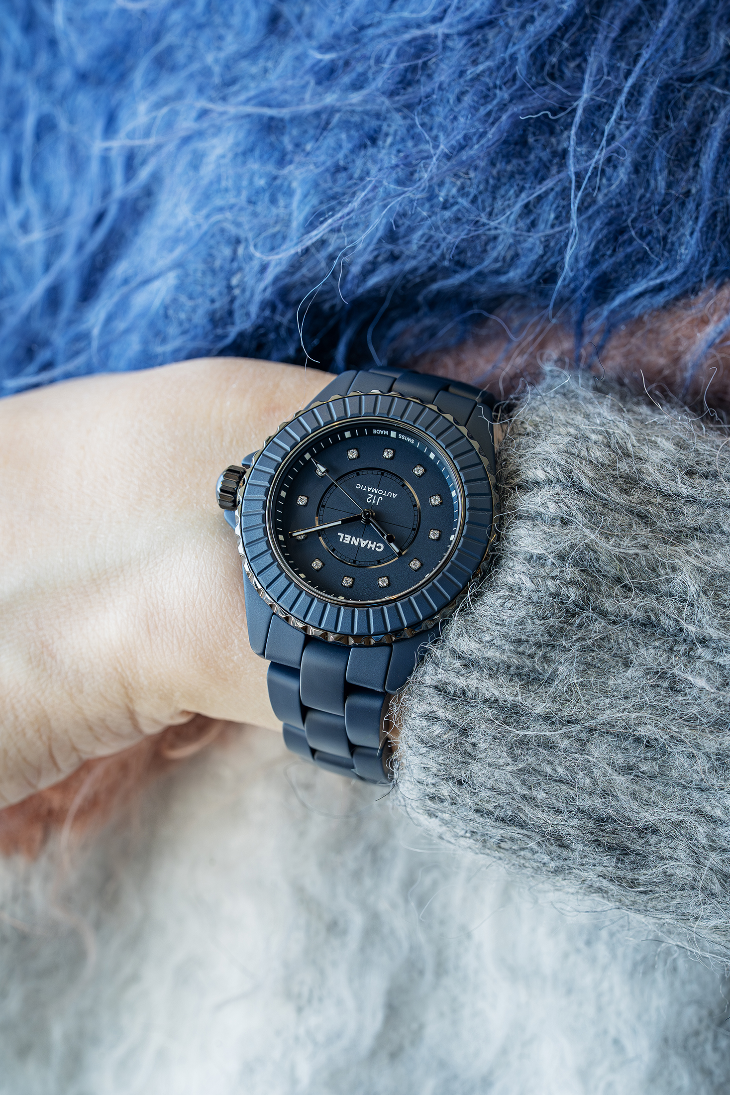 アルノー・シャスタン氏の言うように、J12 BLEUの色味はまさに深みのあるダークブルーだ。印象的なのは、マット仕上げによって繊細でありながら、爽やかさと上品さを併せ持っているところ。加えて、この絶妙な色味は光の加減で黒を思わせるようなシックな雰囲気を醸し出すこともあるし、明るいところでは優しい印象にも感じられる。男性が着ければ適度な爽やかさを、女性が着ければ程よいマニッシュな空気感を醸すJ12 BLEUは、まさにJ12の新境地を切り開くモデルとなった。