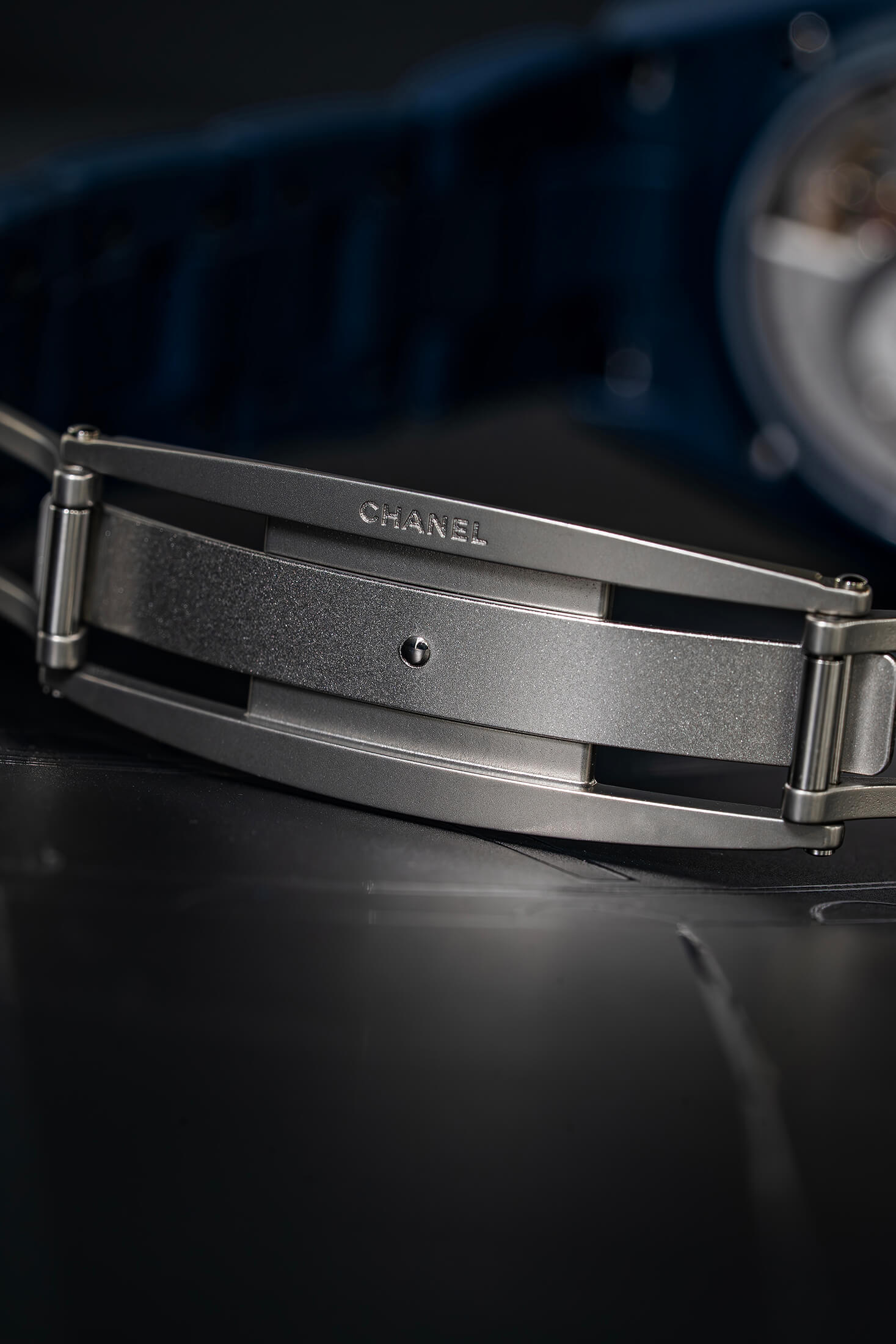 「幸いにもシャネルには、25年にわたるセラミック製造の経験と技術の研鑽があります」と、シャスタン氏は胸を張る。その期待に職人たちは応え、微妙に色味を変えた複数のサンプルピースと異なる具合のマット仕上げの組み合わせをいくつも試し、彼が求める“限りなく黒に近い青”の再現を図った。かくしてプロジェクトスタートから実に5年をかけ、ようやくブラックのJ12に光を当てたシャネル初のブルーセラミックの完成に至った。そのマット仕上げは、ベルベットのように繊細で肌触りがよく、高級感を伴っている。それを用いたJ12 BLEUには、よりブルーの深みを増すためのシャスタン氏の工夫が随所に見られる。