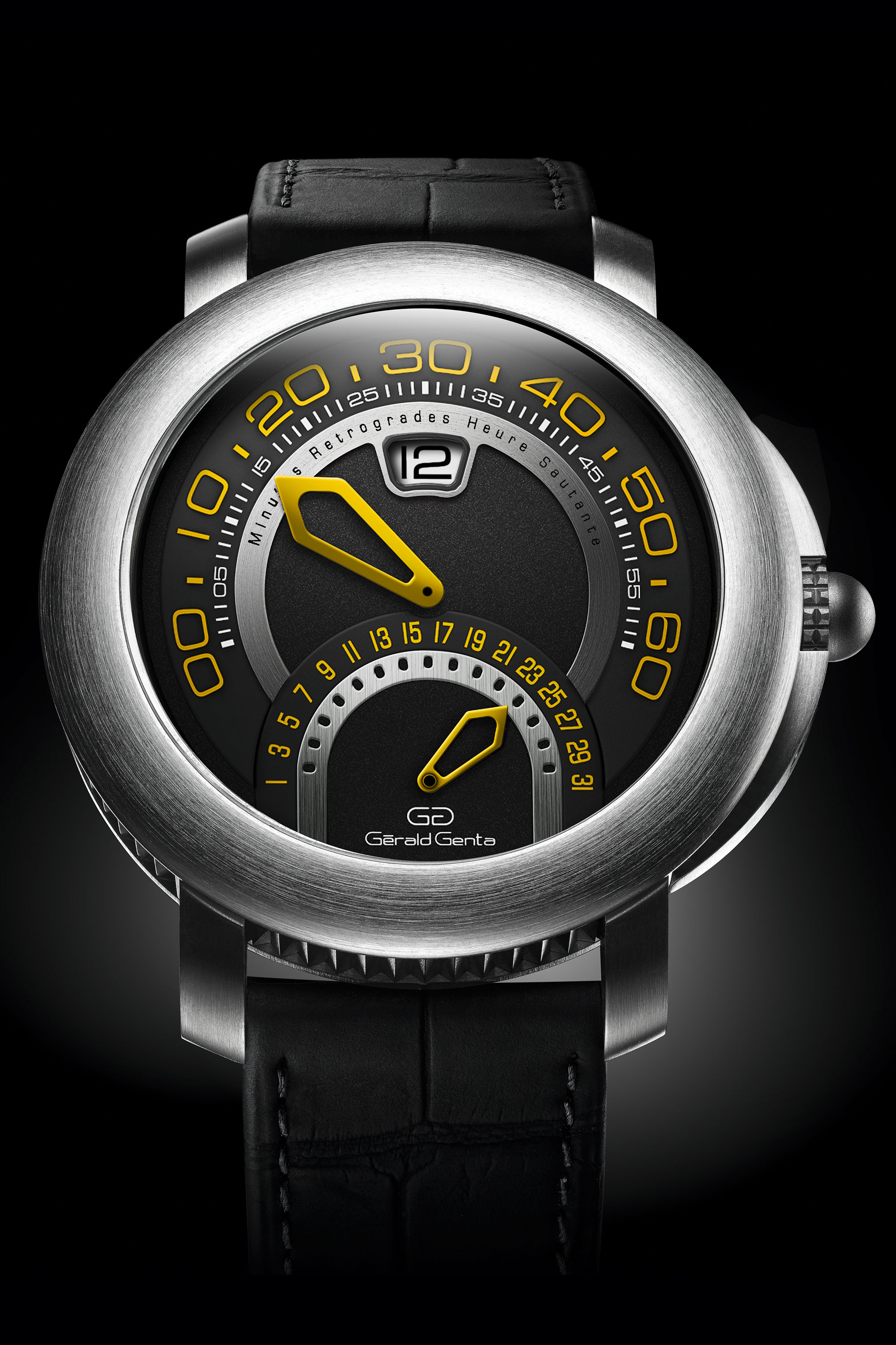 ジェラルド ジェンタが時計界に与えた影響はただならぬものがある。彼はオーデマ ピゲ ロイヤル オークやパテック フィリップ ノーチラスのデザインを手がけたことで有名だが、それだけではない。1969年に自身の名を冠したレーベルを立ち上げ、さまざまなデザインを探求した。その中のひとつがバイレトロ レイアウトを用いて2020年に復活したアリーナ バイ レトロだ。この時計は、2019年に発売された「ジェラルド ジェンタ 50周年記念モデル」に続くモデルである。どちらも、アリーナケース(実際のアリーナに似ていることから名付けられた)を採用しており、12時位置にジャンピングアワーウィンドウ、また文字盤の上半分に沿ってレトログラードミニッツがある。そして、下半分にはレトログラードデイト表示が配される。60分ごとに分針がゼロにスナップバックし、それと同時にアワーカウンターが回転し、31日ごとに日付が戻る。これは全て、内部に搭載されたCal.BVL 300による。