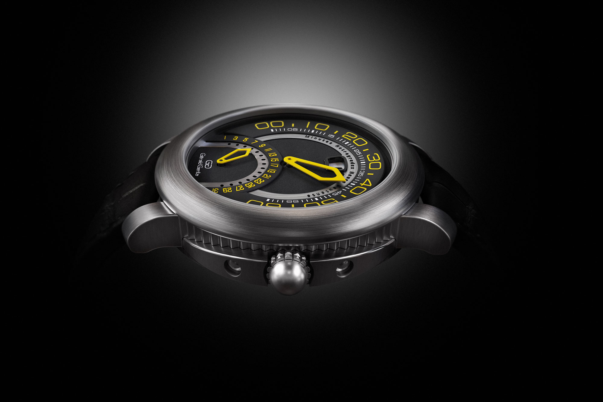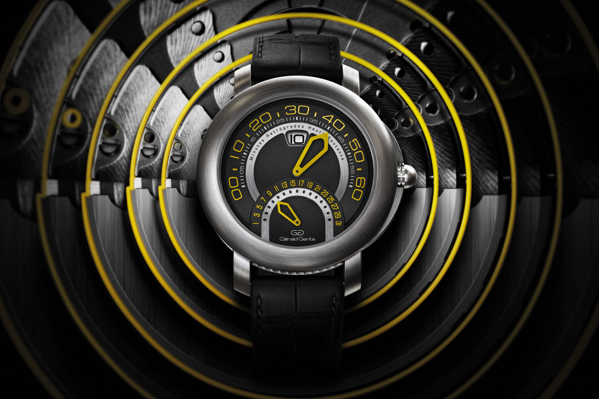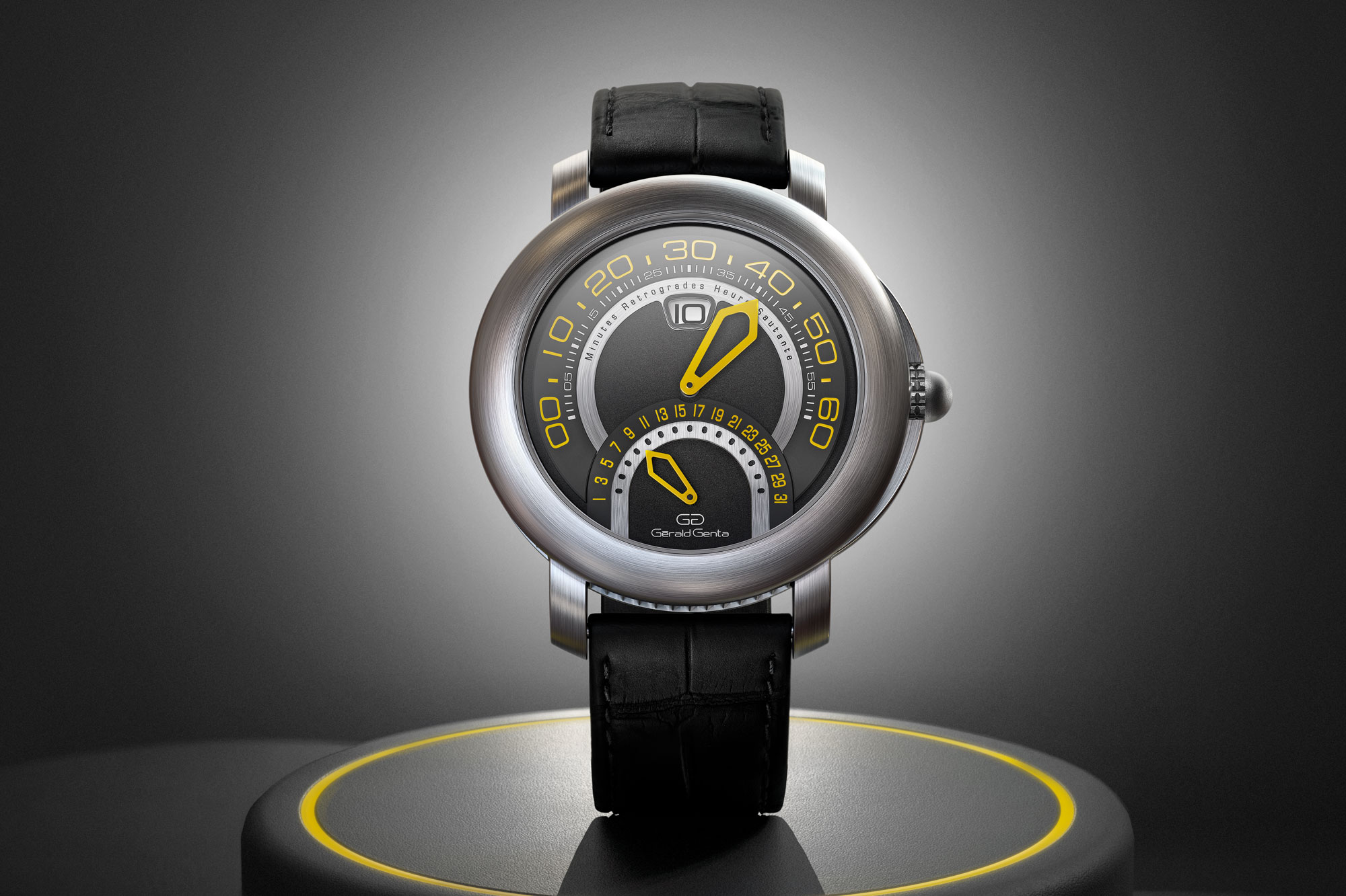 初めてジェンタがレトログラードミニッツとジャンピングアワーカウンターを組み合わせたのは1996年のことだった。それ以前にも、彼のレーベルではそれぞれの複雑機構を別々に搭載したものを作っていたが、一緒にしたものはなかった。最近は、スイスのル・サンティエにあるブルガリの工場で、ジャンピングアワーとレトログラードミニッツの両方を搭載したムーブメントを作っている。