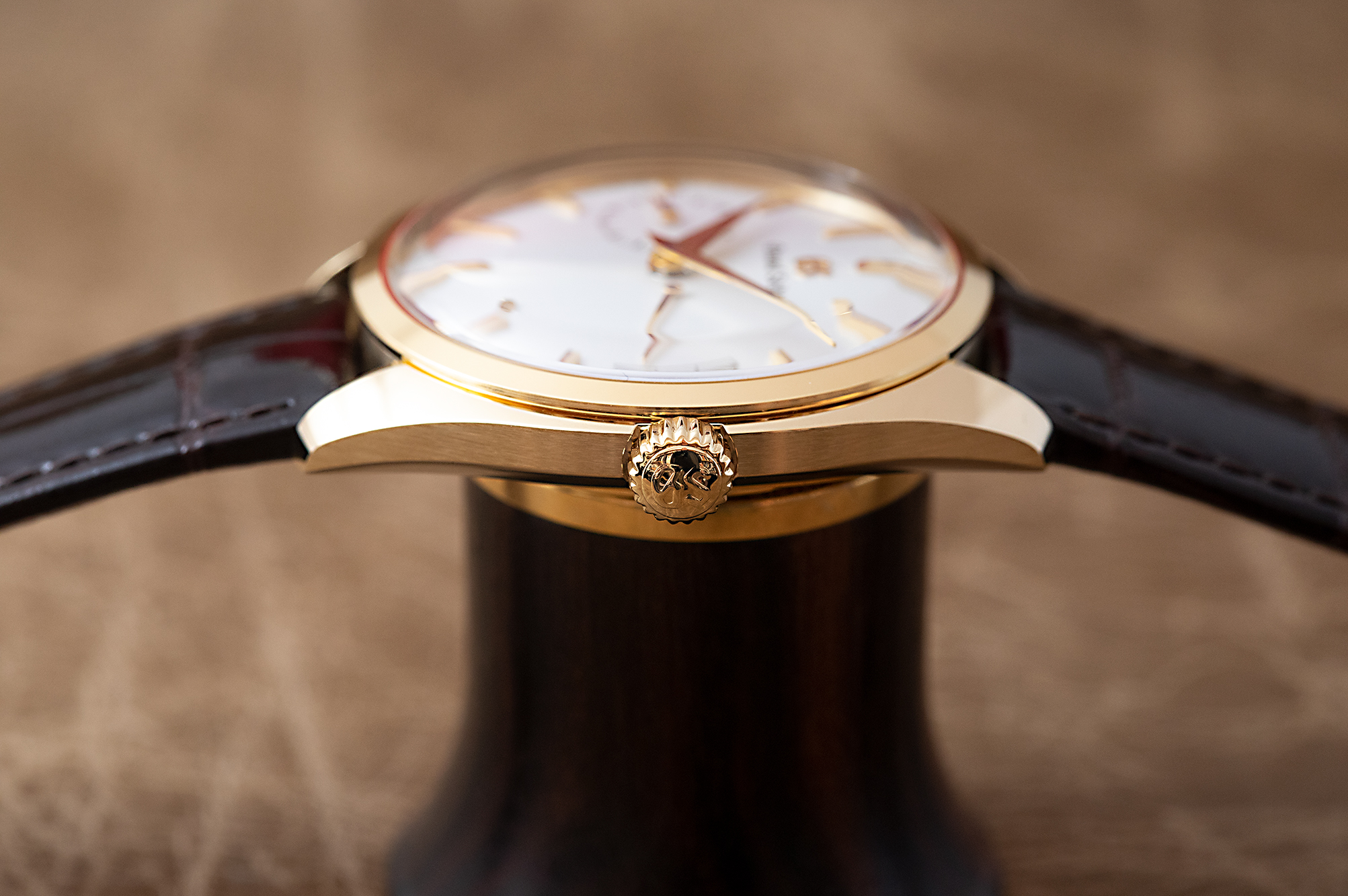 ゴールドに白い文字盤のモデルは、もはや全く別の時計のようだ。(完全に異なった仕様の文字盤と18KYGケースを備えている)。3つのモデルのうち、こちらは最もクラシックな雰囲気の仕上がりであり、パテックやヴァシュロンやオーデマ ピゲによって19世紀半ばに作られた名高い3針時計と並べても、場違いな感じはしないだろう。(これはドーム型のガラス部分と通常より薄いケースの両方のおかげだろう)。ゴールドの華やかさがグランドセイコーに添えられるとき、そこにはいつも趣深さがある。グランドセイコーが一つひとつの時計に惜しみなく与える細部への研ぎ澄まされた配慮が、SSをもはや幻の金属とみまがうほどにし、それがゴールドとのコンビネーションにより、特別で、慎み深くありつつも豪華なものとなっている。