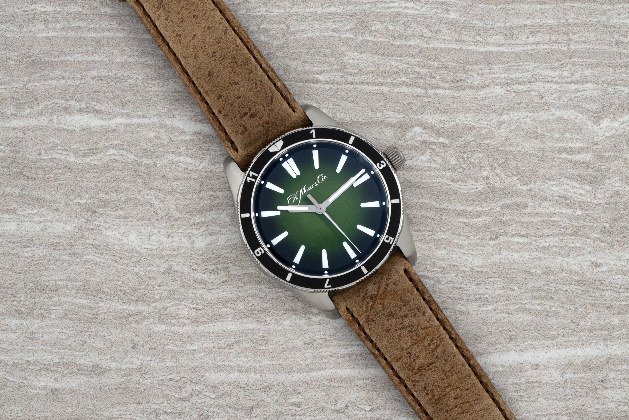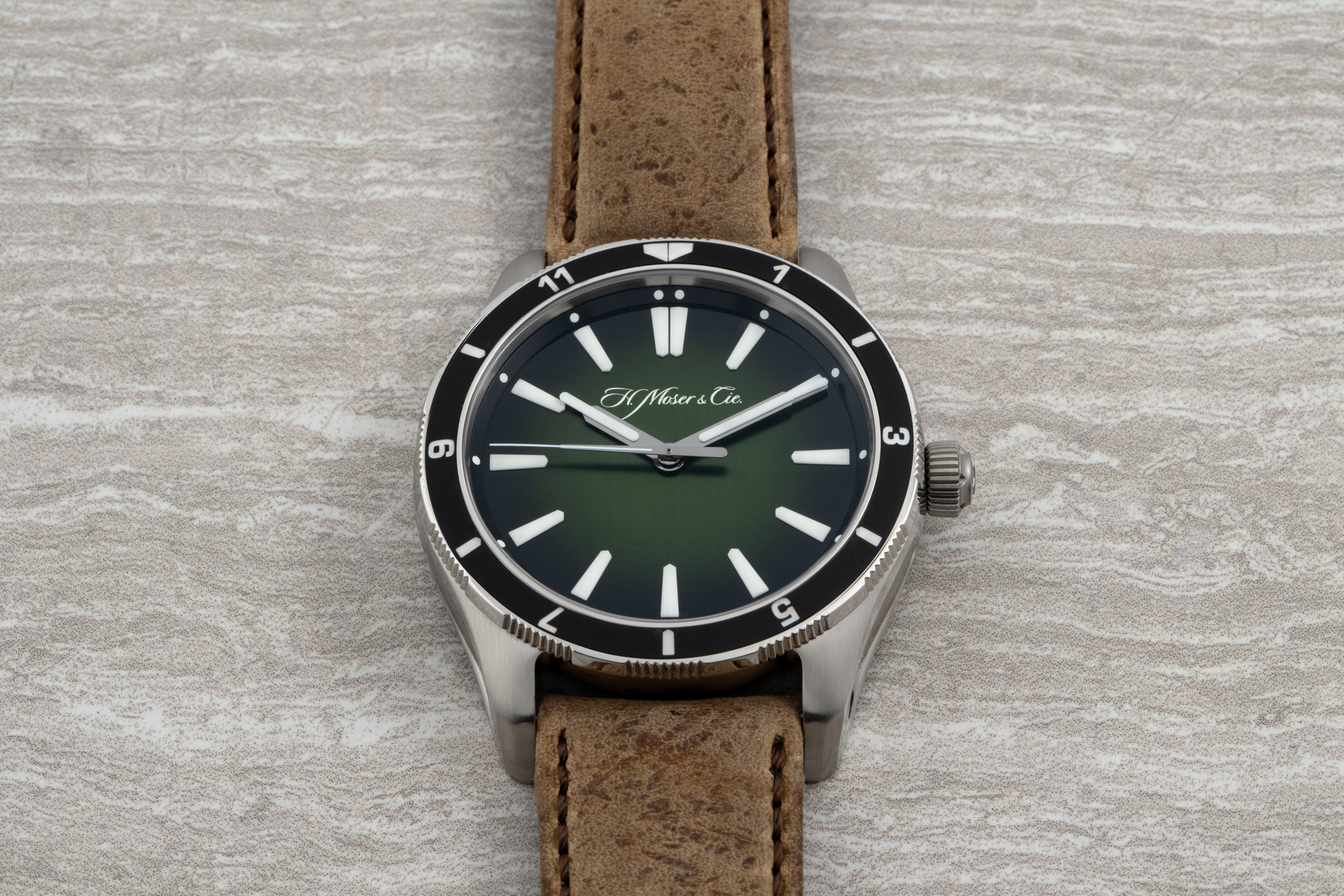 この夏、 H.モーザー は、1930年代の機関車のデザインにインスパイアされたステンレススティール製の一体型ブレスレットのタイムピース「ストリームライナー・センターセコンド」を発表した(コールは記事の中で、このデザインについての歴史的な視点をいくつか紹介している)。この時計の目立った特徴の一つは、グリーンのフュメダイヤルだった。そのグリーンもフュメもこのモデルでカムバックした。今回の新作はカリフォルニア州で設立された時計愛好家の世界的なコミュニティであるコレクティブ・ ホロロジーとのコラボレーションによるものだ。限定モデルの「H.モーザー パイオニア・センターセコンド 回転ベゼル C.02 for コレクティブ」は、双方向のトラベルベゼル、ねじ込み式リューズ、そしてもちろんグリーンの文字盤をもつ。