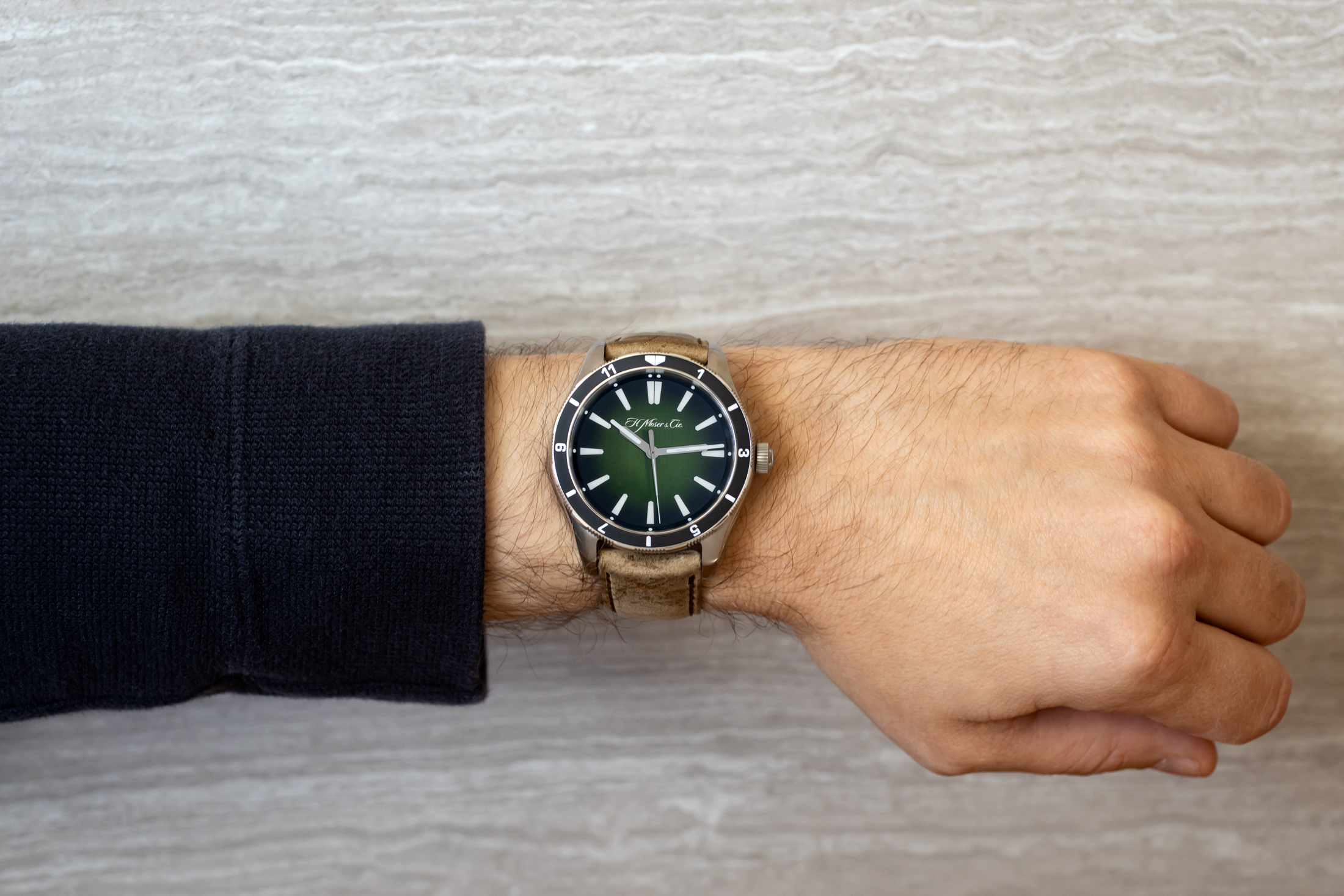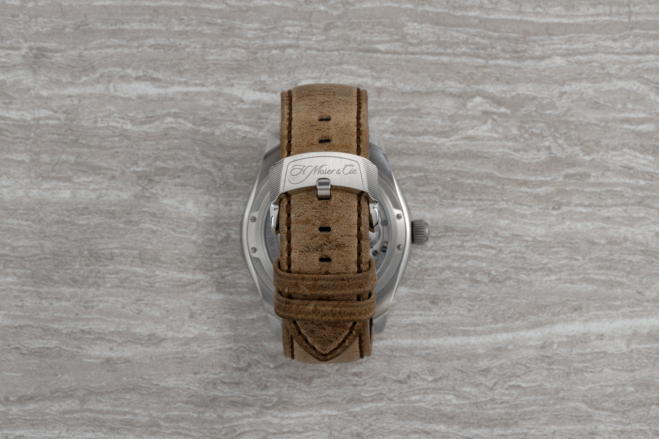 前述したように、このモデルには双方向に回転するトラベルベゼルが採用されている。あなたが第2のタイムゾーンを計時したいなら、マーキング付きの黒いベゼルを回せばいい。時計には、茶色のクードゥーレザーストラップまたはスティールブレスレットのいずれかが付く。ブレスレットには、H.モーザーの紋章がエングレーヴィングされたツイントリガーのデプロワイヤントクラスプが採用されている。ストラップには、H.モーザーの紋章が刻印されたバックルが付いている。