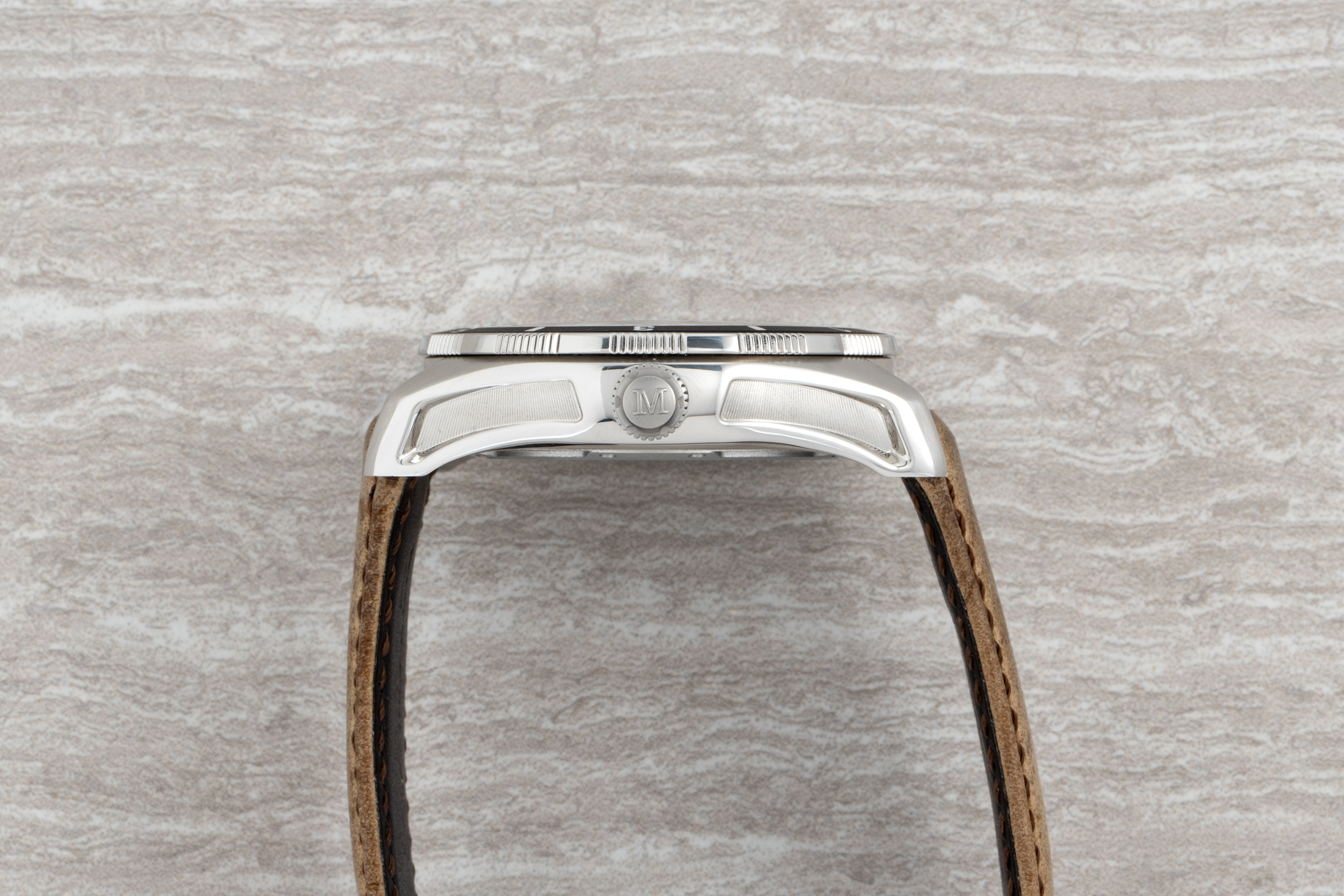ケース形状は、興味深い曲線と面取りによって、なかなかスポーティに見える。リューズガードの無い大きなねじ込み式リューズには「M」のエングレービングが施されている。全体的に、この時計には明らかなツールウォッチの美しさがあるように思う。それはスティール製のブレスレットによって、また、クードゥーストラップのこなれた外観によっても強調される。このコレクティブ限定C.02にはHMC 200自動巻きキャリバーが搭載されており、トランスパレントケースバックから鑑賞できる。冒険にインスパイアされたデザインモチーフ(およびねじ込み式リューズ)のイメージの通り、120mの防水性も備えている。